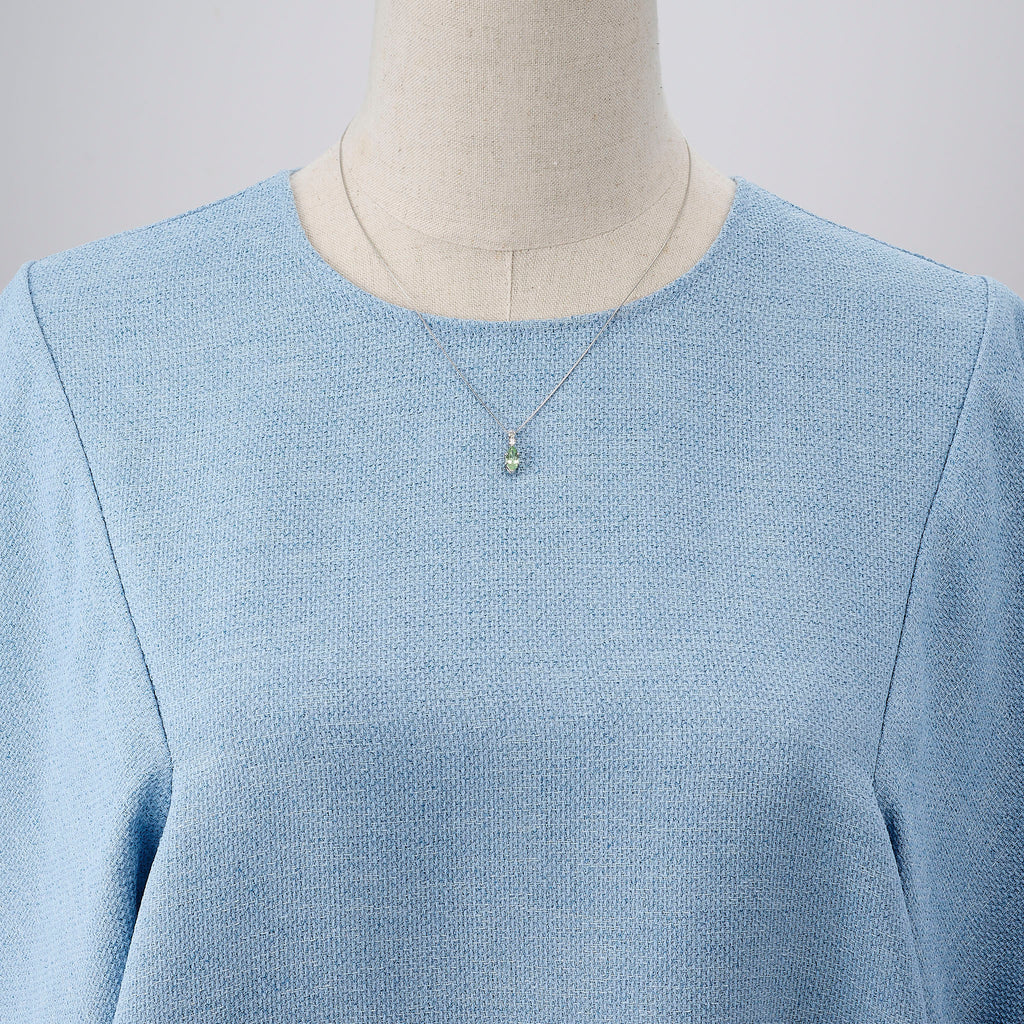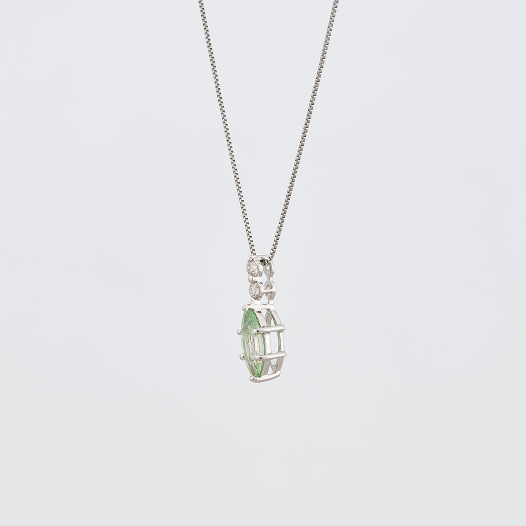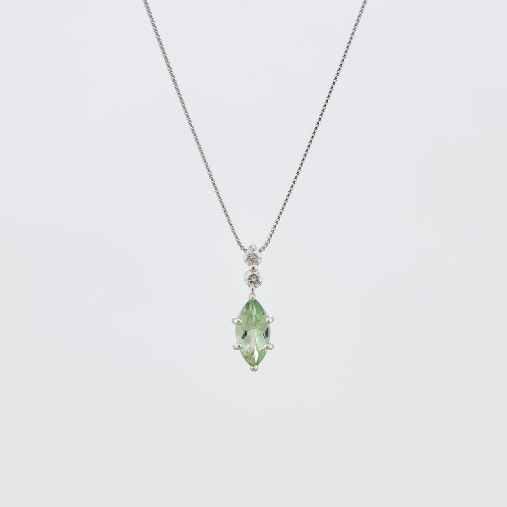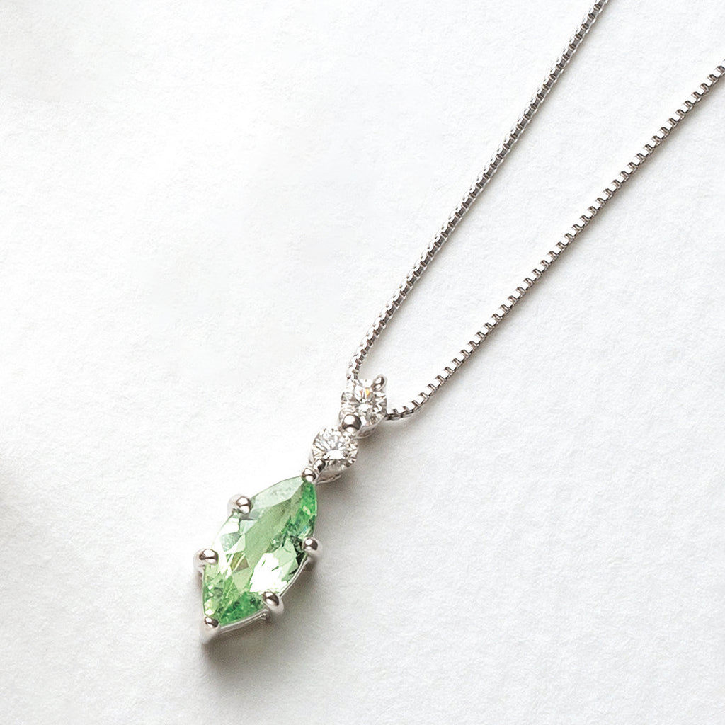 赤色以外にもオレンジ色や緑色など実は様々な色があるガーネット。爽やかなパステルカラーが美しいグリーンガーネットをプラチナ製のネックレスにセットしました。エレガントな印象のマーキスカットを活かしたシンプルなデザインです。