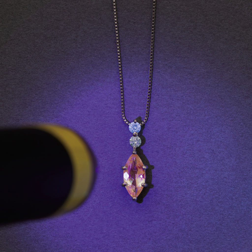 パッと見の派手さはありませんが、時々ひとりでUVライトを照射してこの色変わりを見て密かに楽しむ…。そんなジュエリーの楽しみ方も良いのではないでしょうか。
