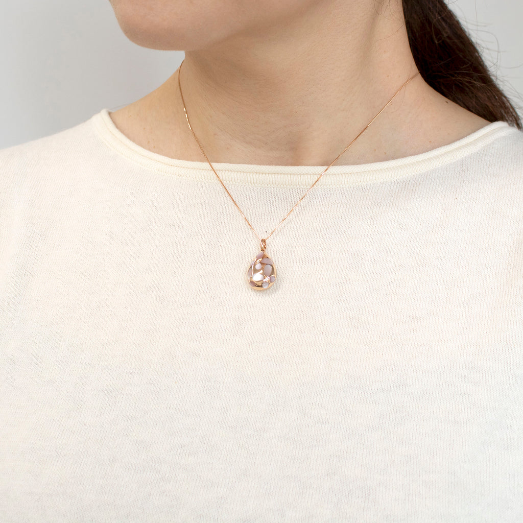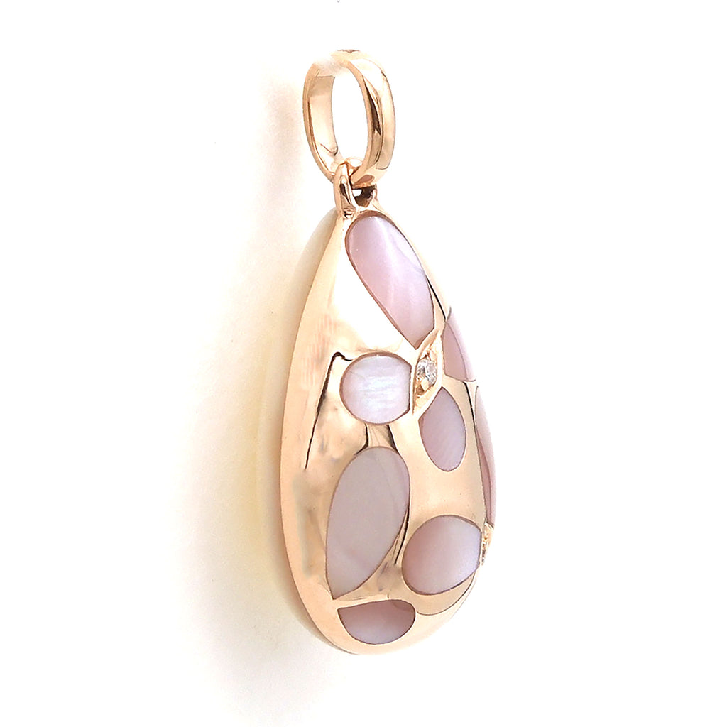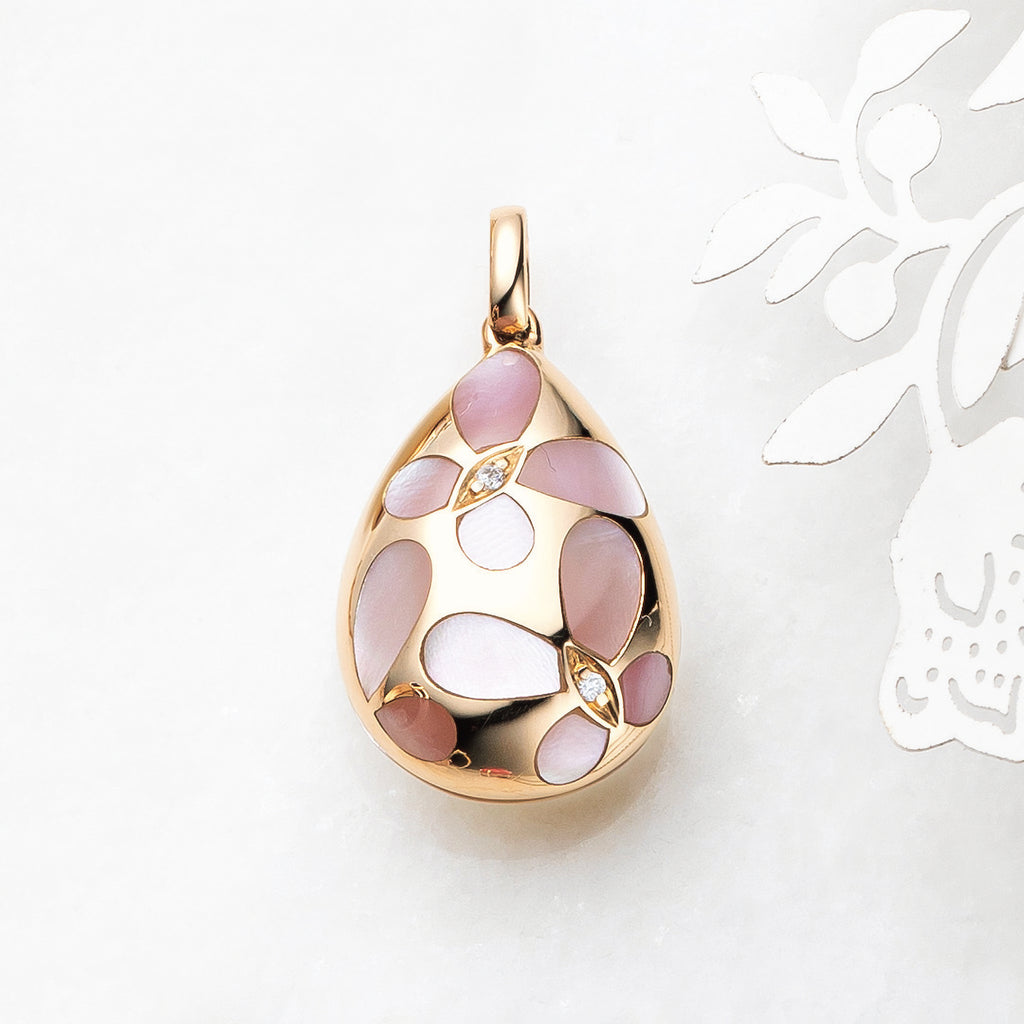 ぷっくりとした雫形が可愛らしいシェルのペンダントトップに蝶のモチーフを散りばめました。
