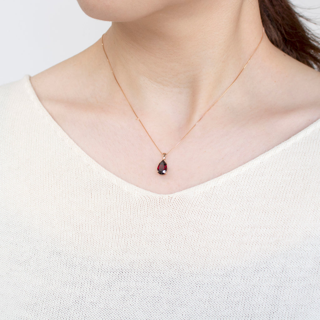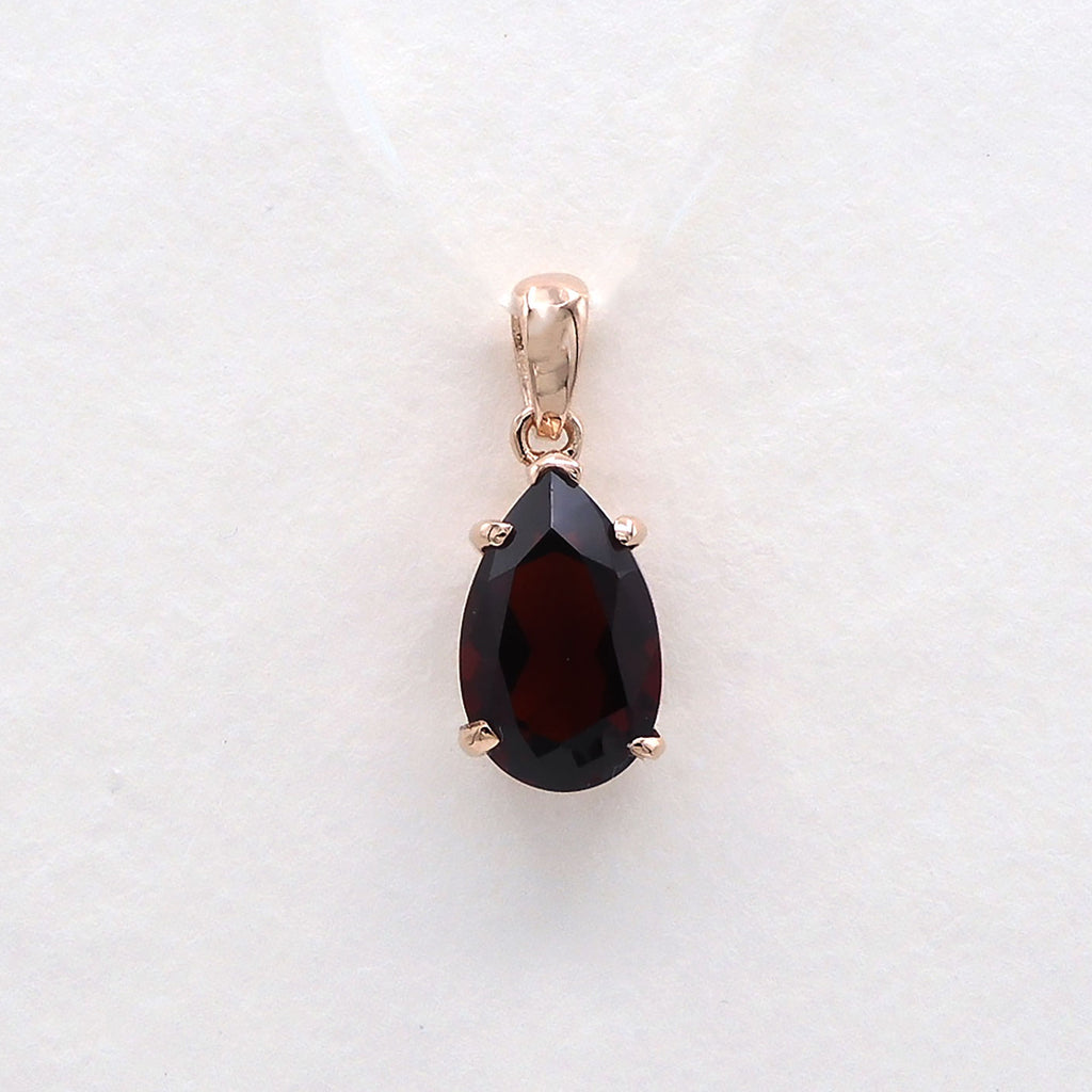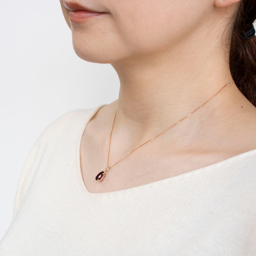 大粒1.8ctのペアシェイプのガーネットを相性抜群の18金ピンクゴールド製の枠にセット。メレダイヤなどの余計な装飾のないデザインですが、大きさがあるので胸元でしっかりと存在感を放ちます。