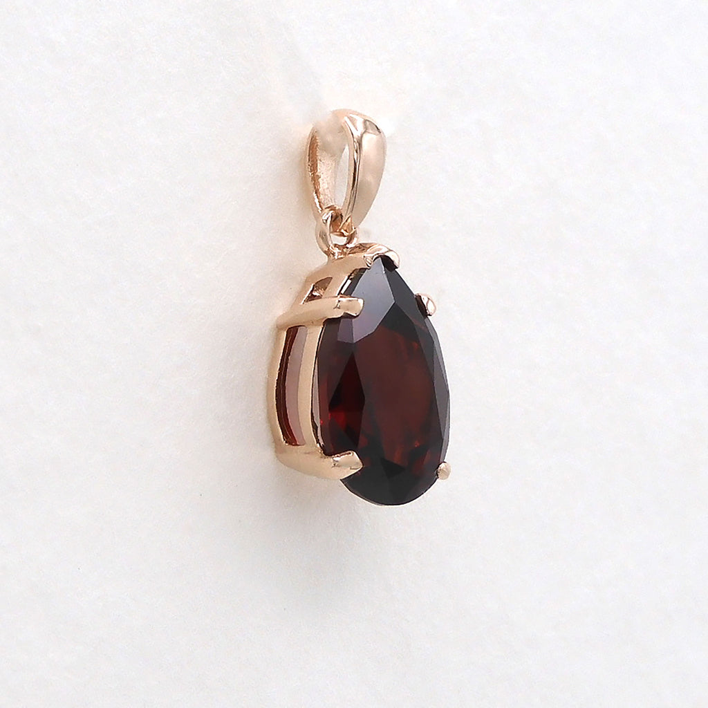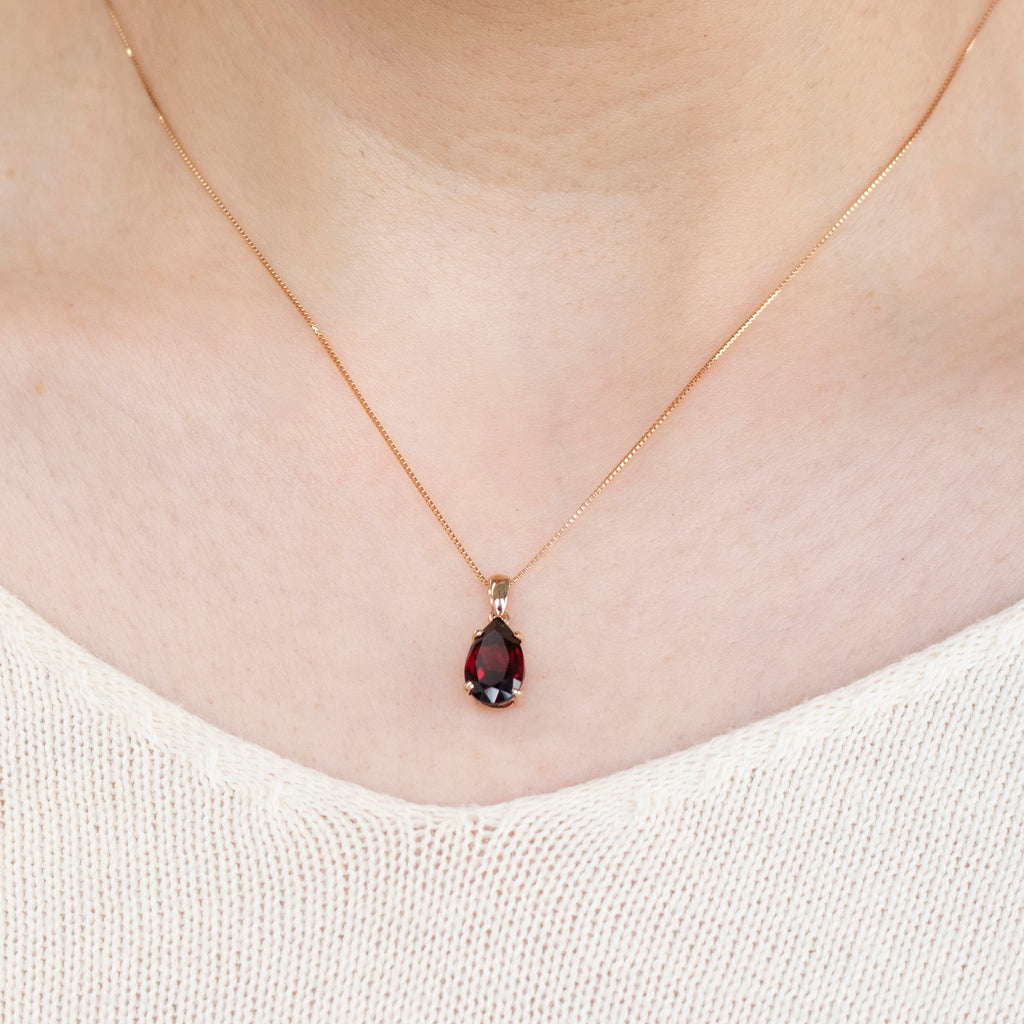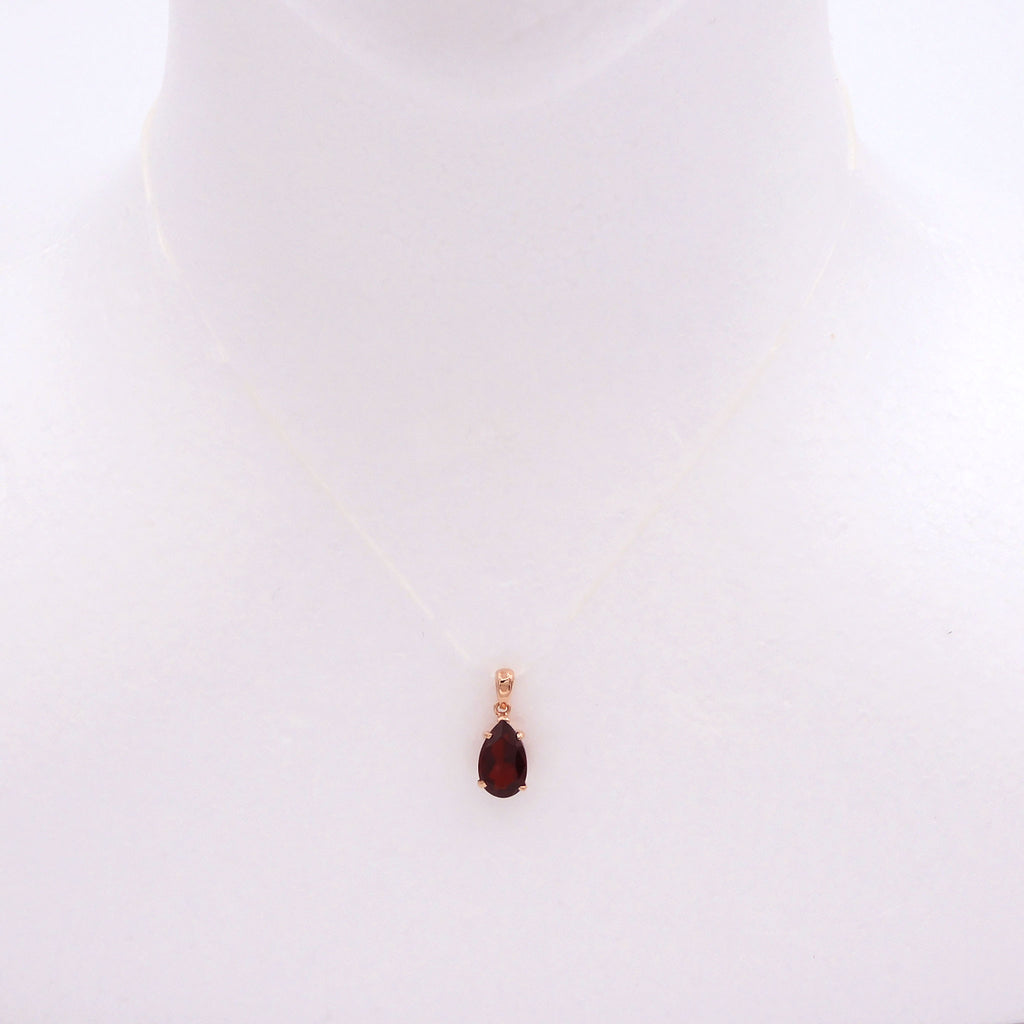 大粒1.8ctのペアシェイプのガーネットを相性抜群の18金ピンクゴールド製の枠にセット。メレダイヤなどの余計な装飾のないデザインですが、大きさがあるので胸元でしっかりと存在感を放ちます。