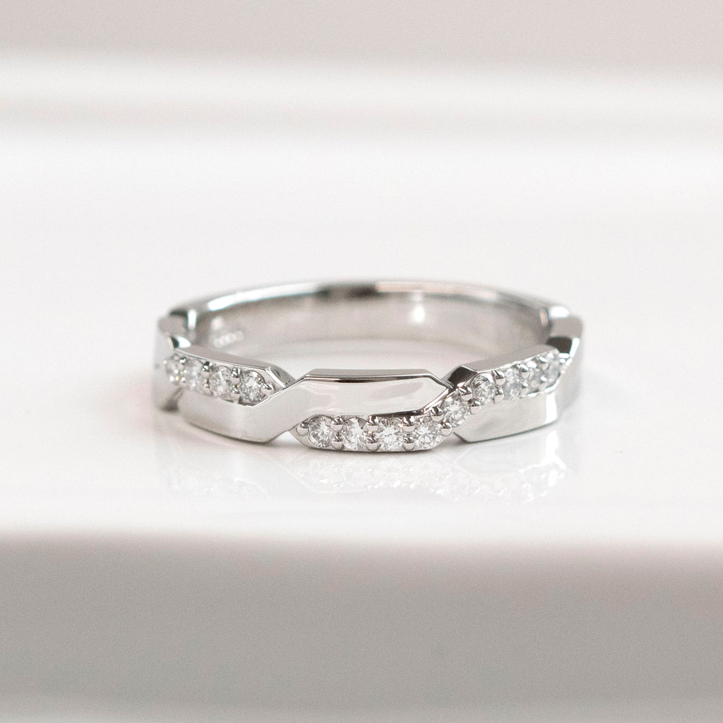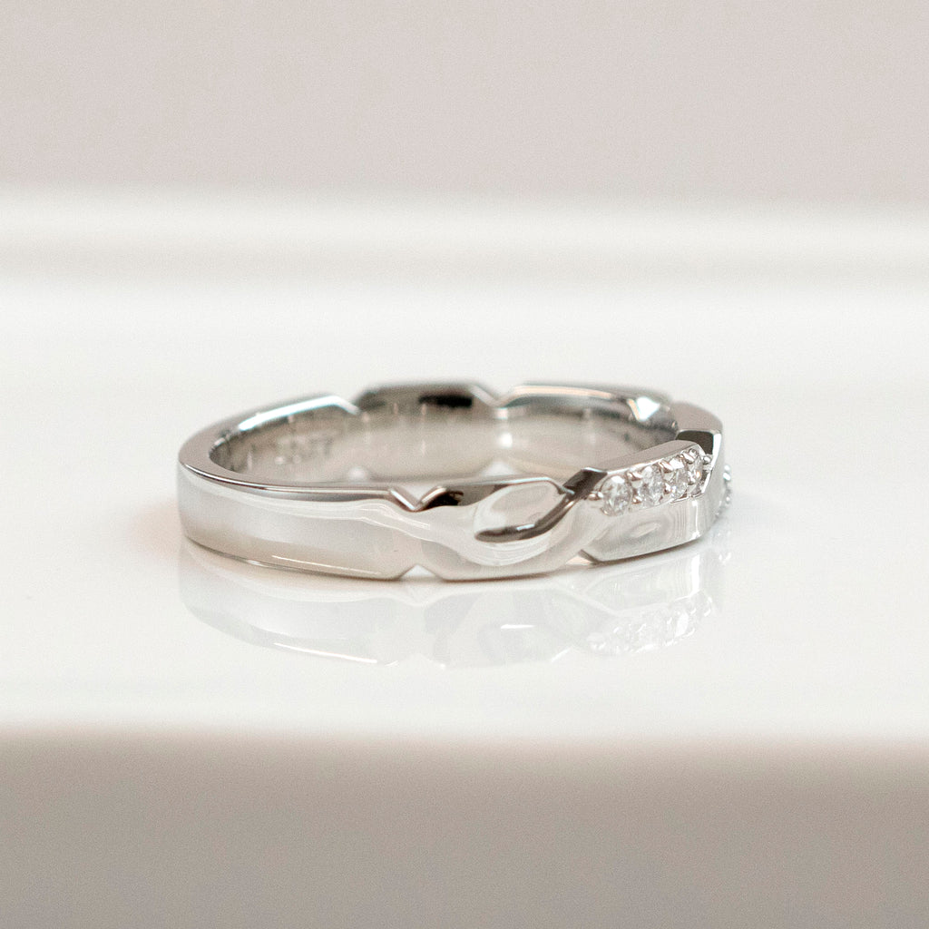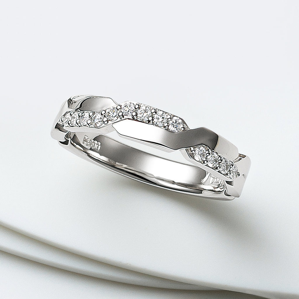 ダイヤとプラチナのラインが絡み合うモダンなリング。