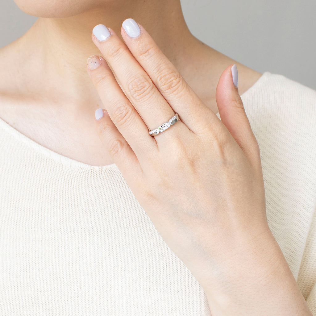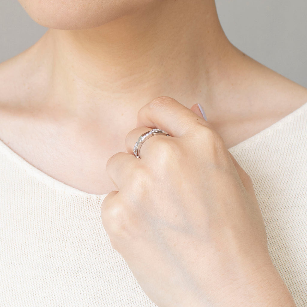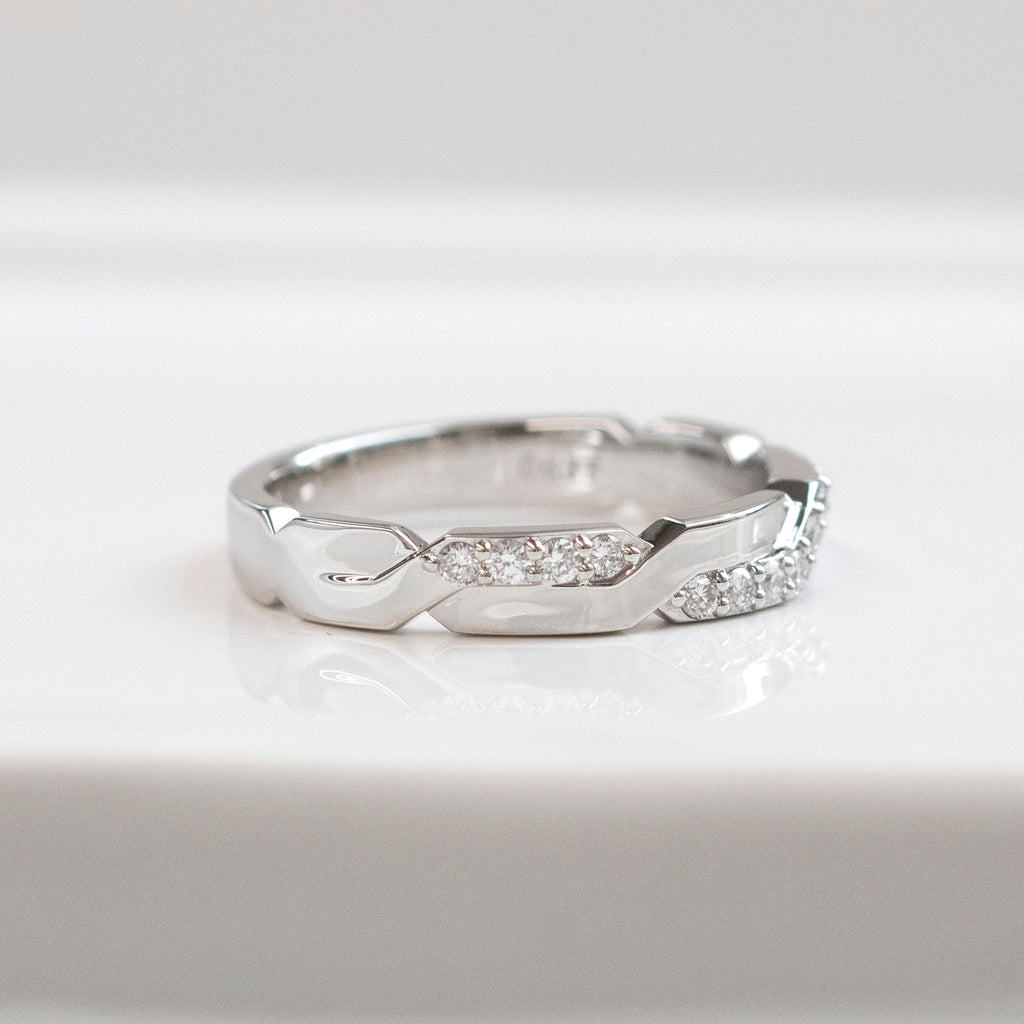 ダイヤとプラチナのラインが絡み合うモダンなリング。