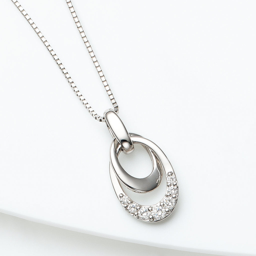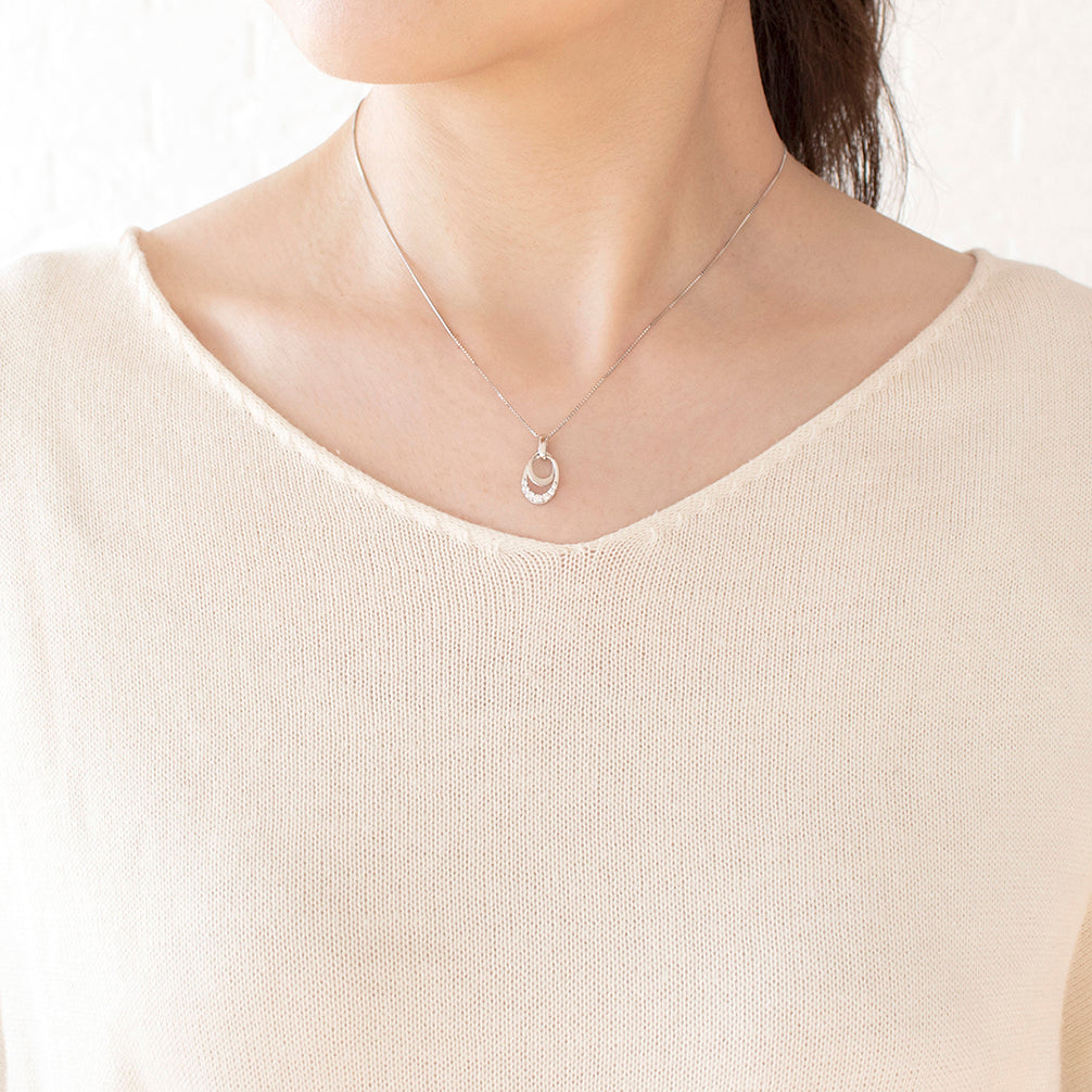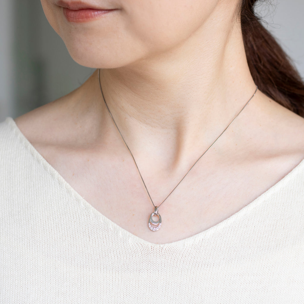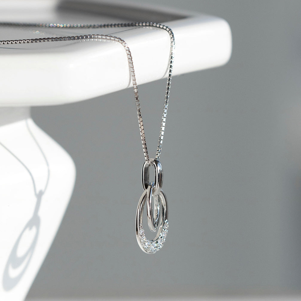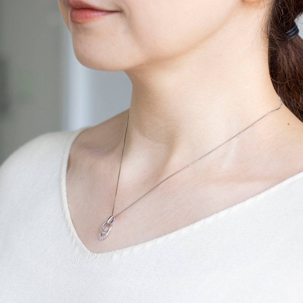 大小の楕円が立体的に交差する凝ったデザインのネックレス。楕円は固定ではなく少し動くタイプとなっております。