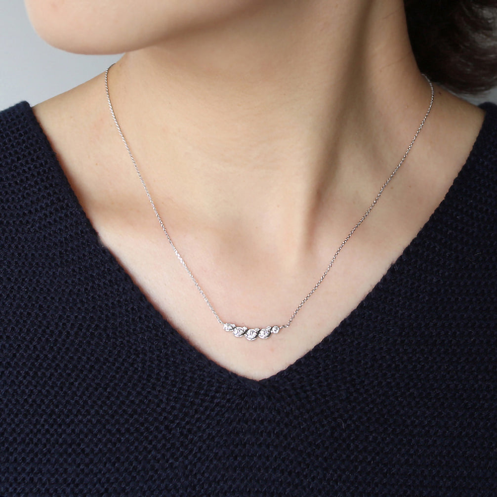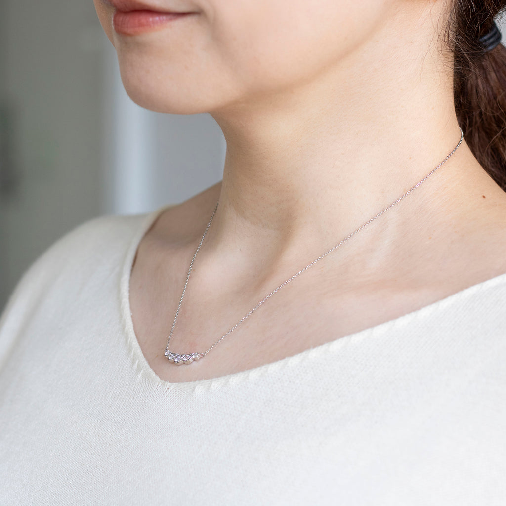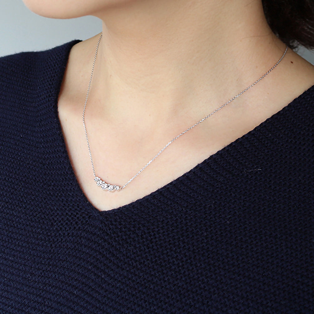 人気の横長デザインに一捻り加えたデザイン性の高いネックレスです。メレダイヤも華やかさを添えて、胸元に優雅な印象を与えてくれます。