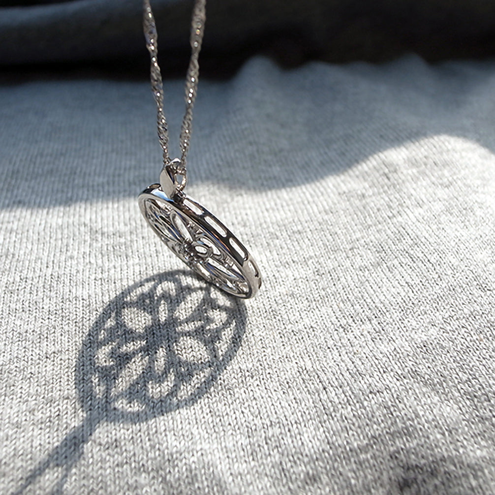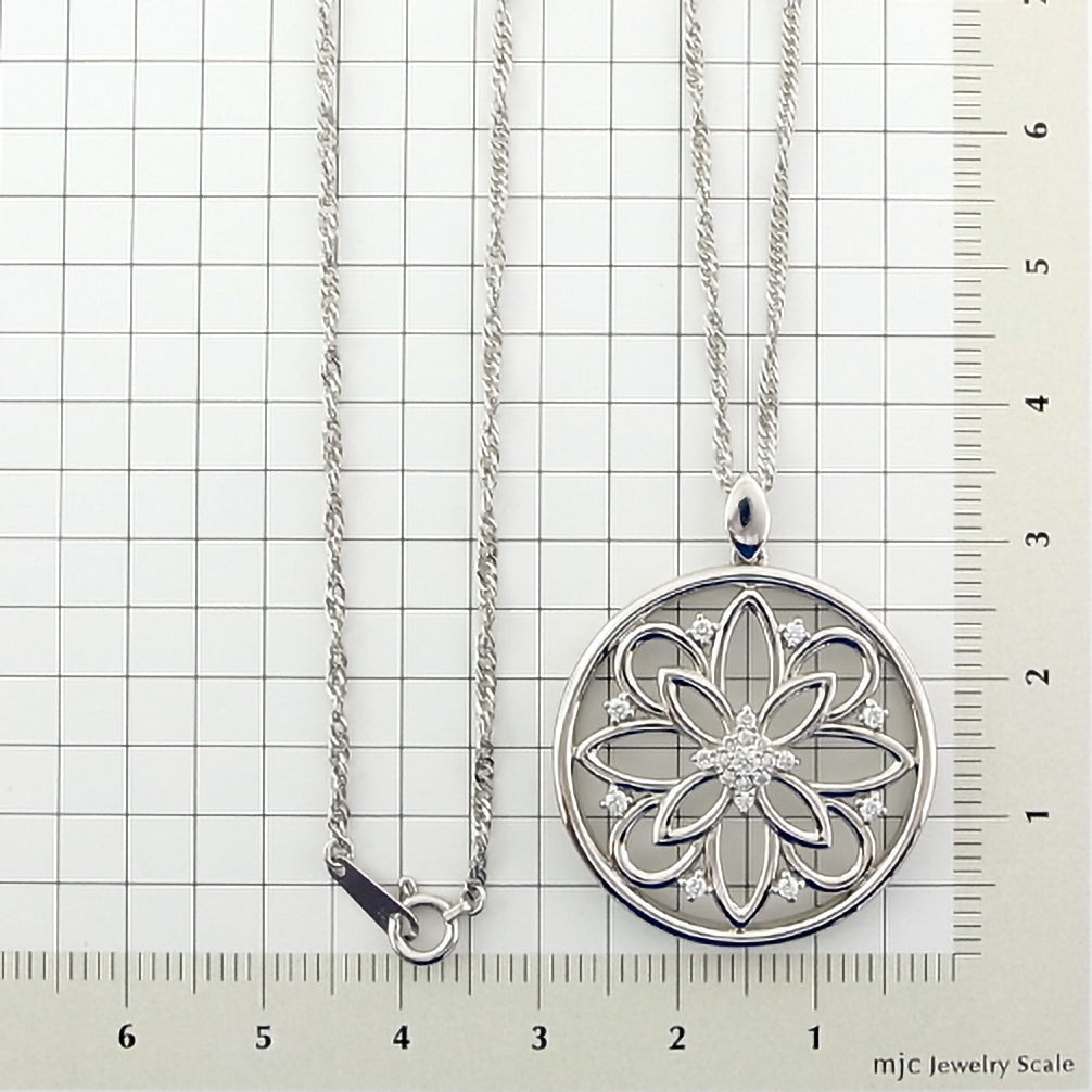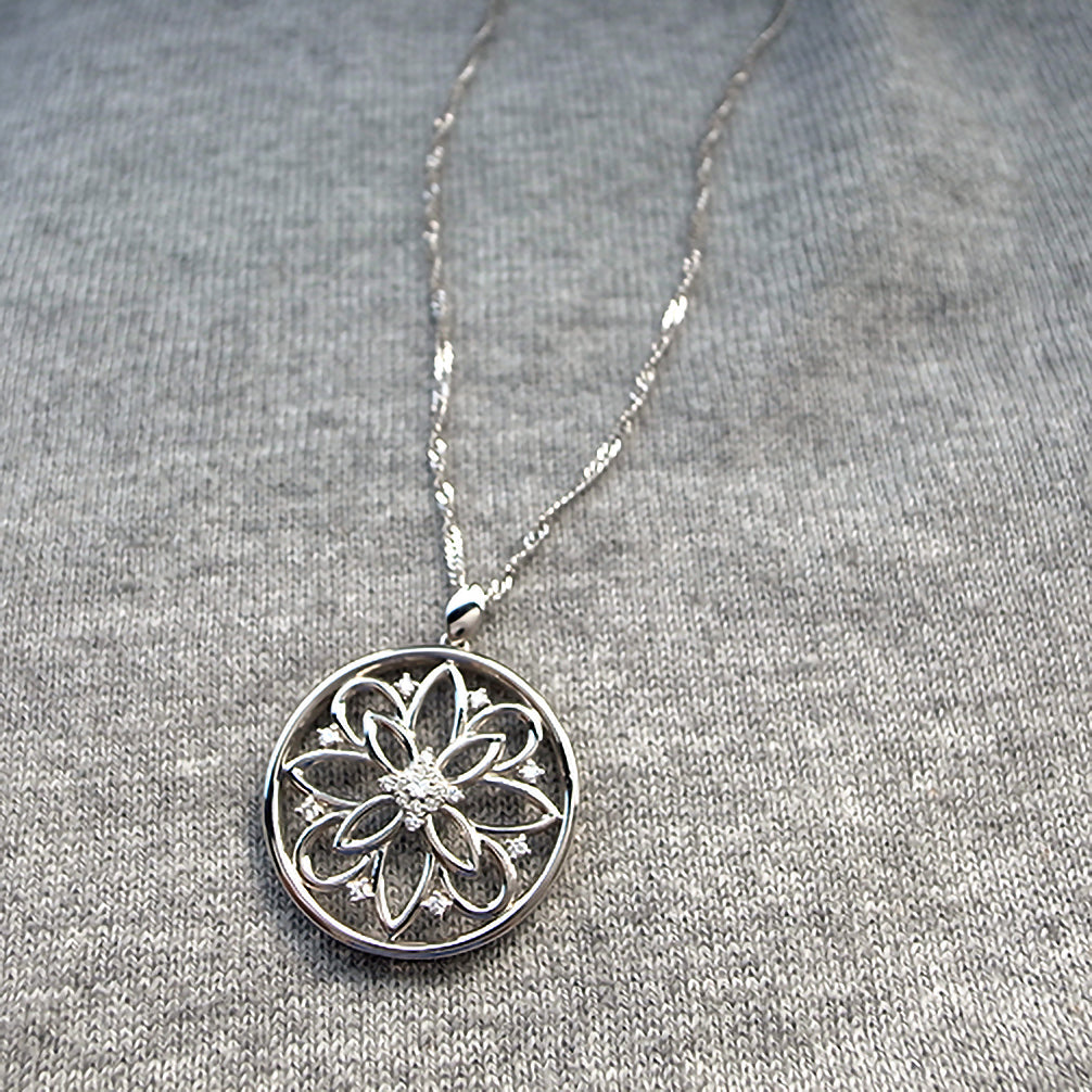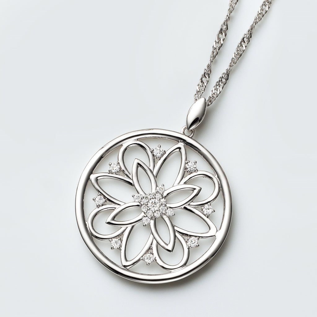 大きなサークルモチーフにお花をデザインしました。長さ60cmでゆったり着けられます。
