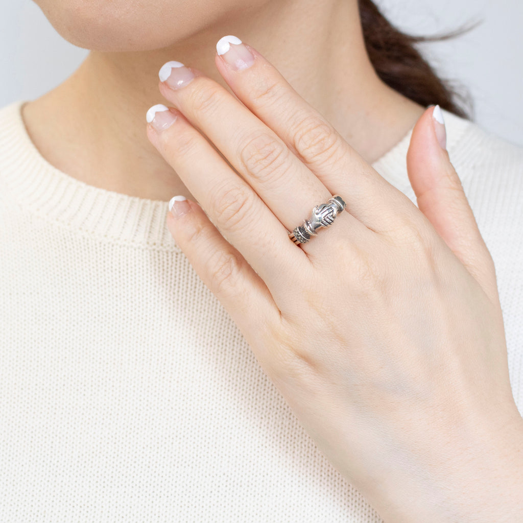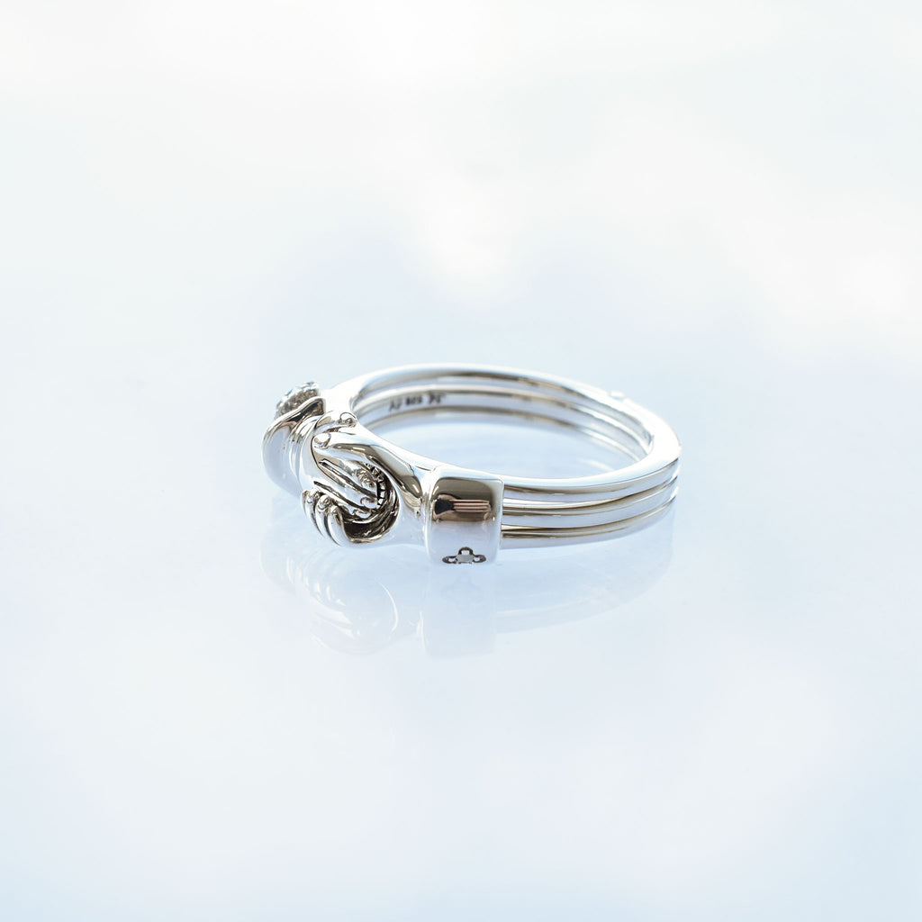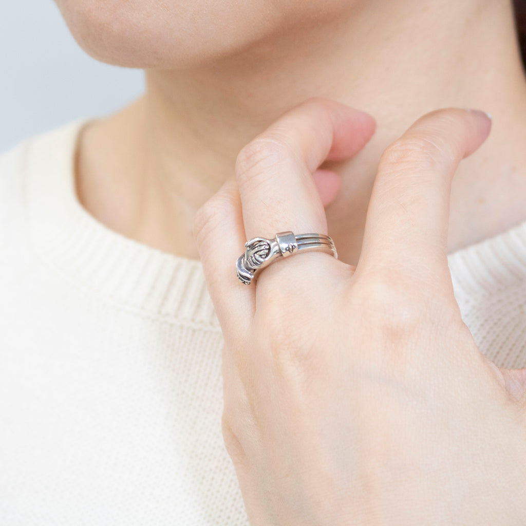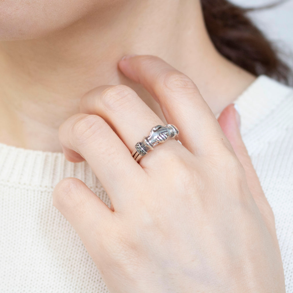 アンティークジュエリーでよく見られる「フェデリング」と呼ばれるデザインです。「忠実の指輪」とも呼ばれていて、合意・誓約を表す二つの手が繋ぎ合ったデザインです。