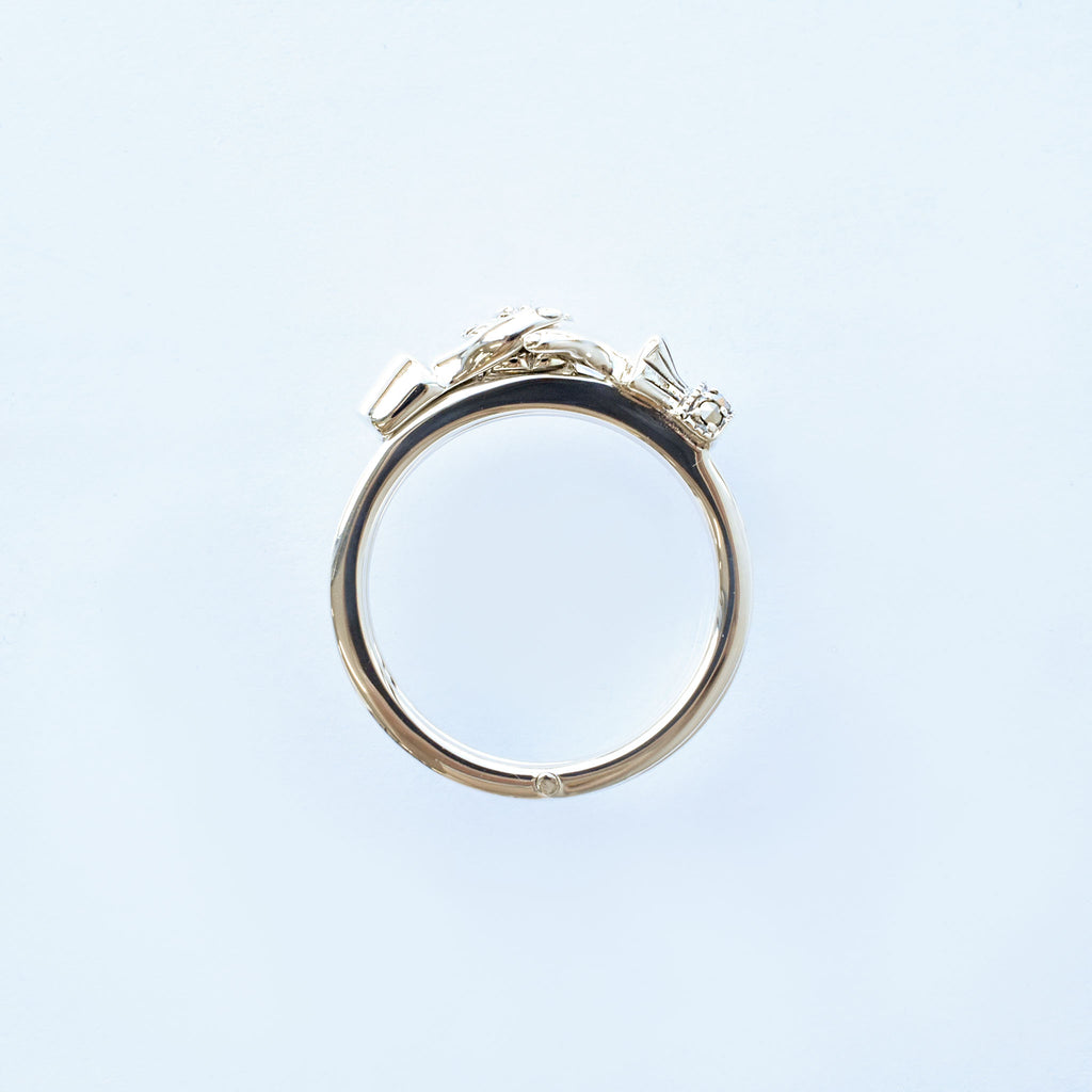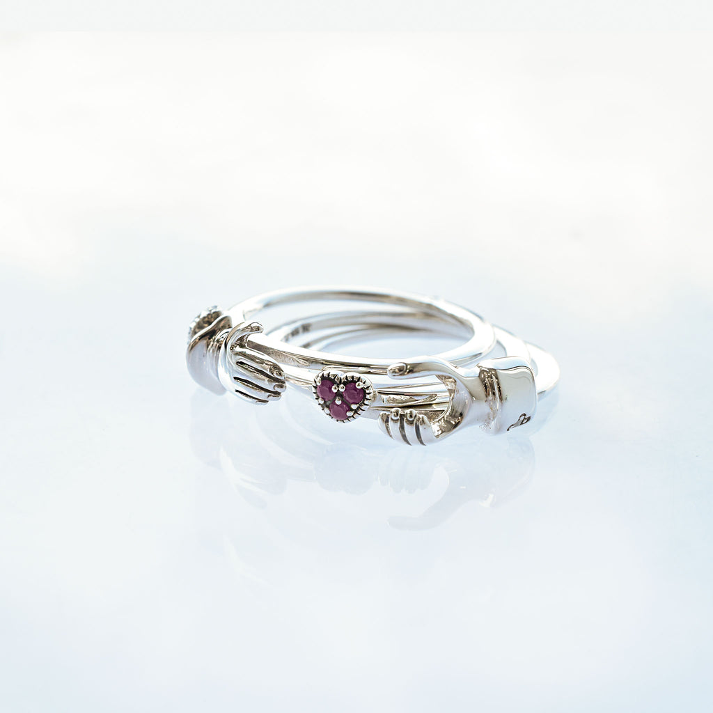 男女が手を繋いだモチーフを開くと中から赤いルビーを留めた小さなハートが現れるという仕掛けがロマンティックなリングです。