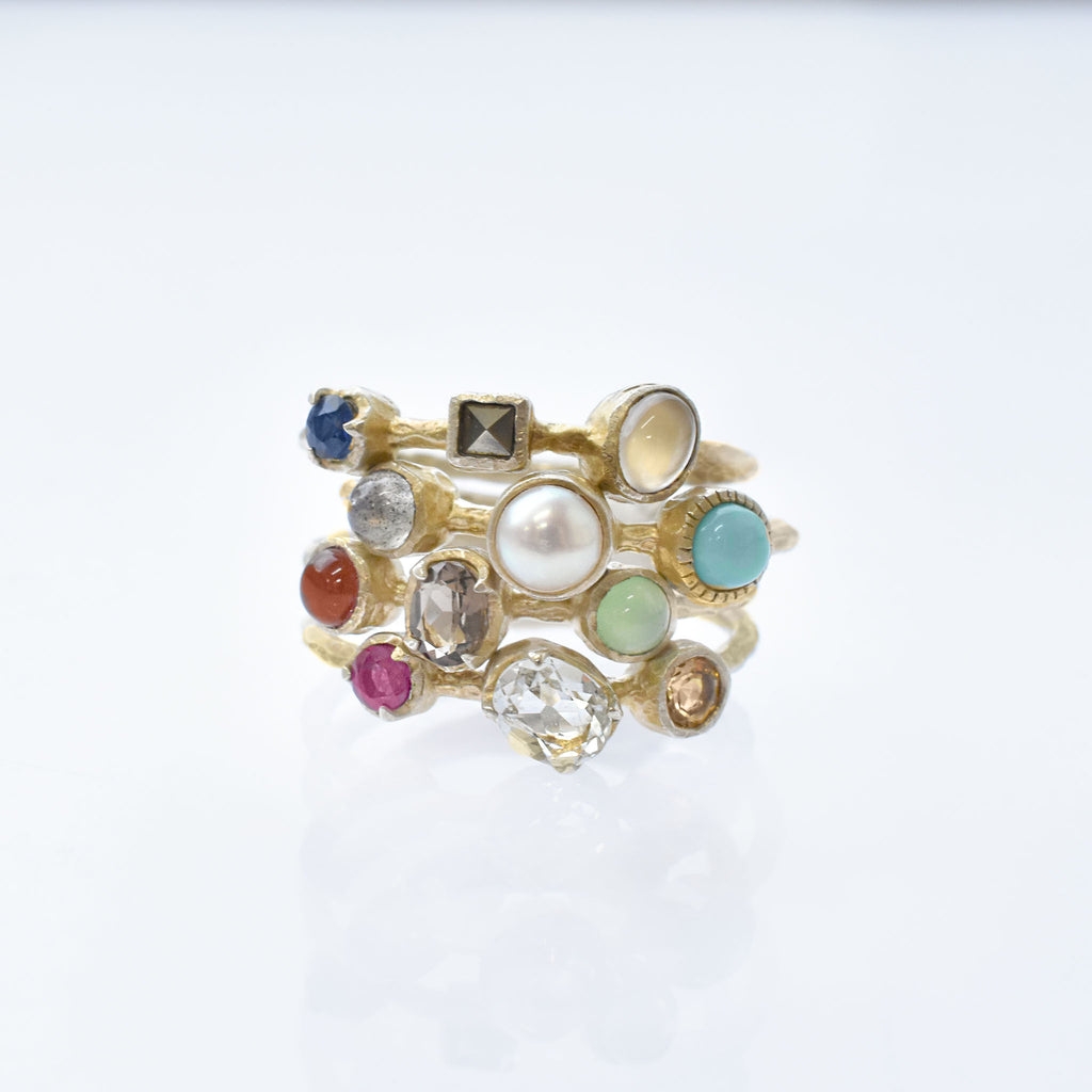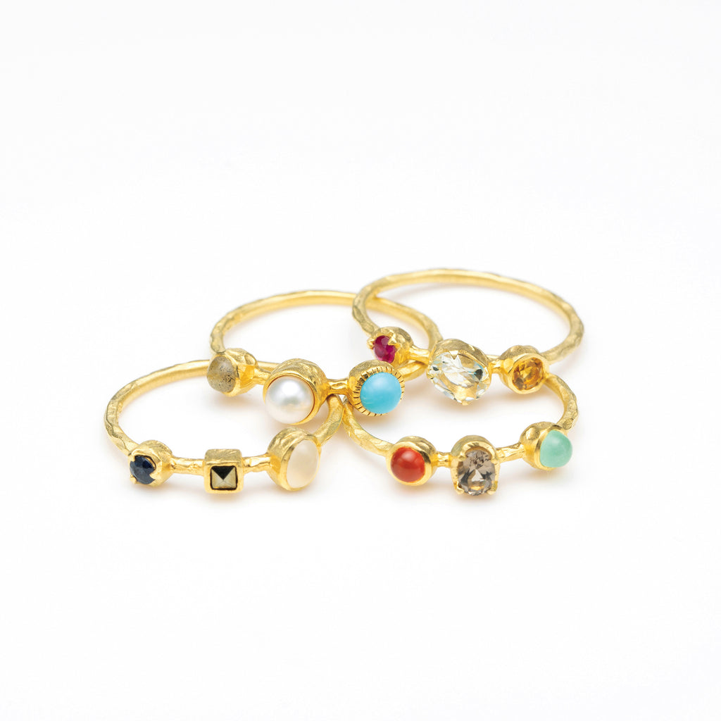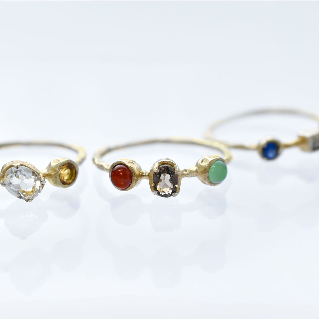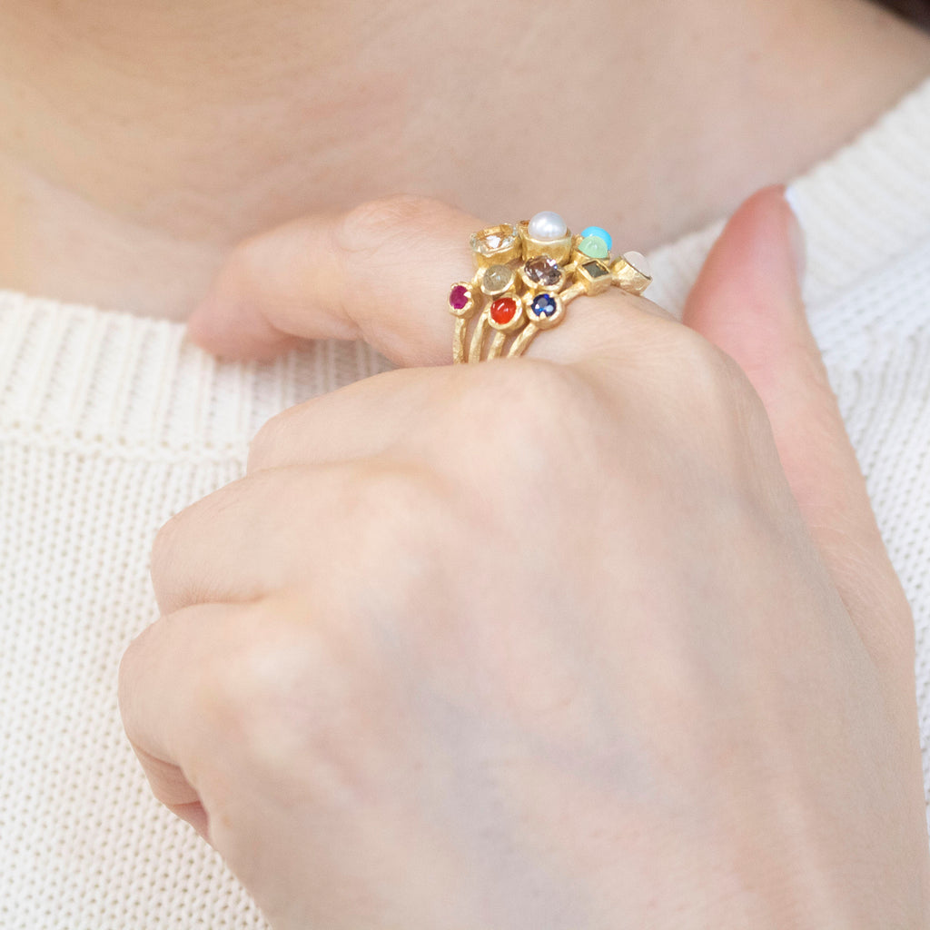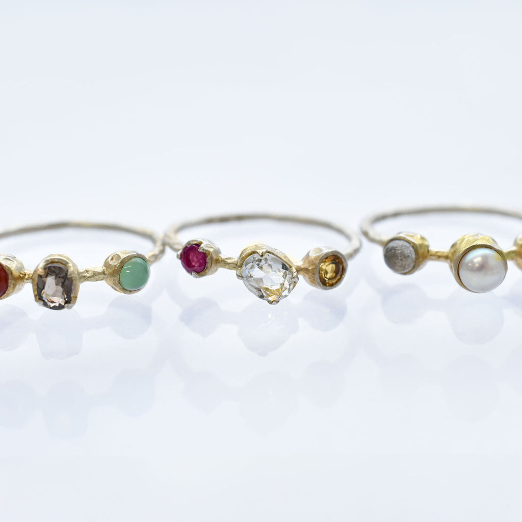 春のリングは、ルビー、グリーンクォーツ、シトリン。夏のリングは、ラブラドライト、淡水パール、トルコ石。秋のリングは、カーネリアン、スモーキークォーツ、クリソプレーズ。冬のリングはサファイア、マルカジット、ムーンストーン。をそれぞれ使用しています。