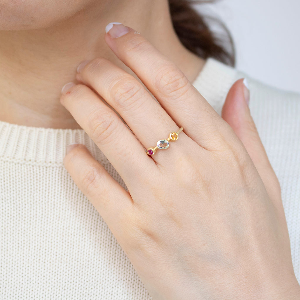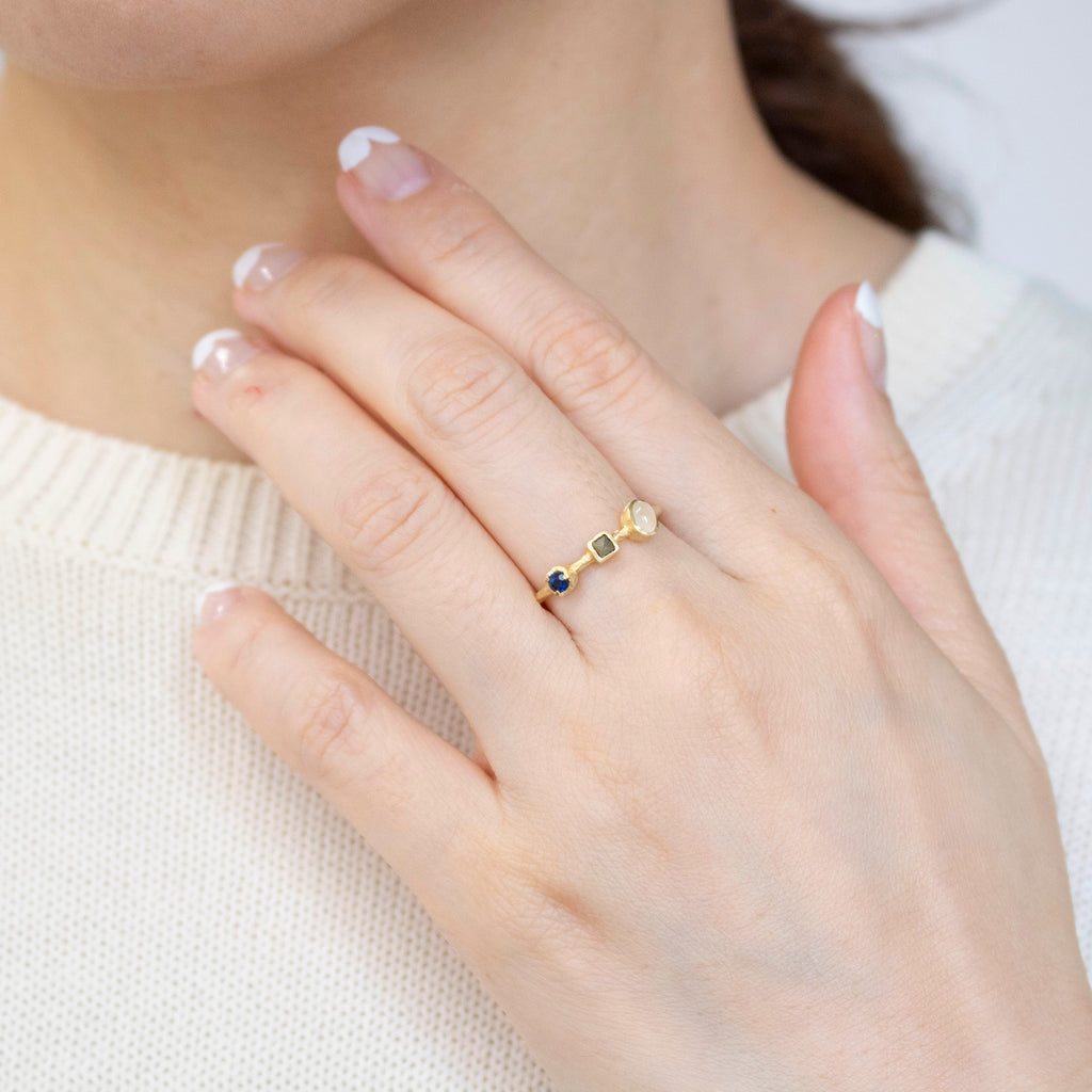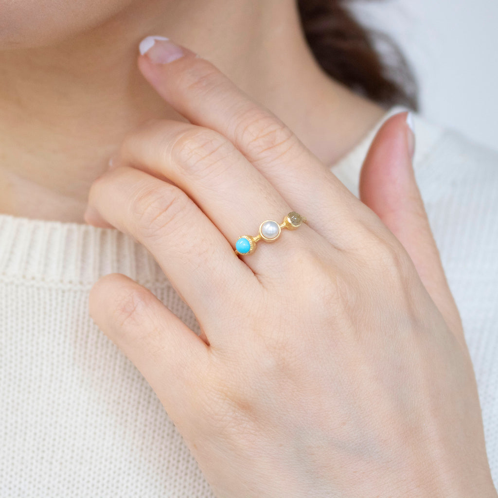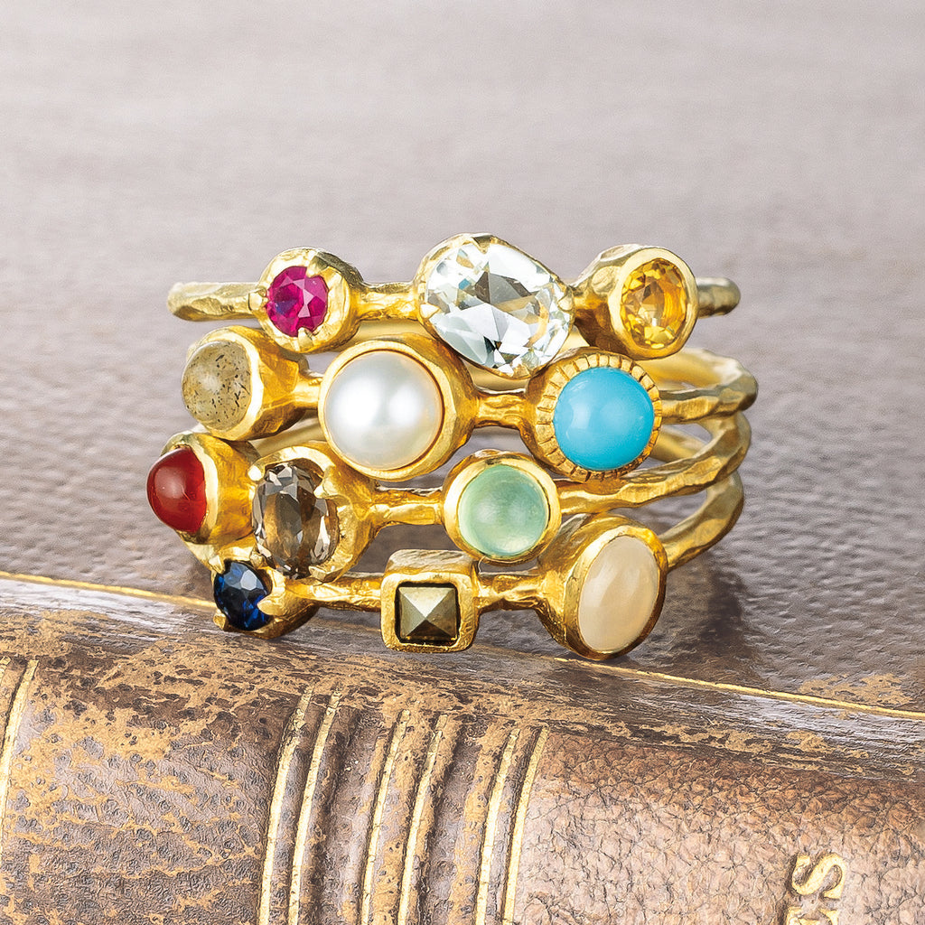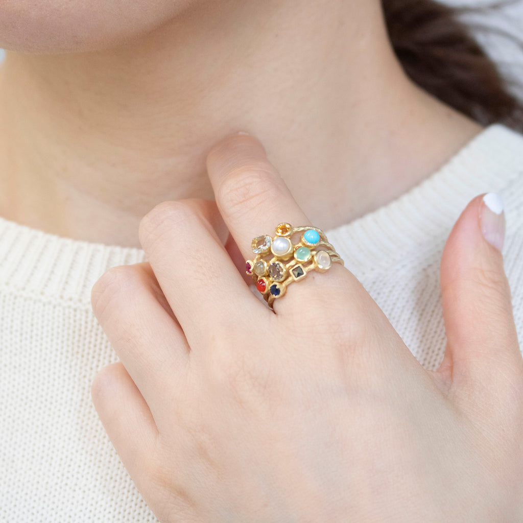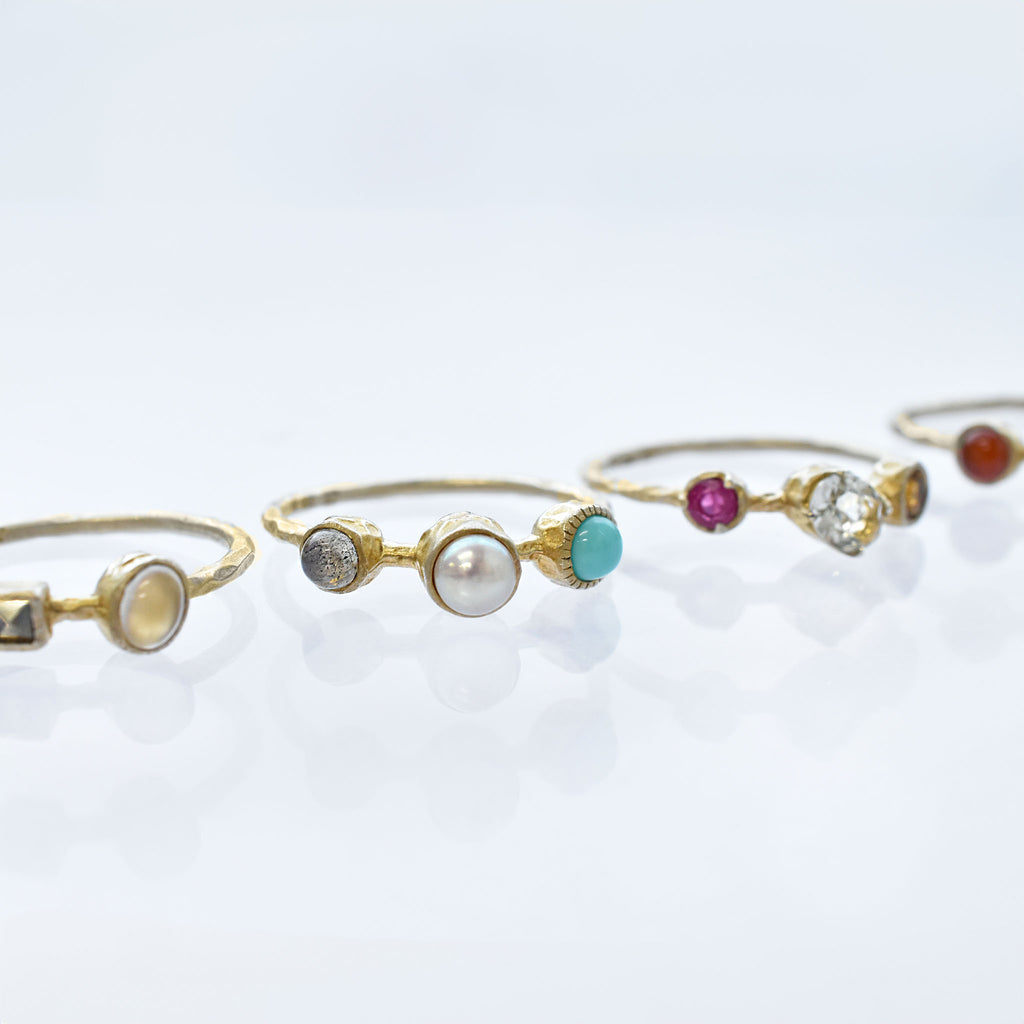 春のリングは、ルビー、グリーンクォーツ、シトリン。夏のリングは、ラブラドライト、淡水パール、トルコ石。秋のリングは、カーネリアン、スモーキークォーツ、クリソプレーズ。冬のリングはサファイア、マルカジット、ムーンストーン。をそれぞれ使用しています。