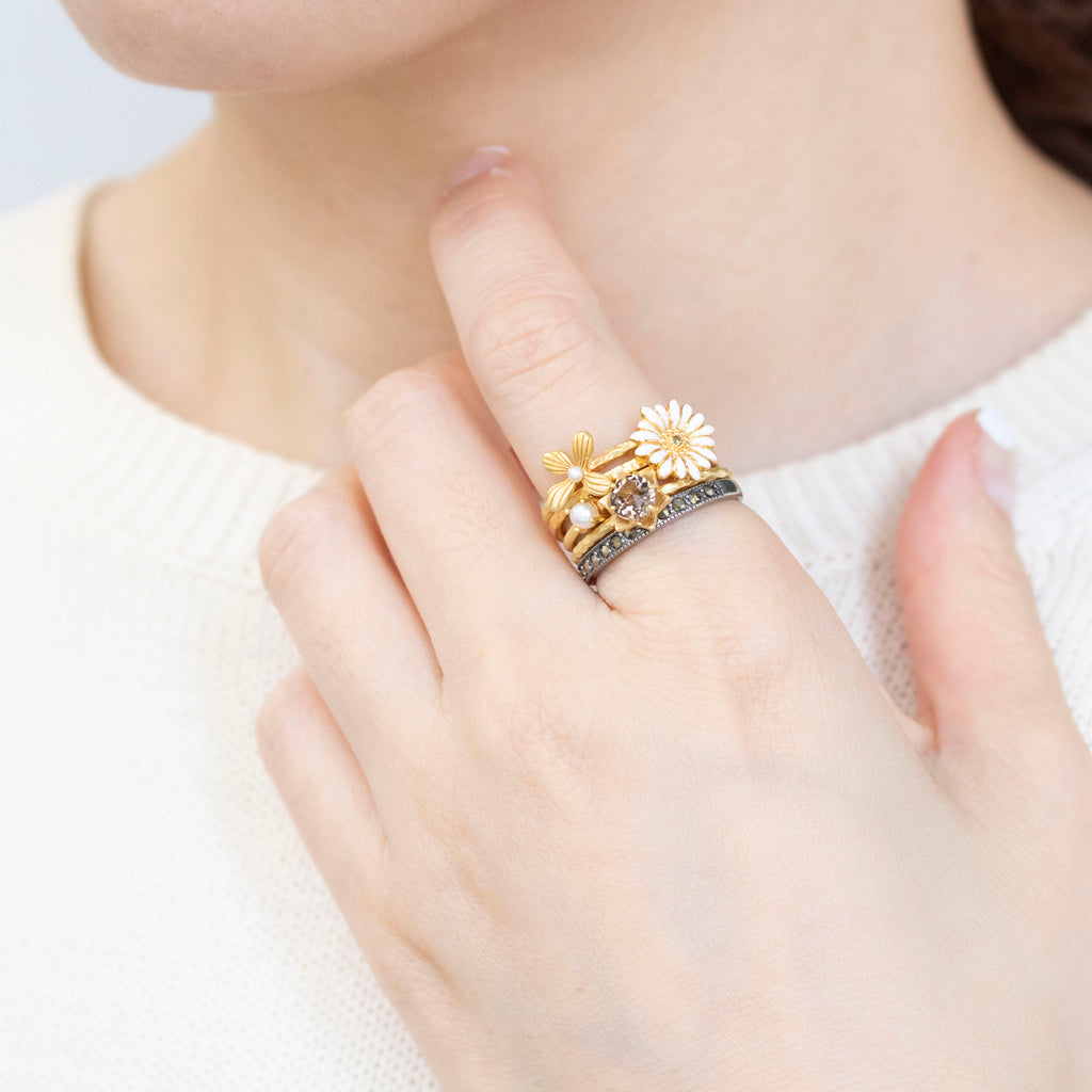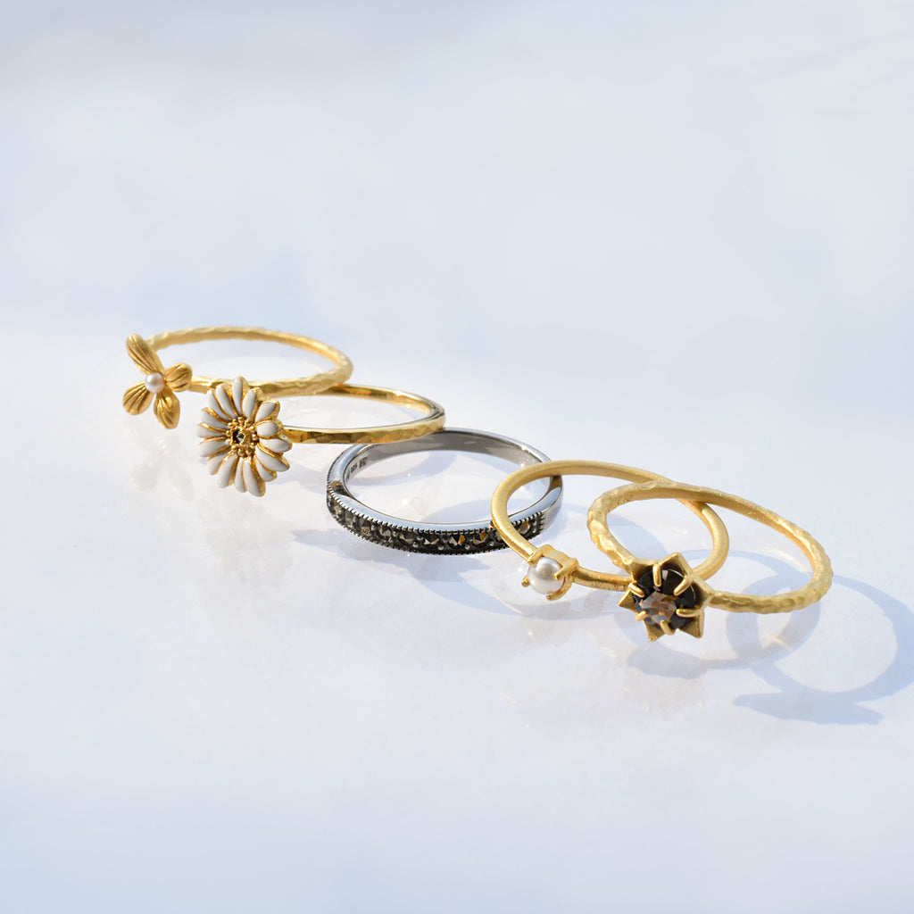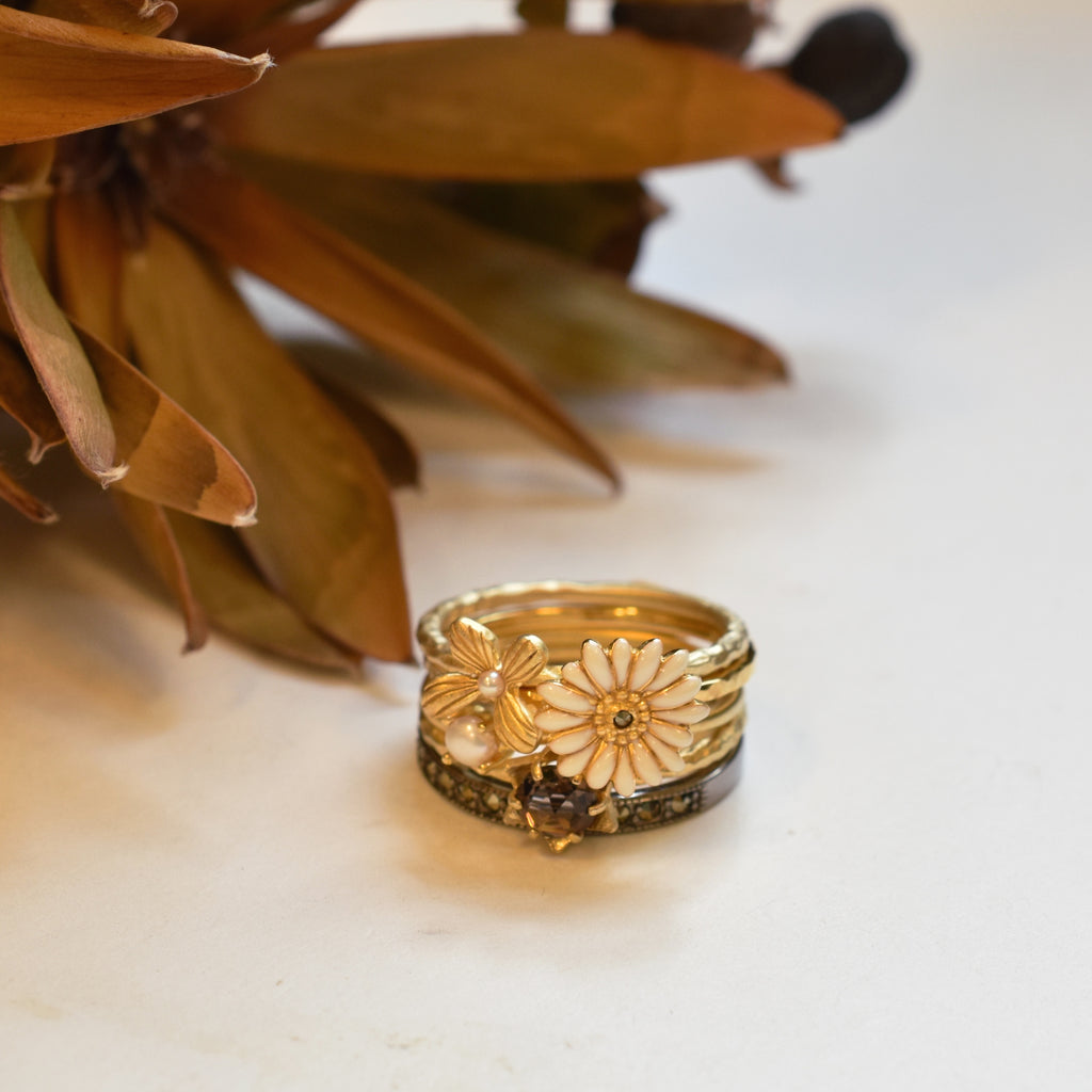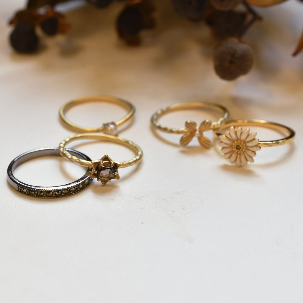 小さな淡水パールを留めた開きかけの花のリング、エナメルで仕上げたマーガレットの花のリング、シンプルに淡水パールを1珠留めたリング、ローズカットのスモーキークォーツを固いつぼみに見立てたリング、キラキラと輝くマルカジットを留めたハーフエタニティリング、5本をセットにしました。