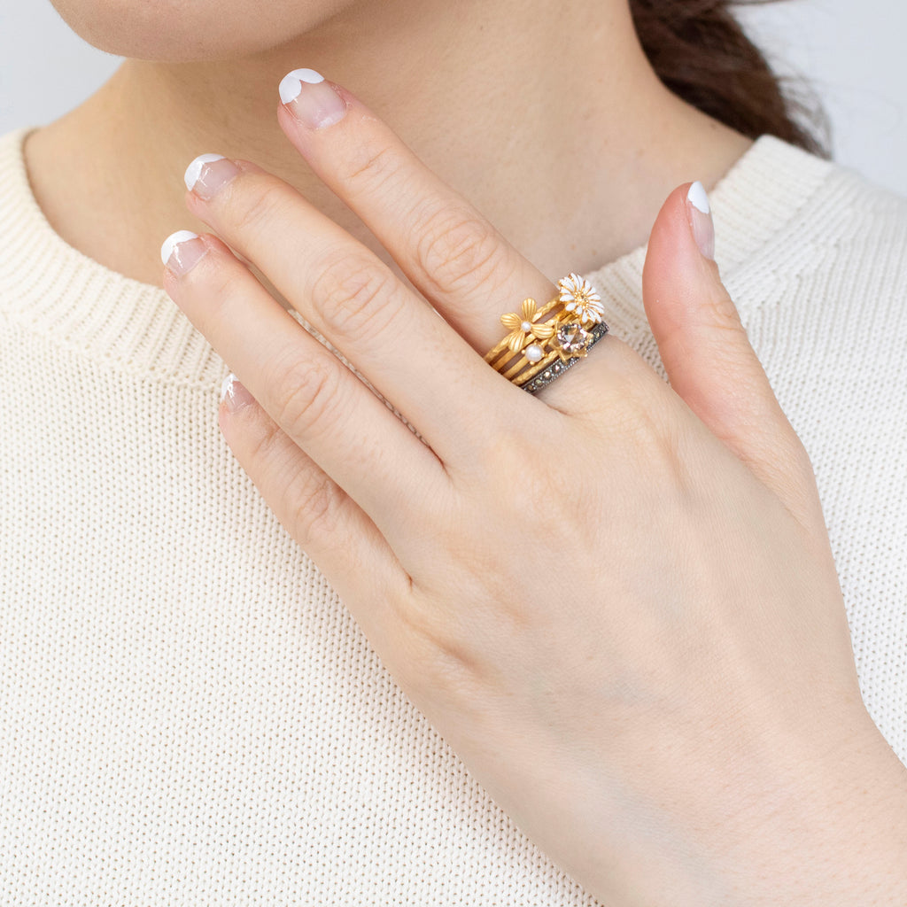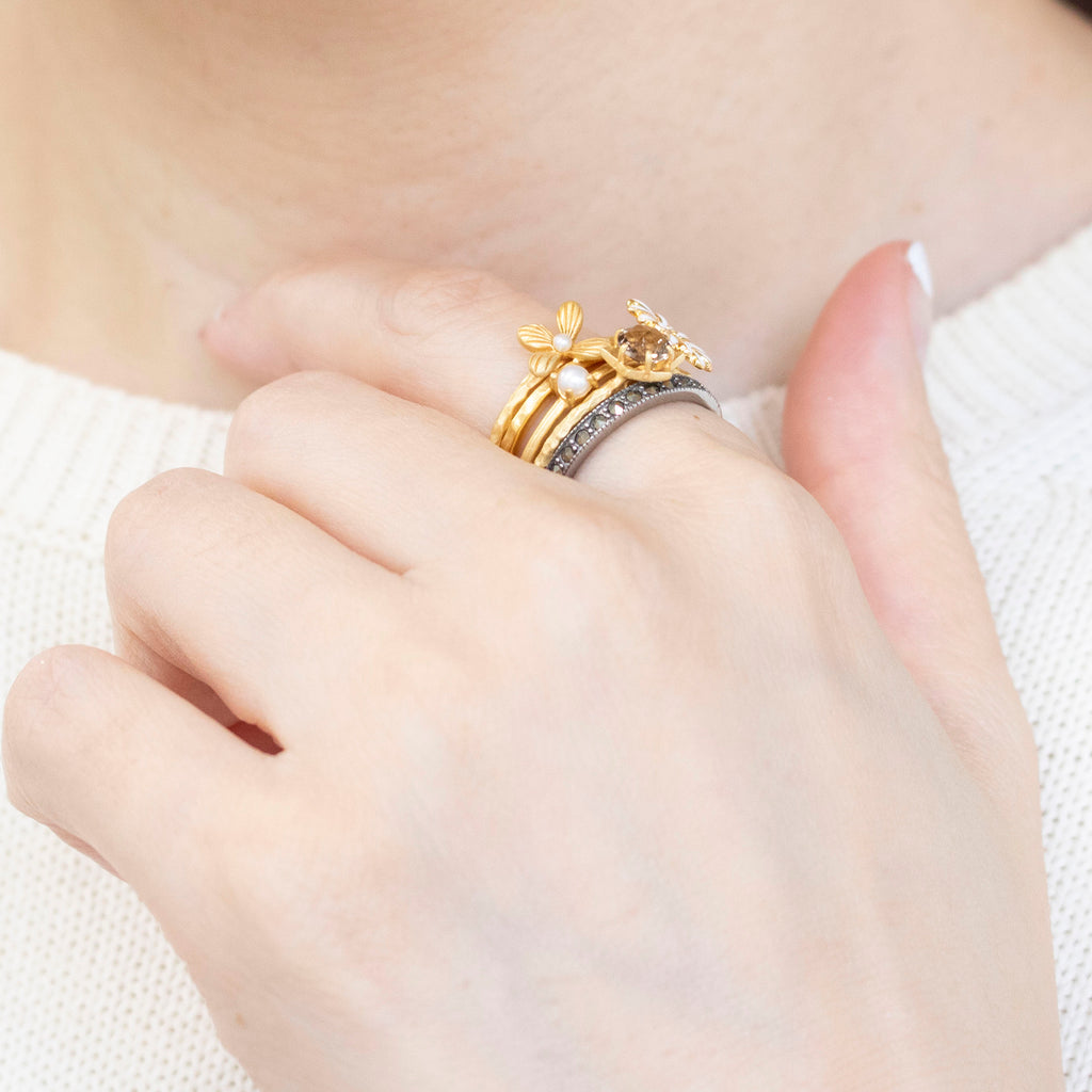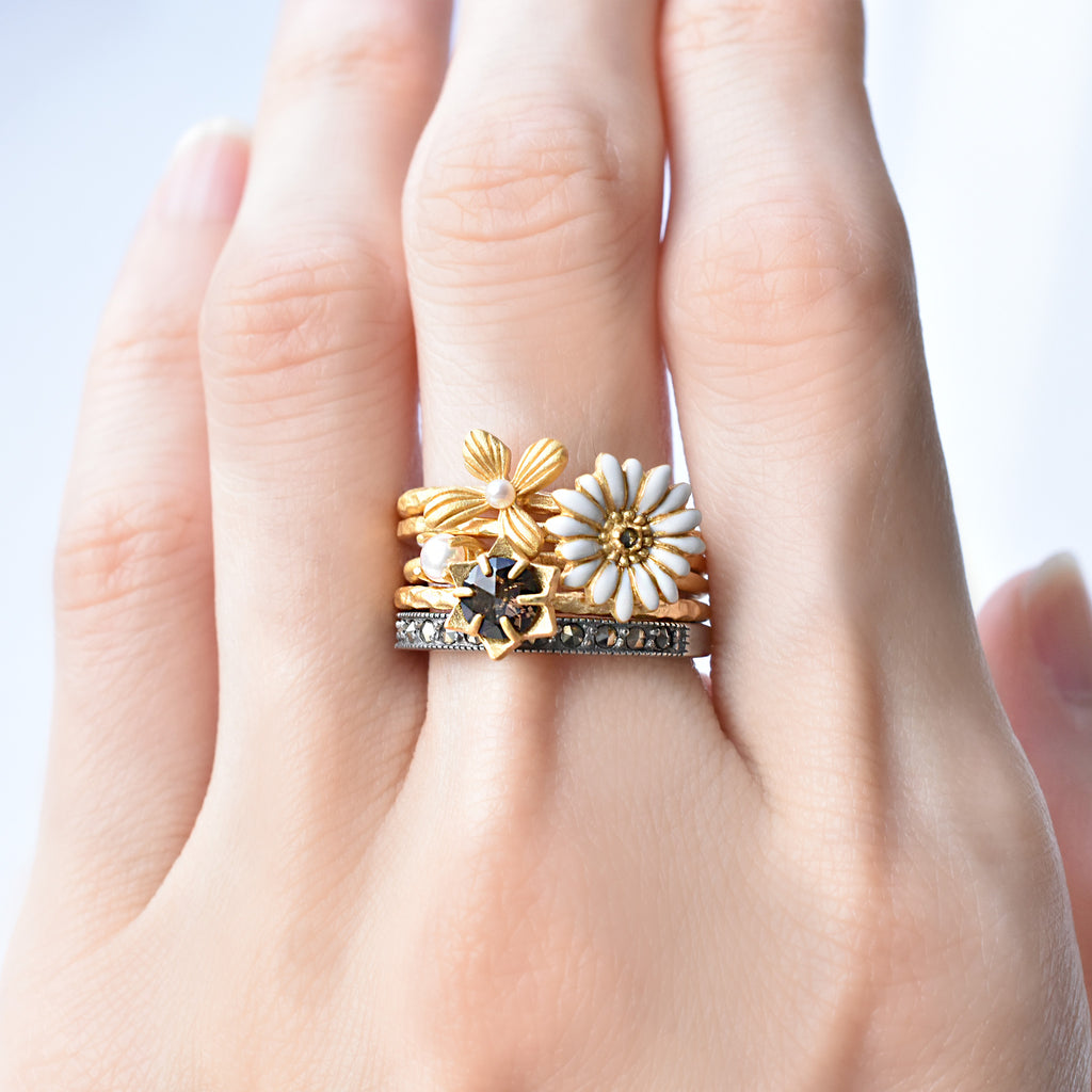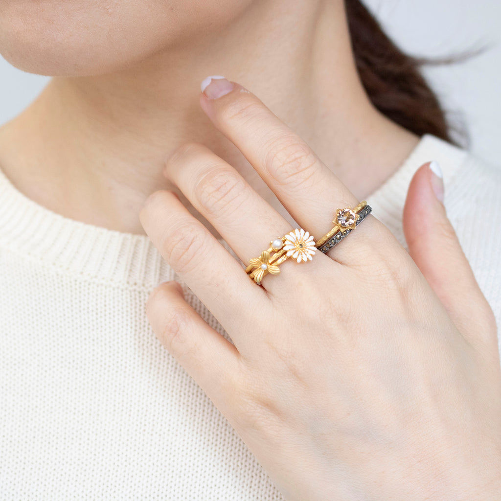 小さな淡水パールを留めた開きかけの花のリング、エナメルで仕上げたマーガレットの花のリング、シンプルに淡水パールを1珠留めたリング、ローズカットのスモーキークォーツを固いつぼみに見立てたリング、キラキラと輝くマルカジットを留めたハーフエタニティリング、5本をセットにしました。