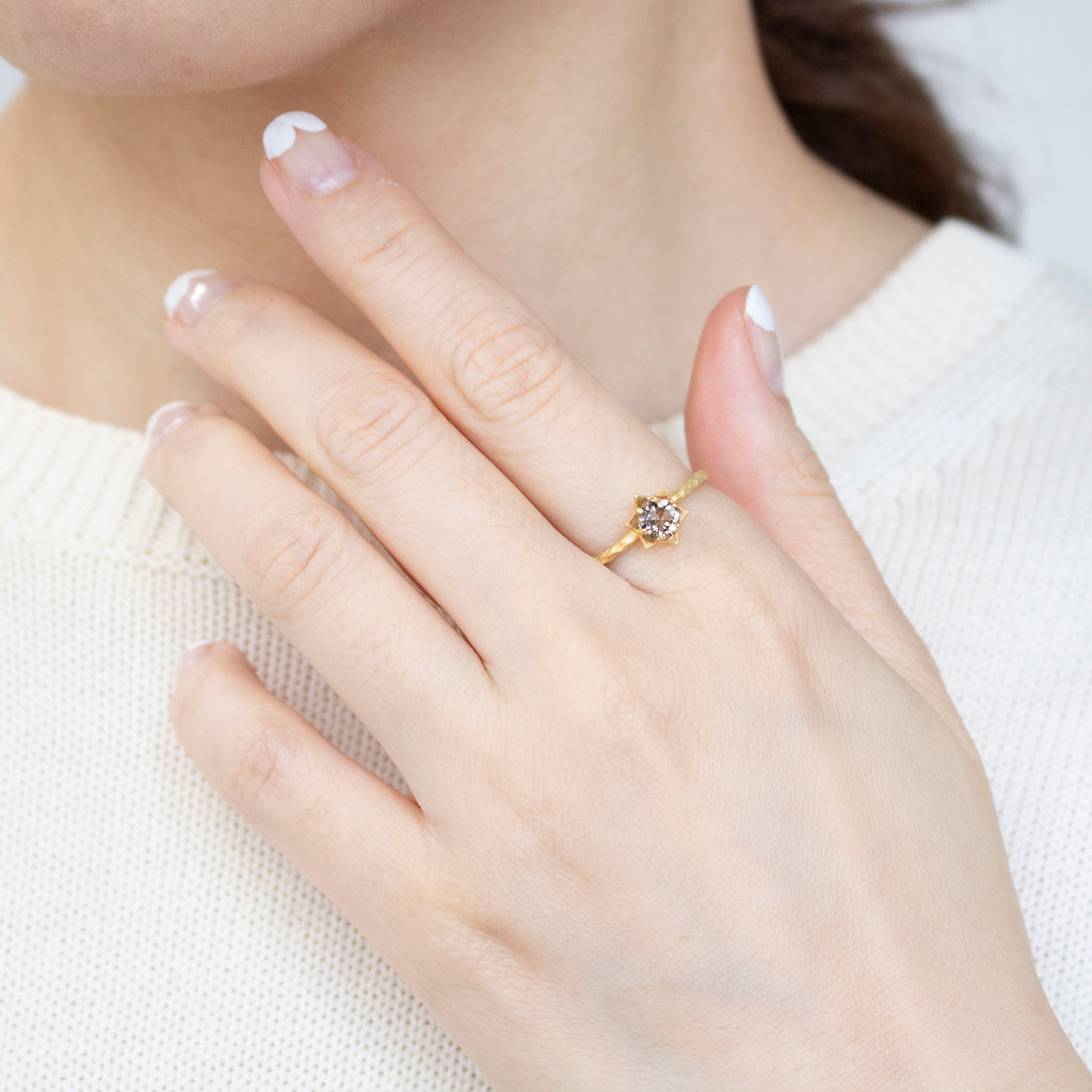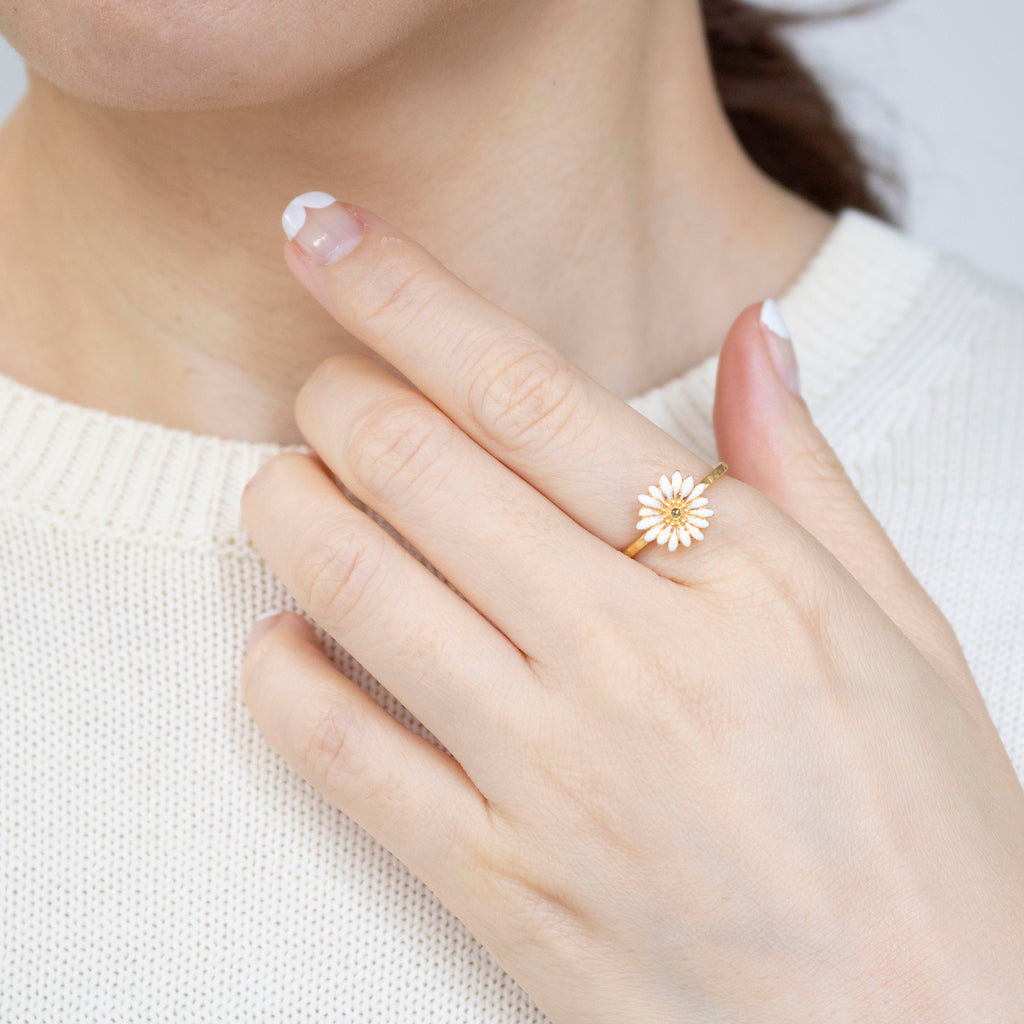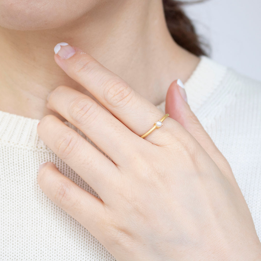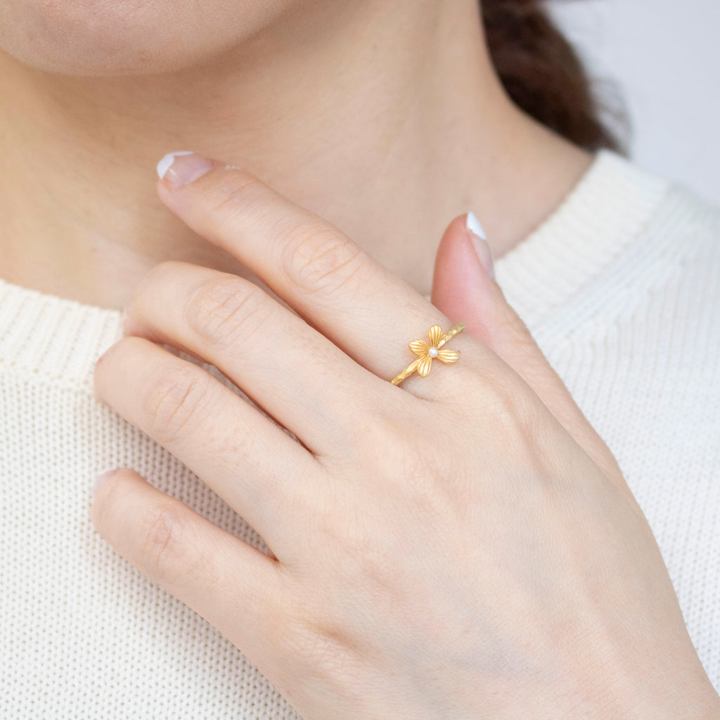 小さな淡水パールを留めた開きかけの花のリング、エナメルで仕上げたマーガレットの花のリング、シンプルに淡水パールを1珠留めたリング、ローズカットのスモーキークォーツを固いつぼみに見立てたリング、キラキラと輝くマルカジットを留めたハーフエタニティリング、5本をセットにしました。