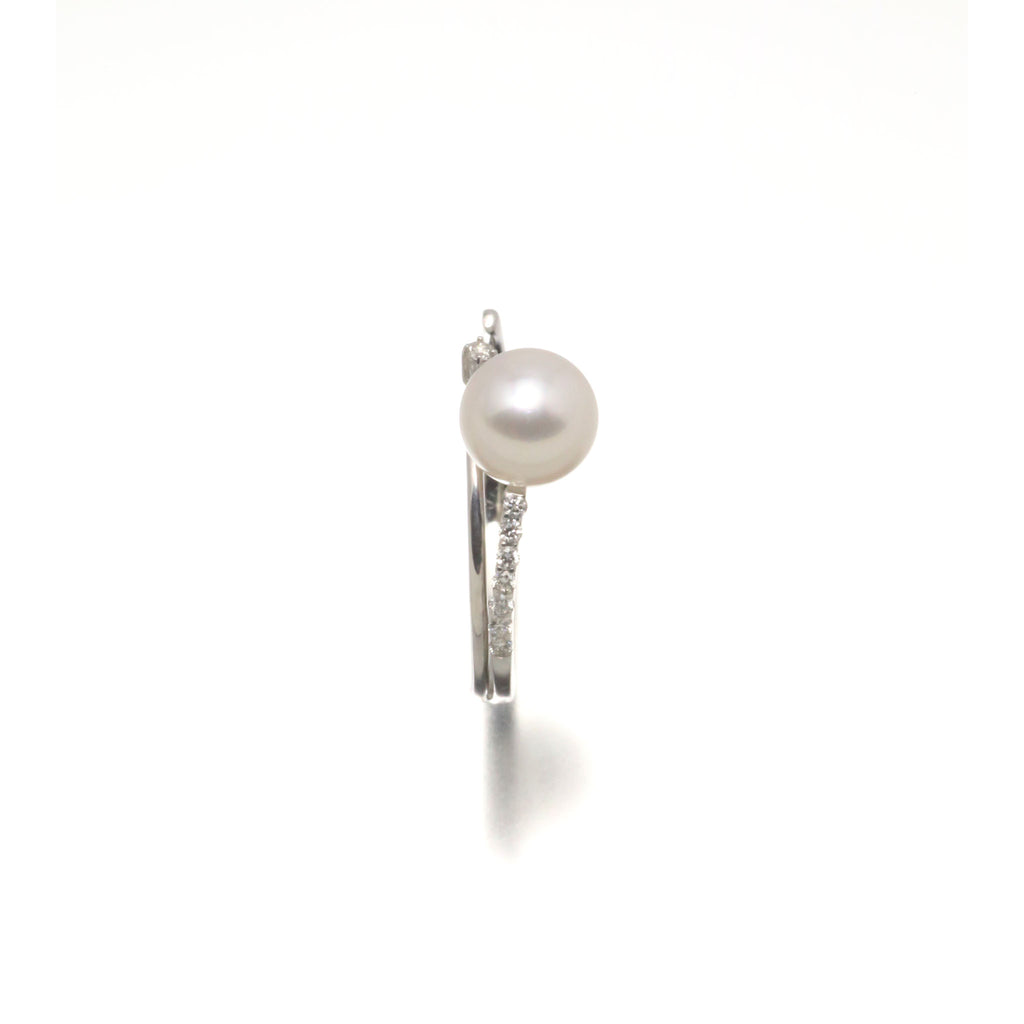 メレダイヤが輝くラインの先端に美しくてり輝く6.5mmのアコヤパールをセット。その下のプレーンなプラチナのラインの先端にはキラッと輝くメレダイヤを1石セットしました。