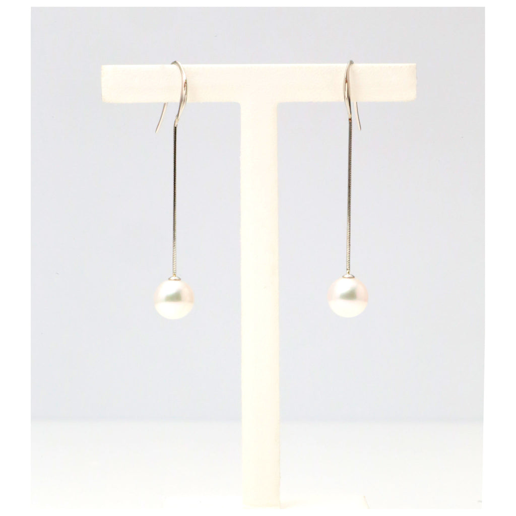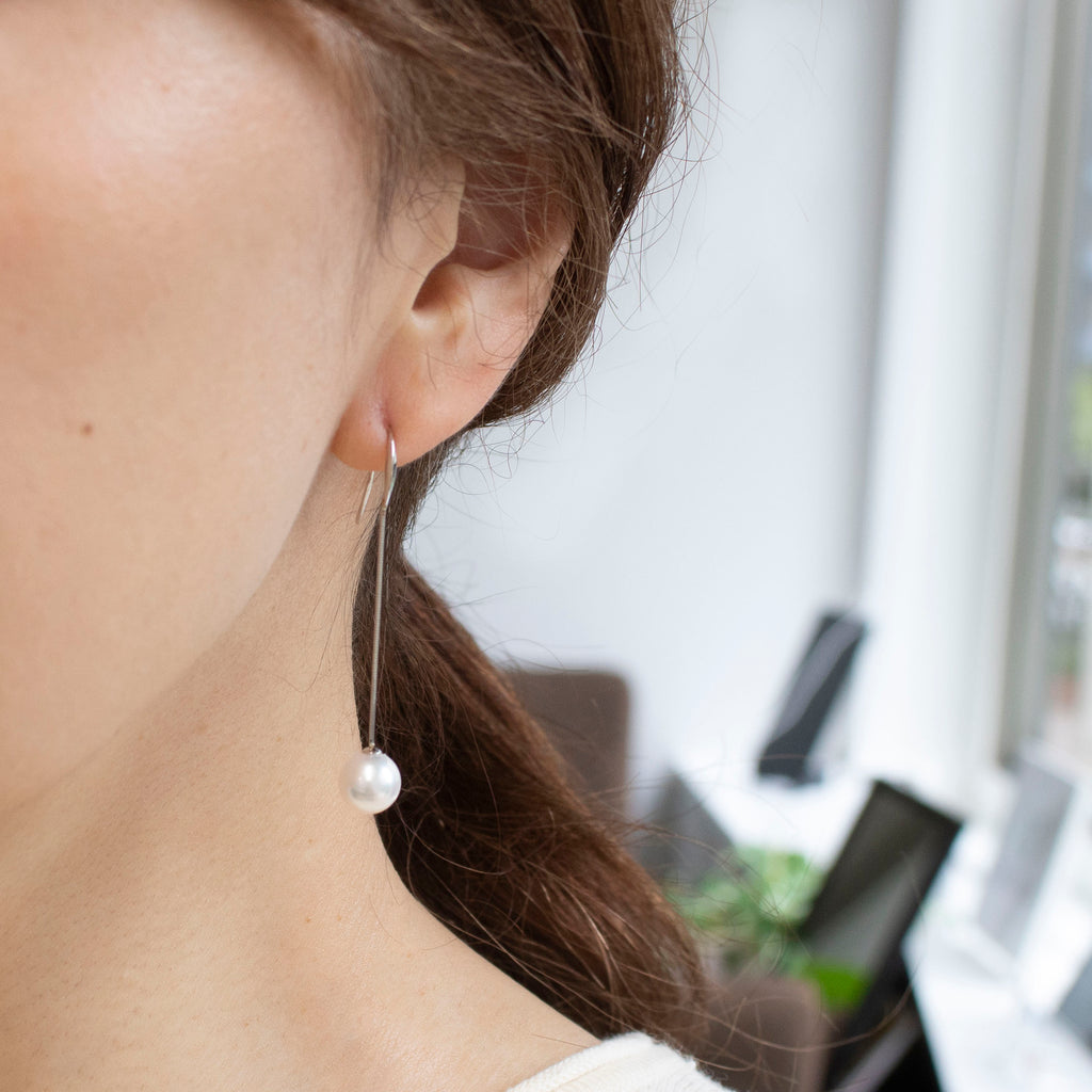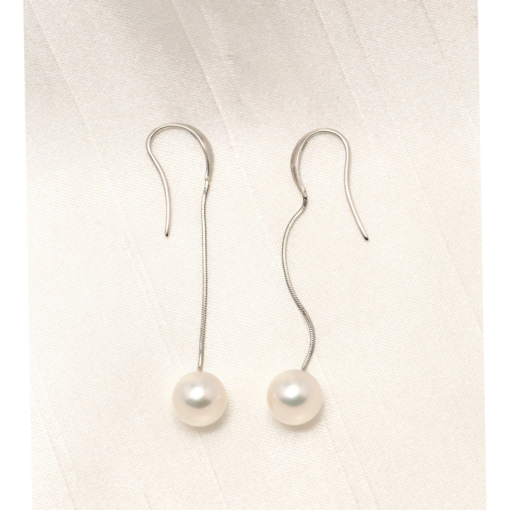 しなやかなチェーンの先でアコヤパールが揺れるピアスです。