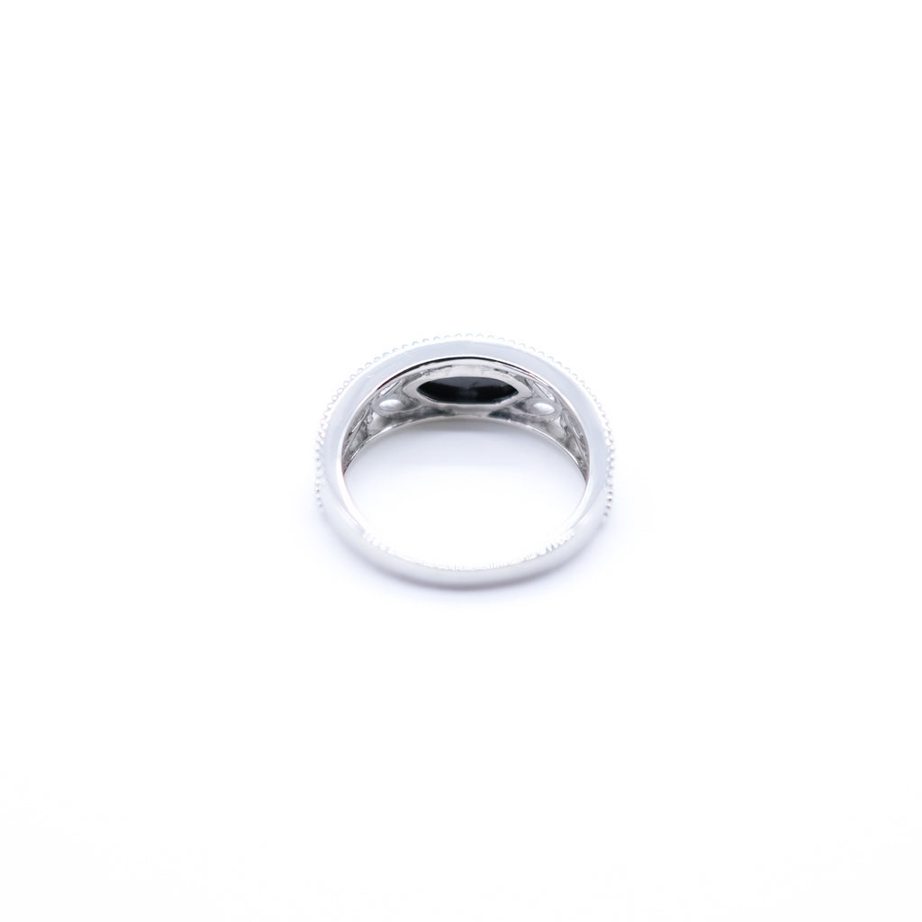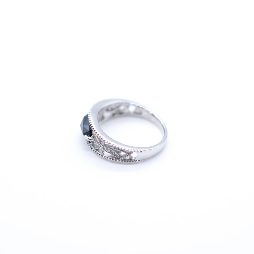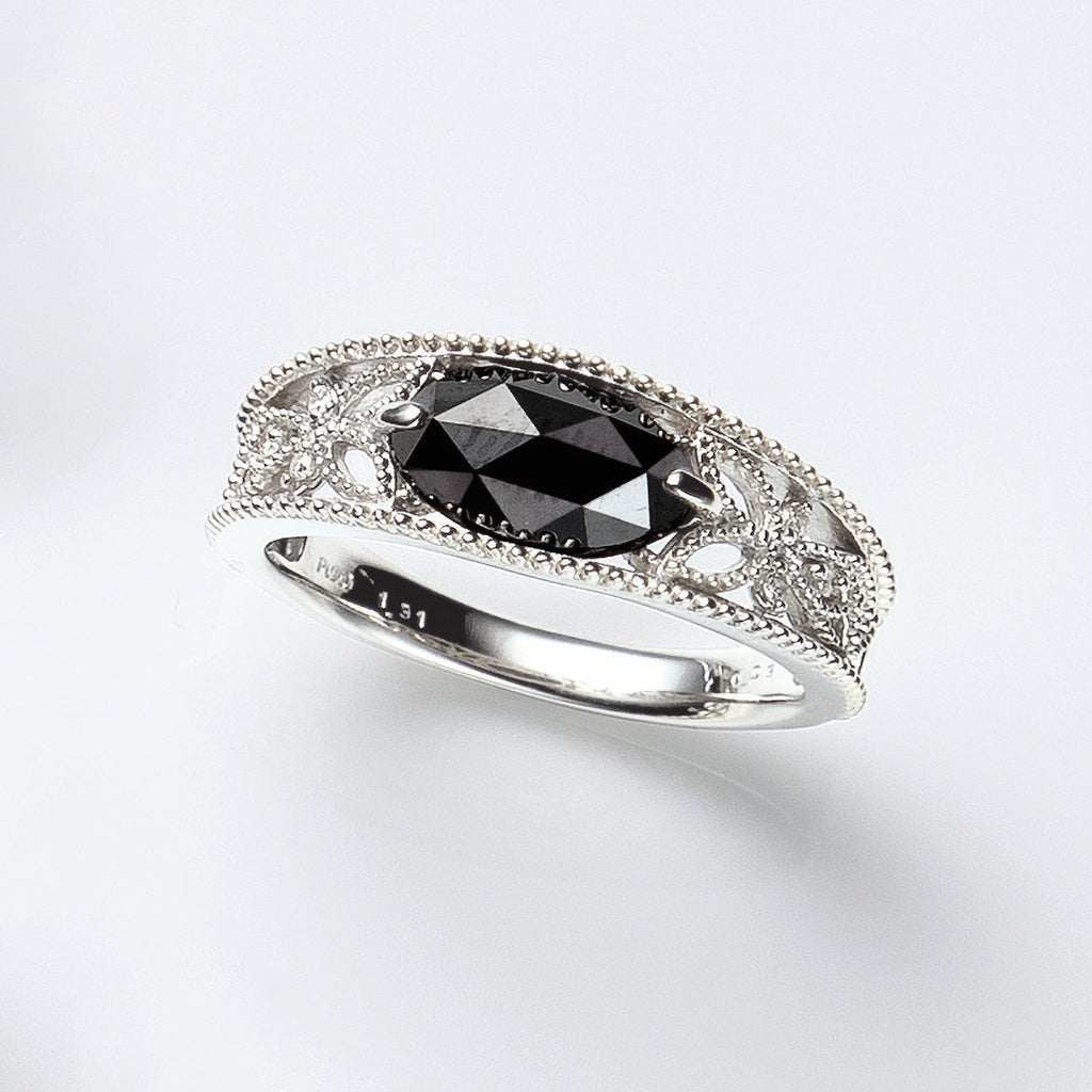 ミル打ち風の繊細なテクスチャーを刻んだリングの中央にマーキスカットのブラックダイヤを横向きにセット。存在感抜群のブラックダイヤとリング全体に施した繊細な透かし模様との組み合わせがクラシカルです。