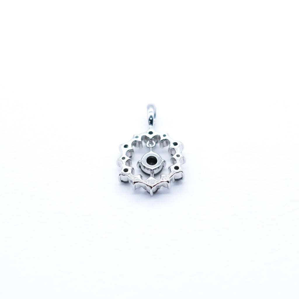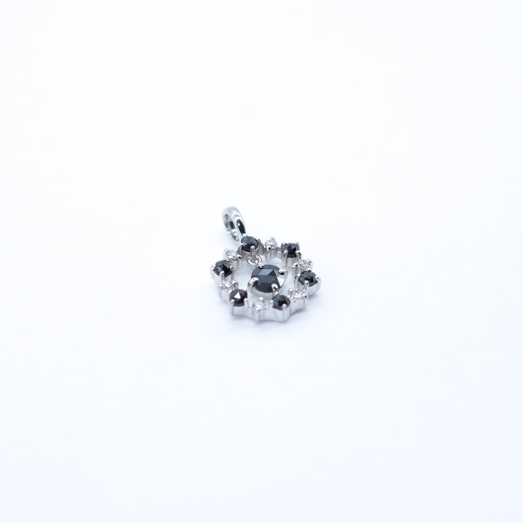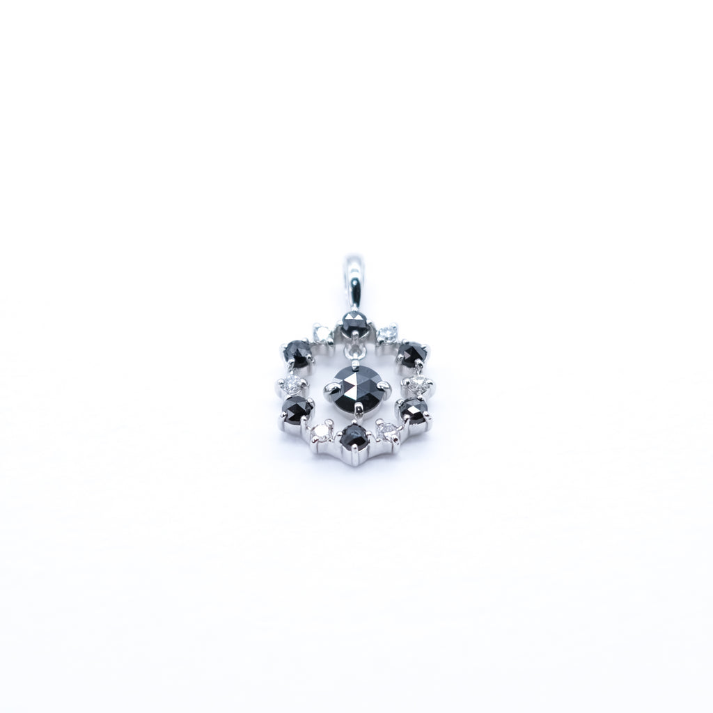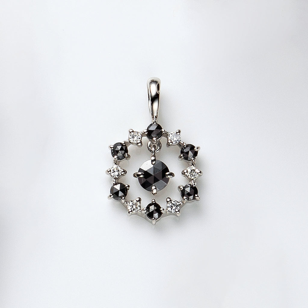ブラックダイヤと通常の無色のメレダイヤを交互に留めたサークルの中に、ひときわ大きなブラックダイヤを1石セット。サークルの中で揺れるブラックダイヤが胸元で存在感を放ちます。