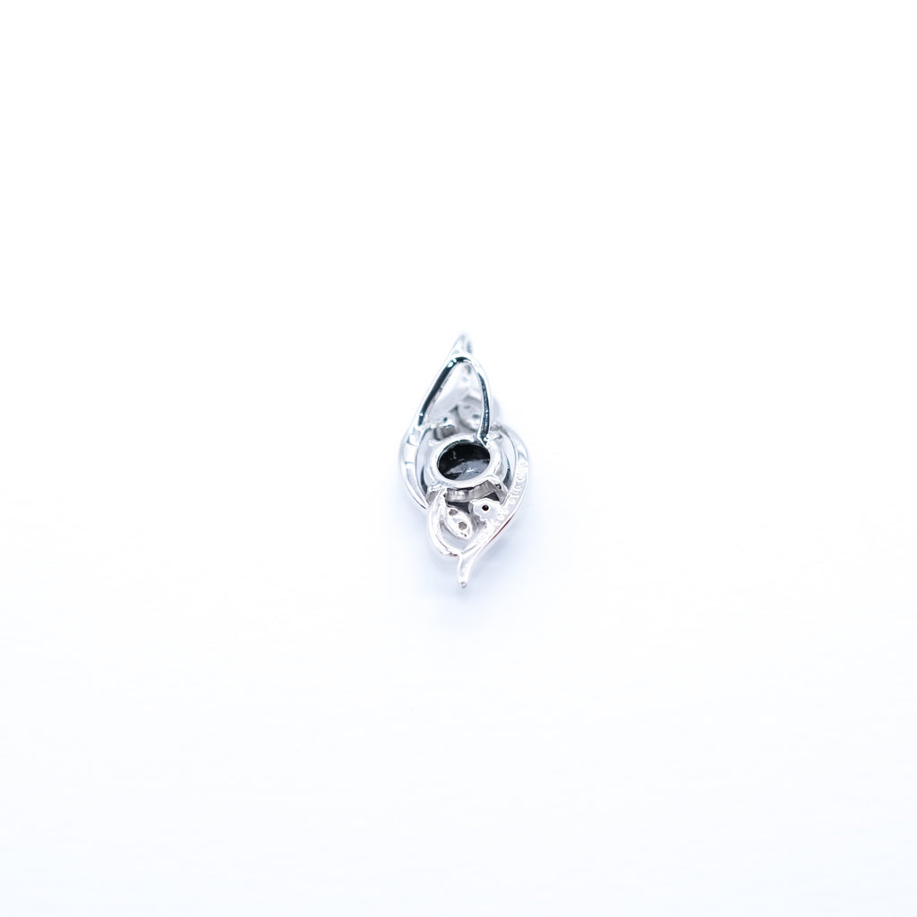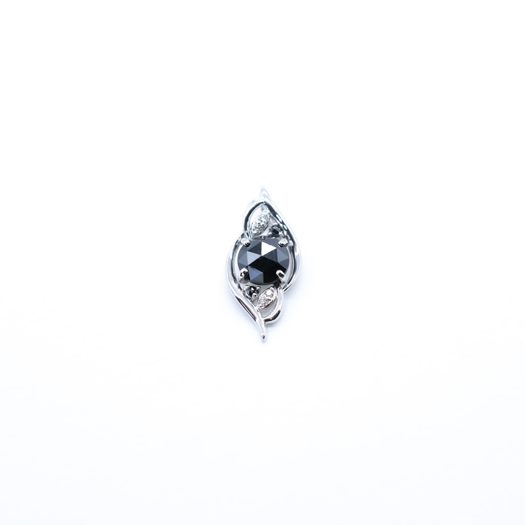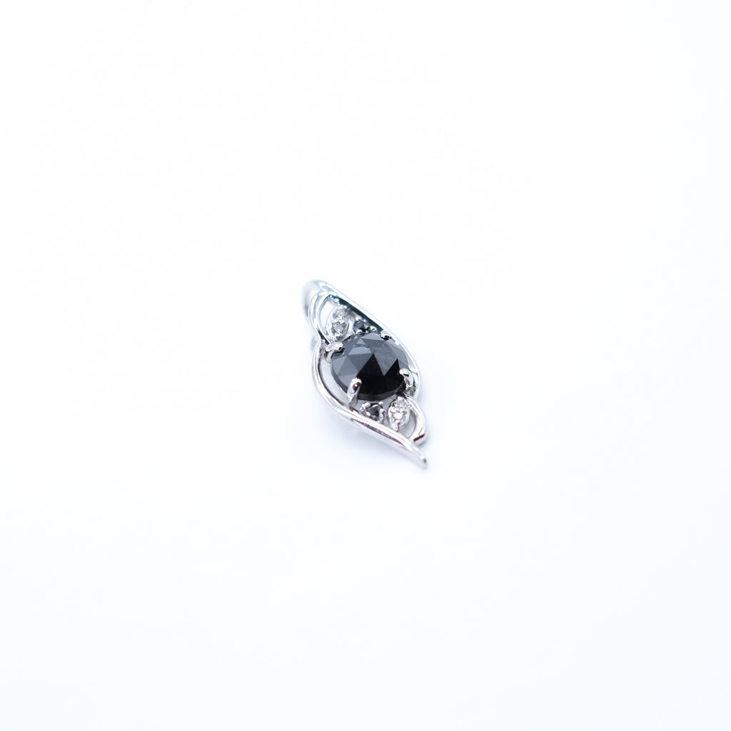 ふっくらとしたボリューム感のあるフォルムのペンダントトップのセンターに、ボリューム感抜群の大粒1ctのブラックダイヤをセット。その上下には小粒のブラックダイヤを1石ずつセットしました。