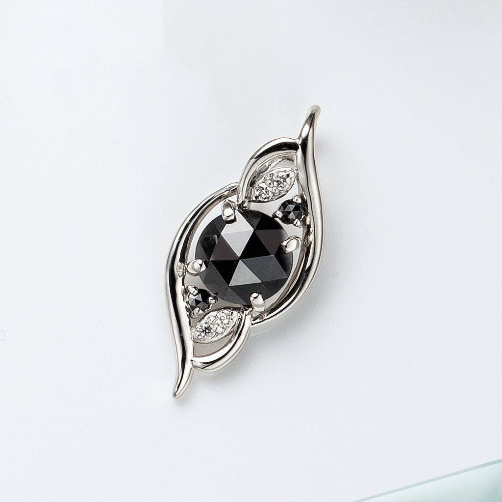 透明感のないブラックダイヤは、ダイヤの内側からの輝きではなく、ダイヤ表面の反射による輝きを楽しむためにローズカットにすることが多く、このペンダントトップに使われているブラックダイヤもローズカットが施されています。