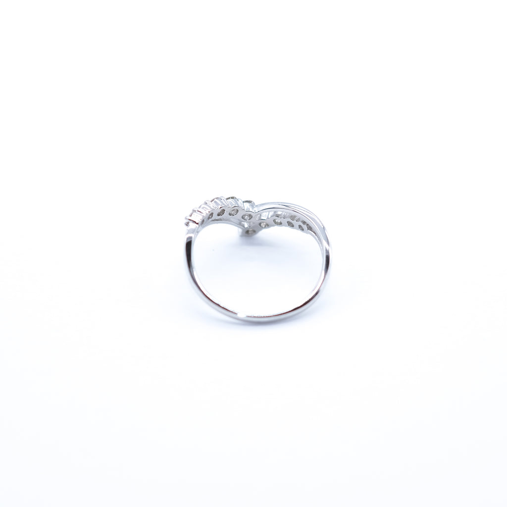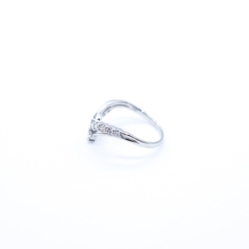 メレダイヤの曲線とプラチナの曲線が二重にV字を描くリングは、キラキラとした輝きで指をすっきりと見せてくれそうです。
