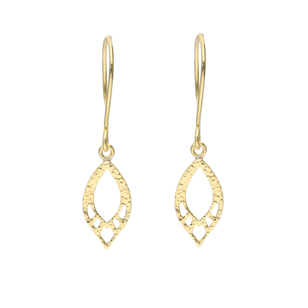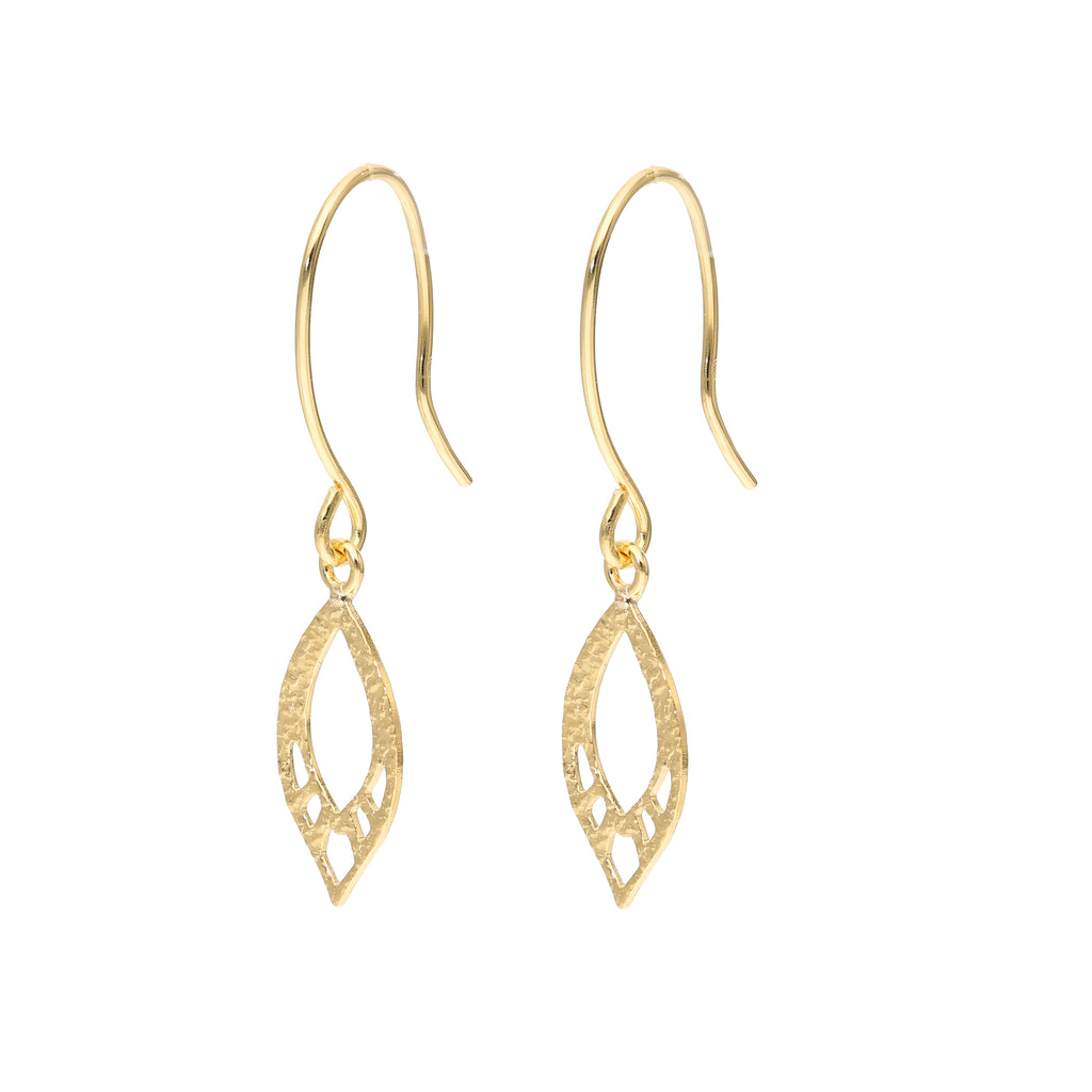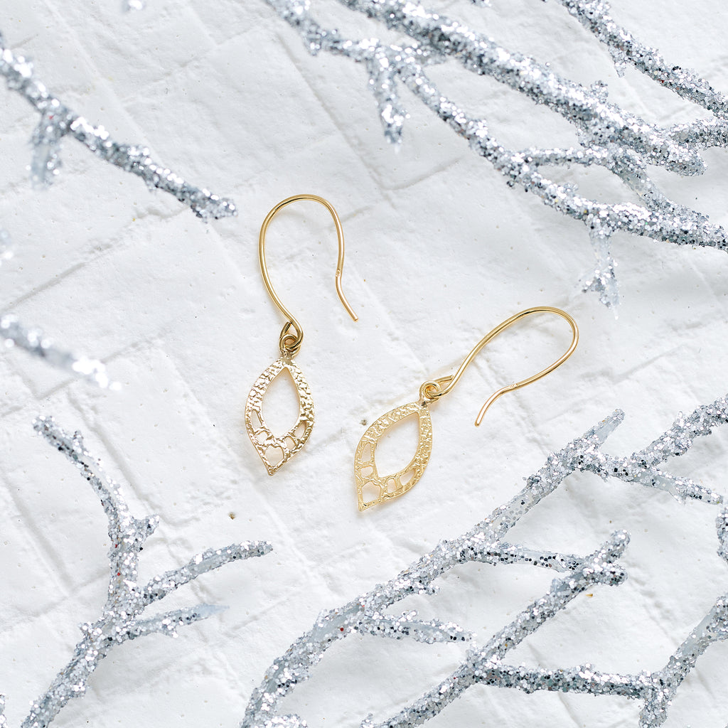 透かし模様を施したリーフ形のパーツが軽やかに揺れるデザインです。リーフ形のパーツにはキラキラと輝くテクスチャーが施されていて、小ぶりながらも存在感があります。