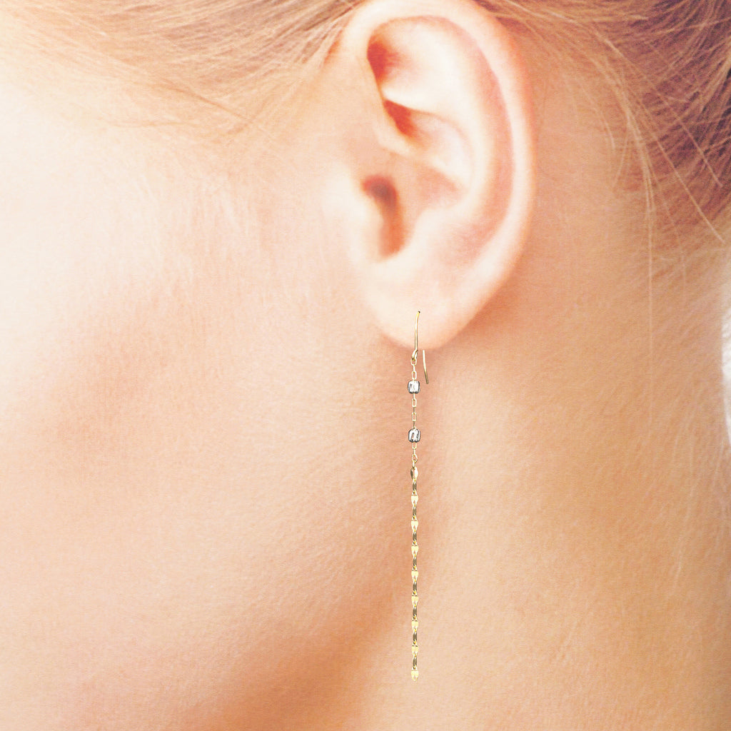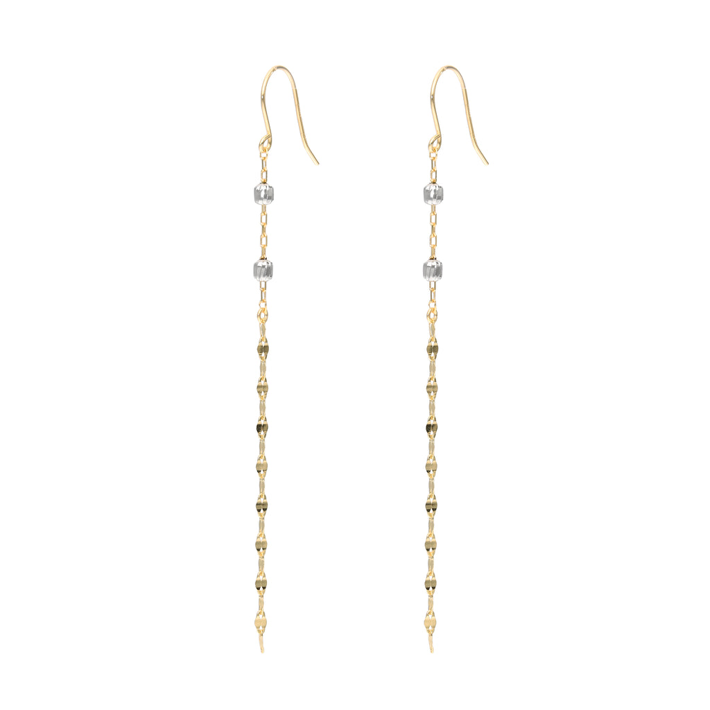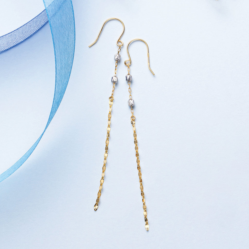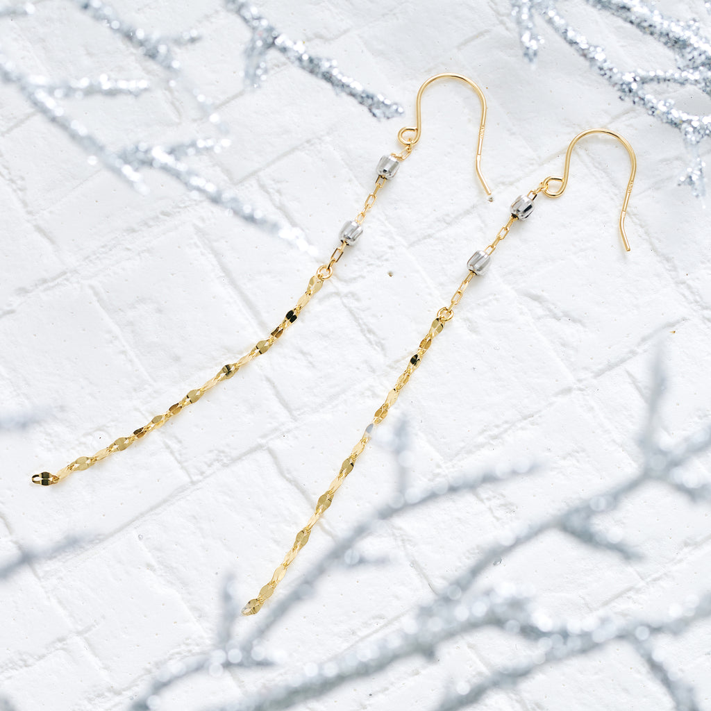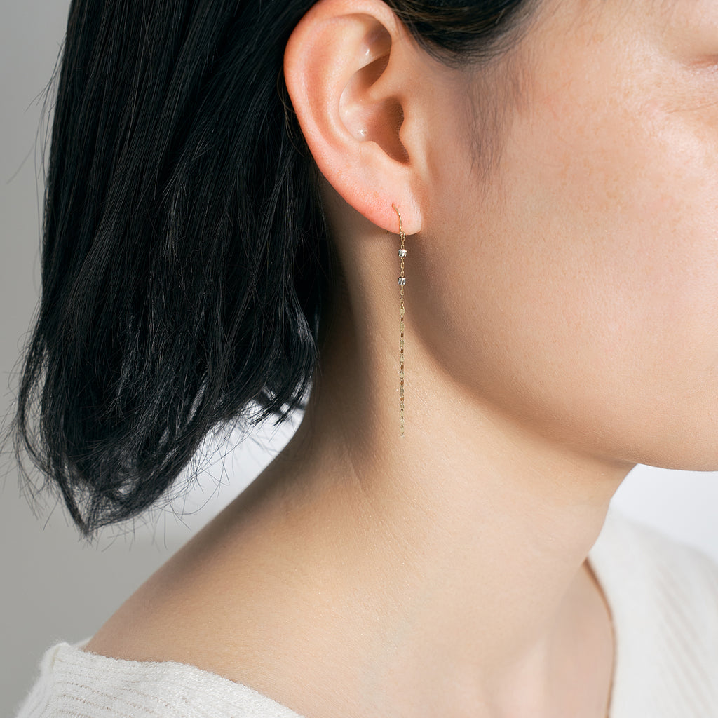 ペタルチェーンならではの平らな面とプラチナ製のカットボールがキラキラと輝く、シンプルなデザインでありつつキラキラとした輝きを楽しめるピアスです。