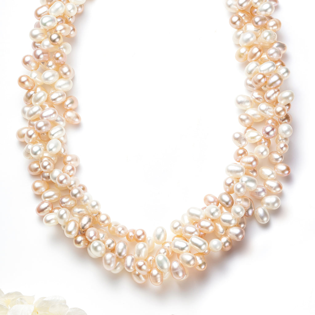 卵形の淡水パールのネックレスを3連にしたボリューム感たっぷりなネックレスです。