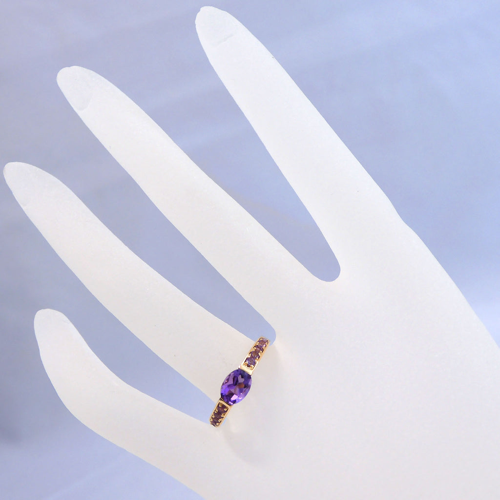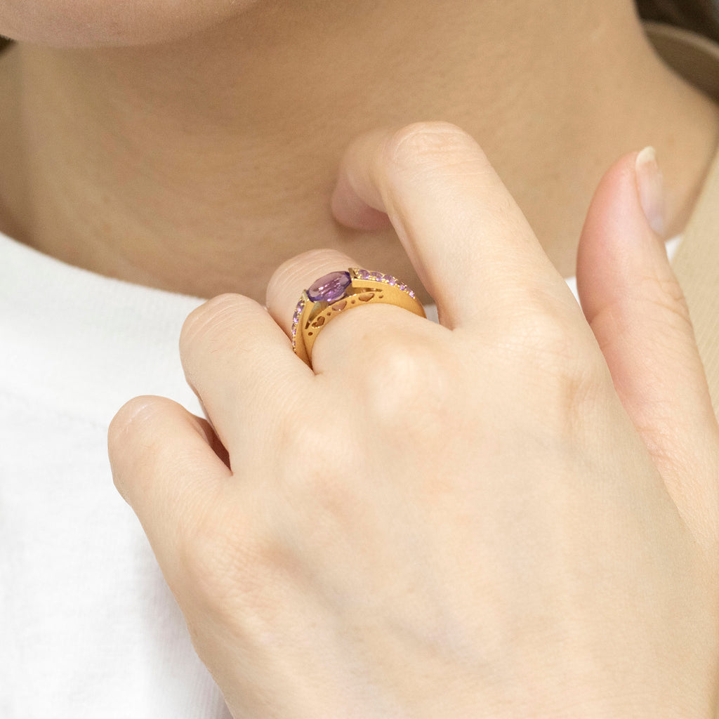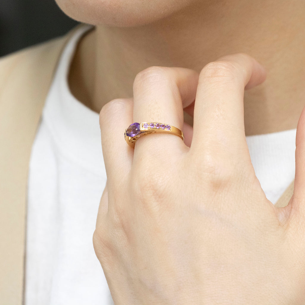古くから高貴な色として愛されてきた紫色の宝石アメシスト。オーバルカットのアメシストをセンターに留めたリングです。