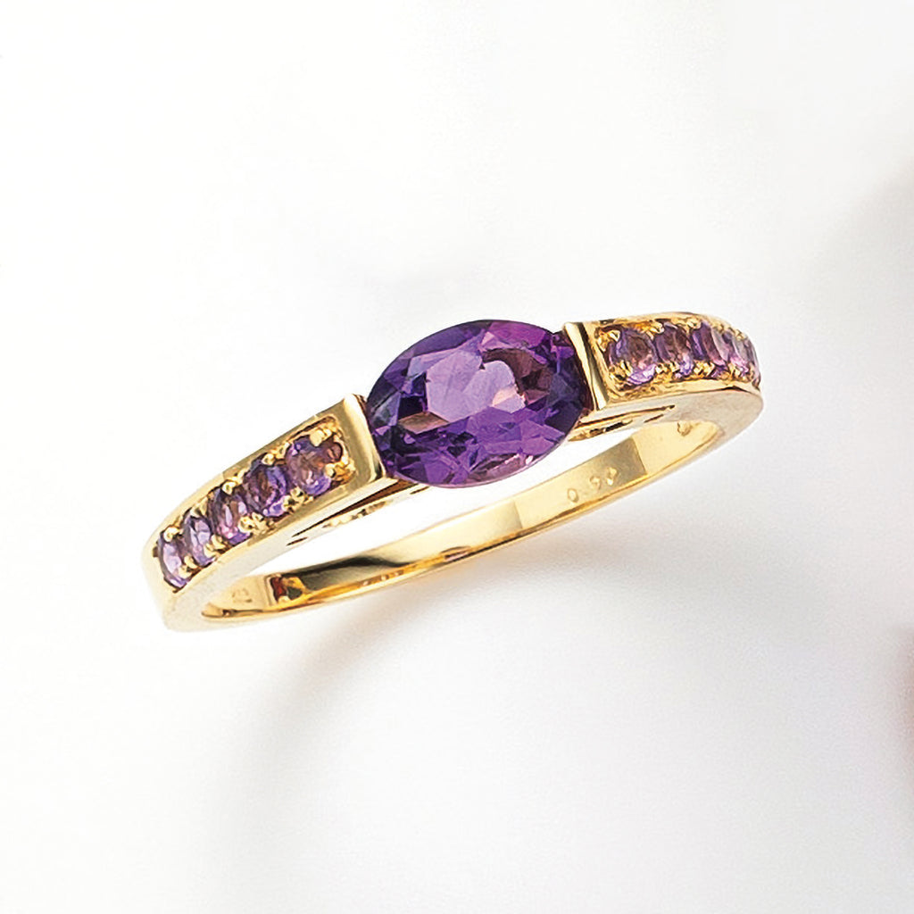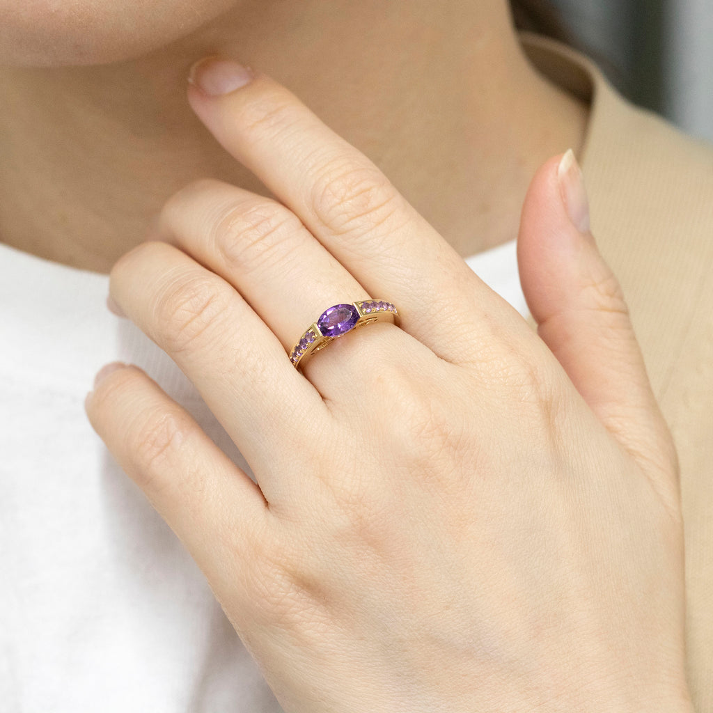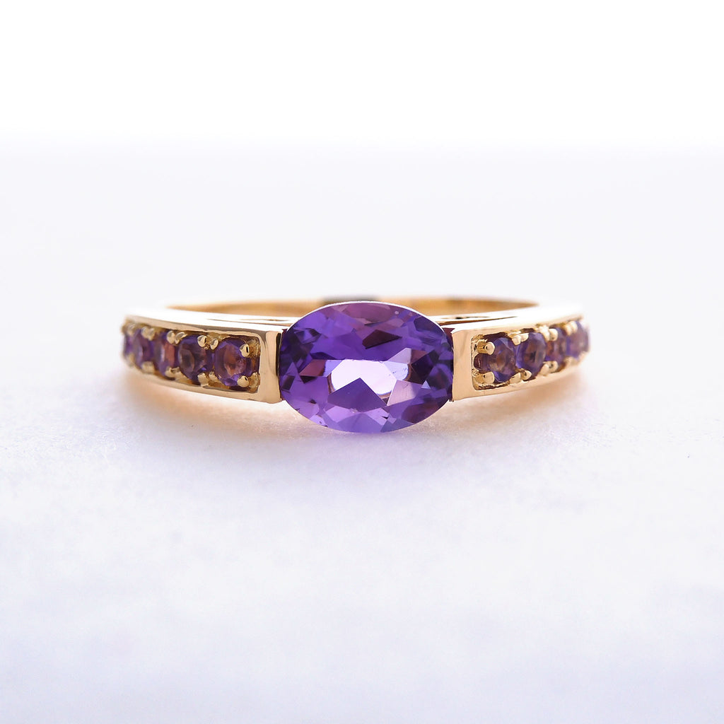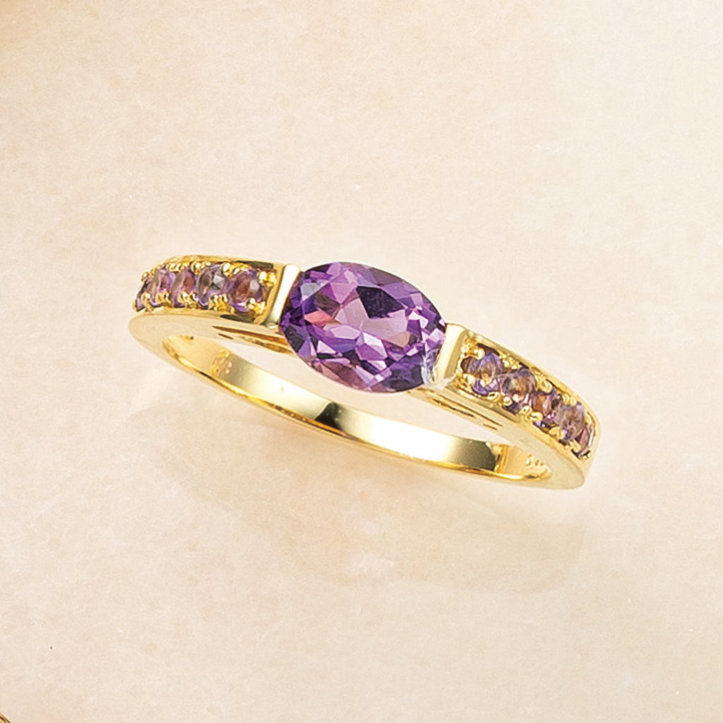 古くから高貴な色として愛されてきた紫色の宝石アメシスト。オーバルカットのアメシストをセンターに留めたリングです。