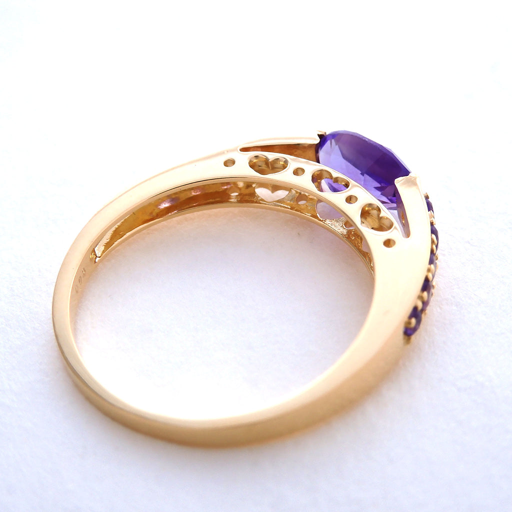 アメシストの紫色と相性抜群の18金イエローゴールドの枠にセット。リングを横から見るとセンターに留めたアメシストの下の部分には可愛らしいハートの形の透かしが並んでいます。