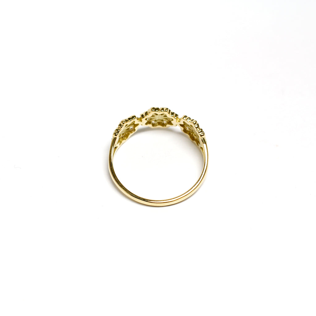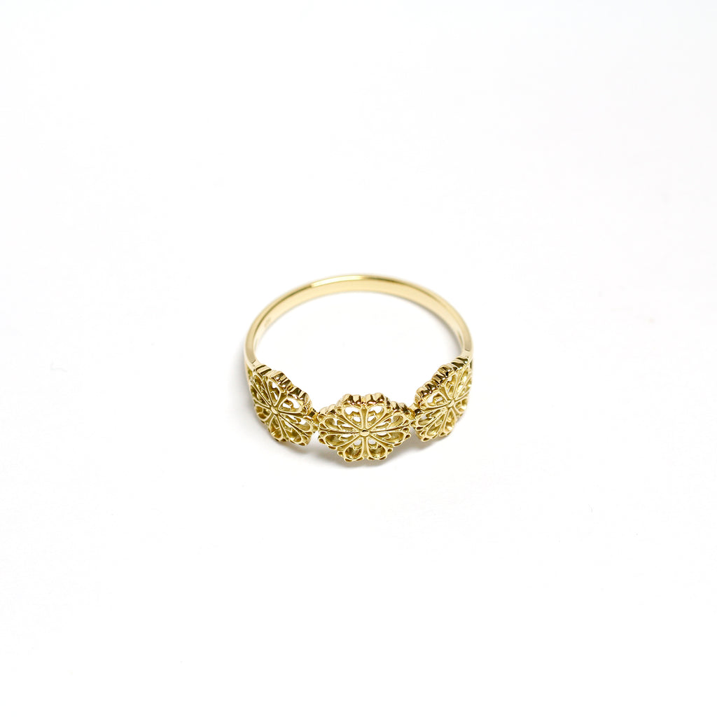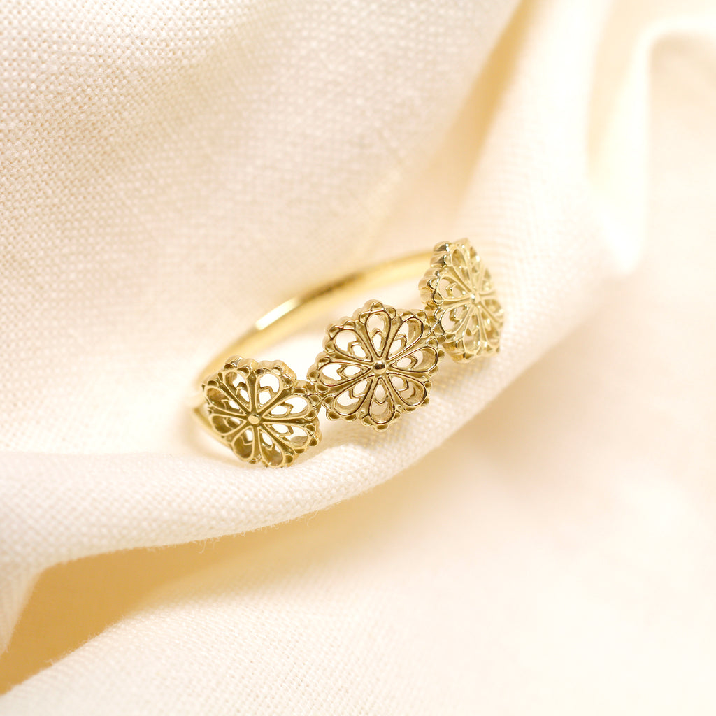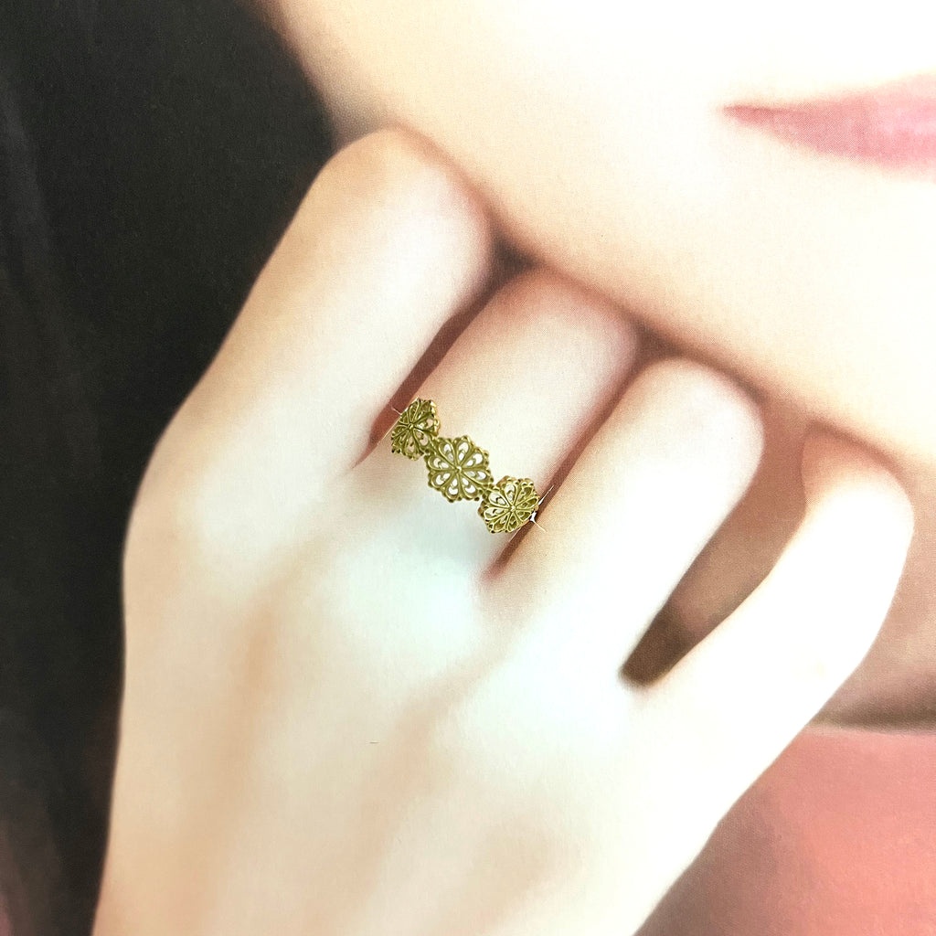 レーシーな透かし模様がクラシカルな雰囲気の18金イエローゴールド製のリングです。