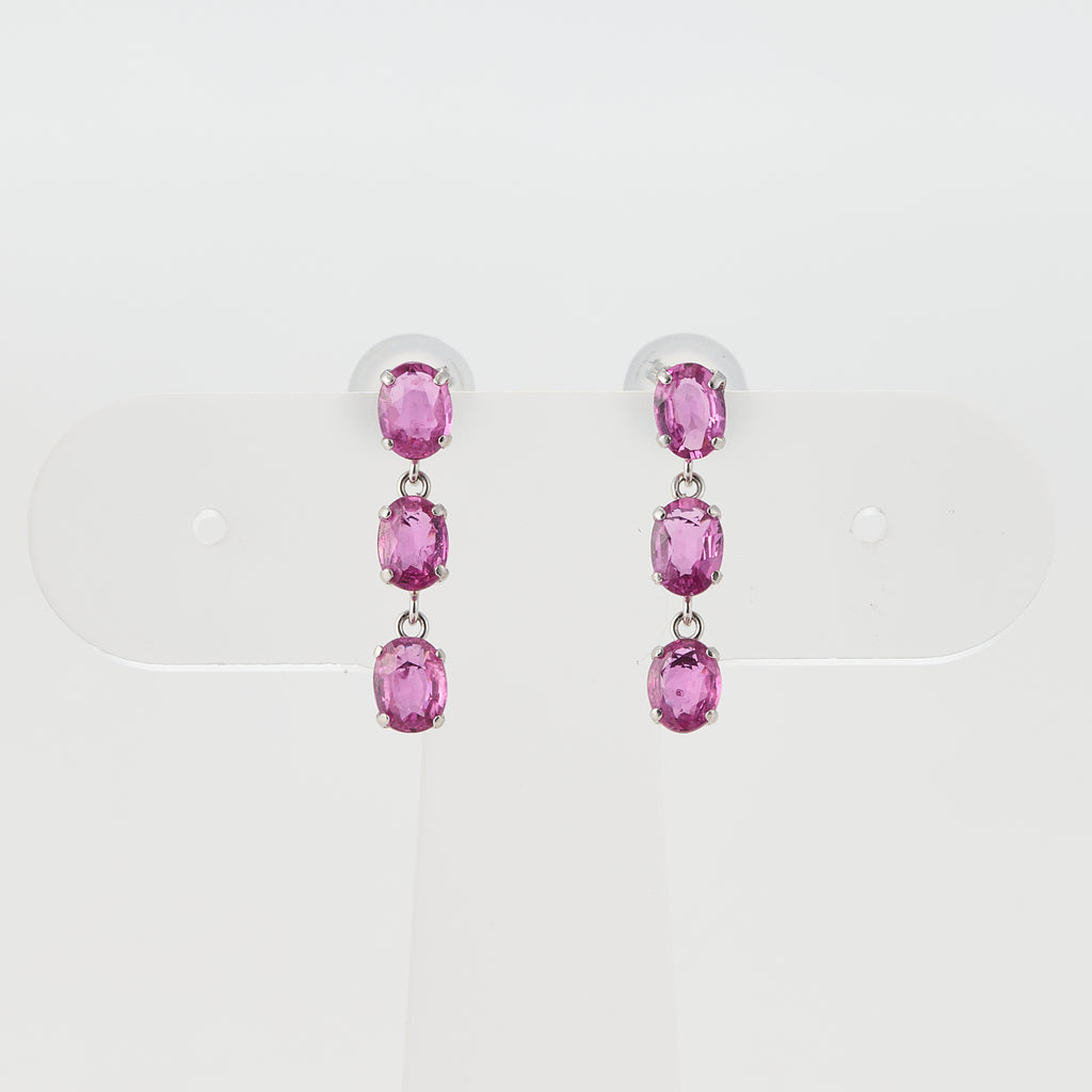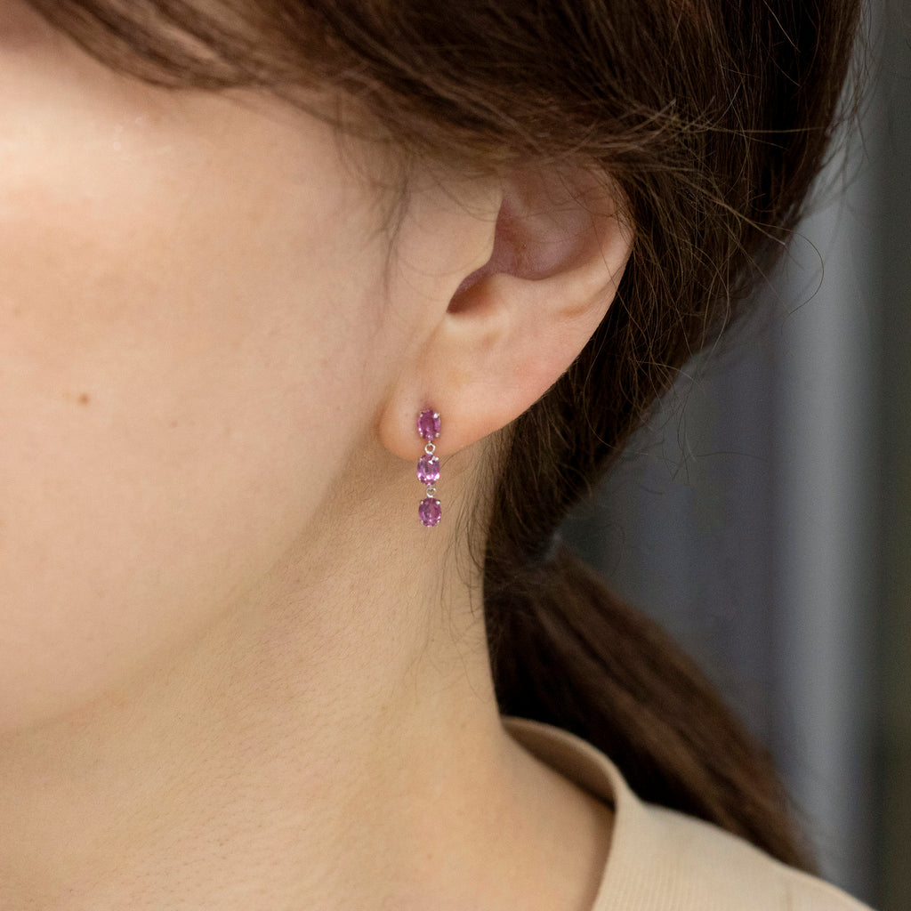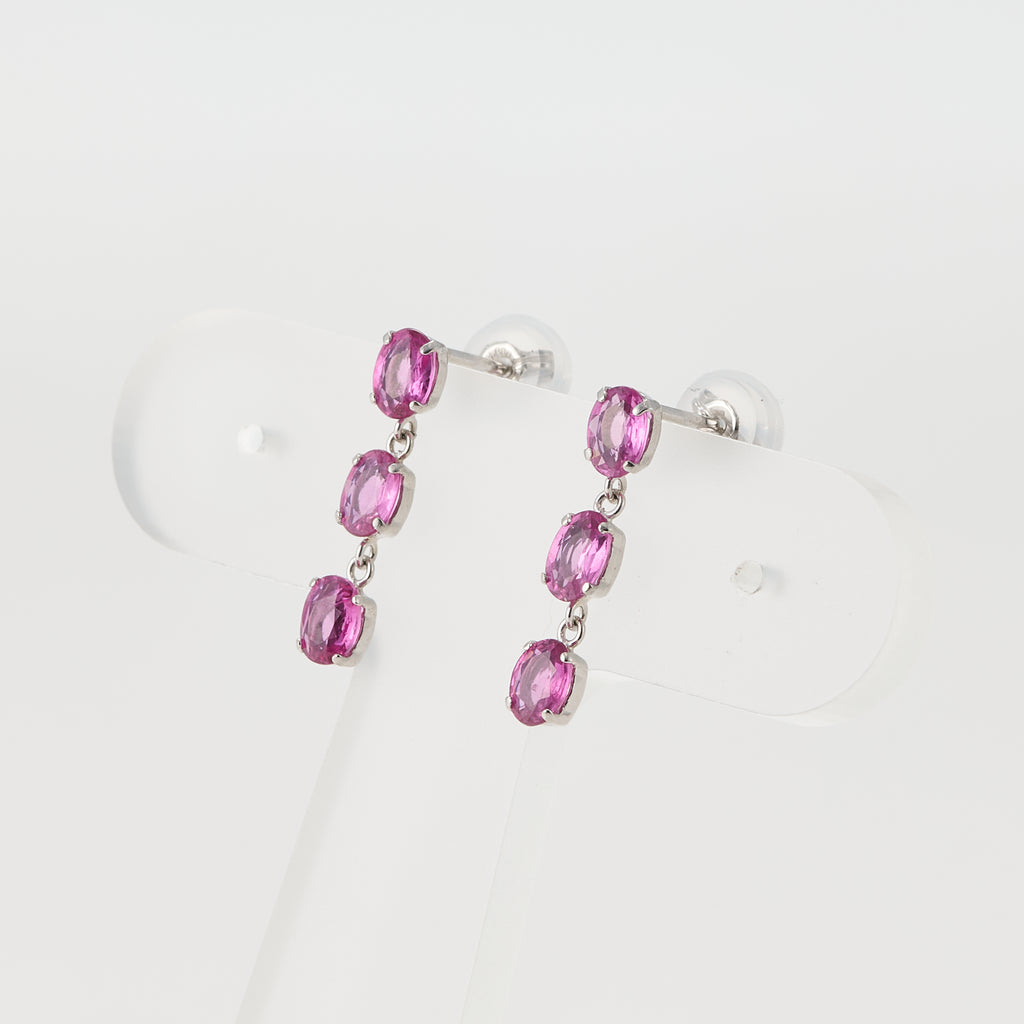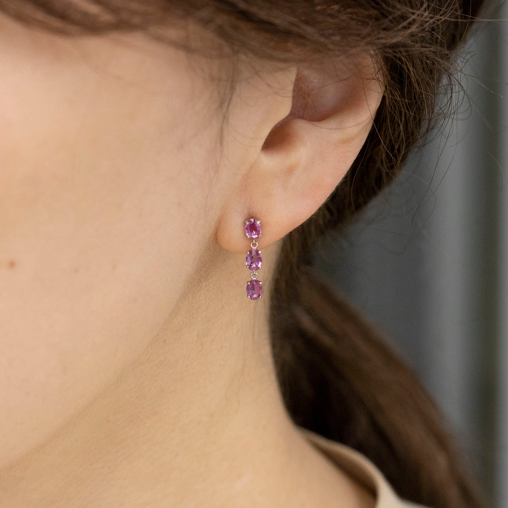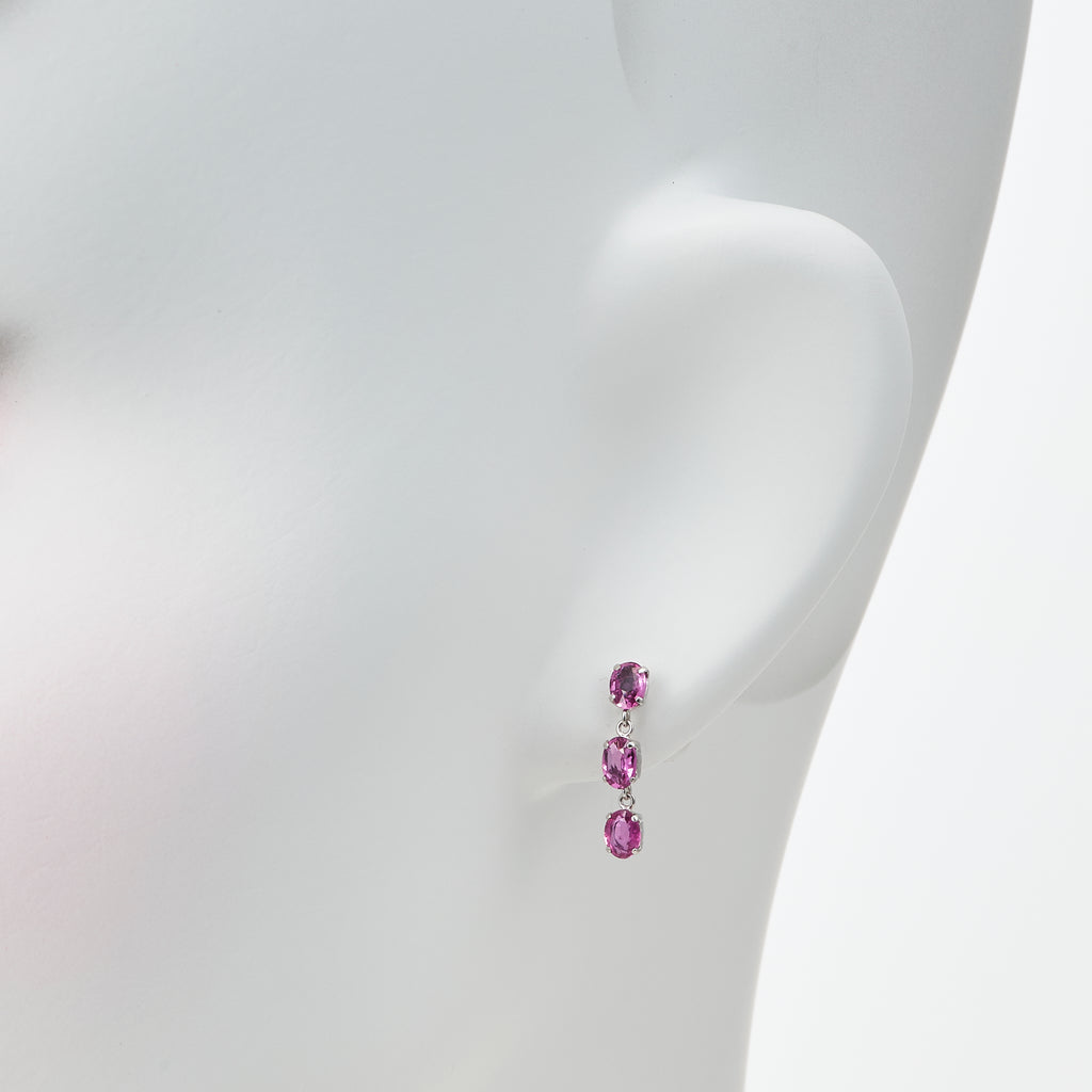 3石のオーバルシェイプのルビーを縦に繋げたベーシックなデザインです。左右合計1ctものルビーを使用していて耳元での存在感は抜群です。