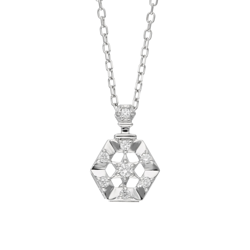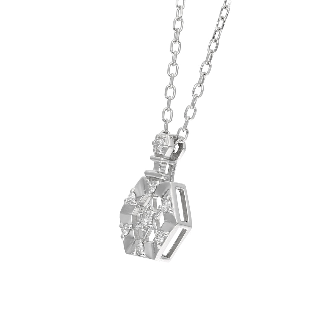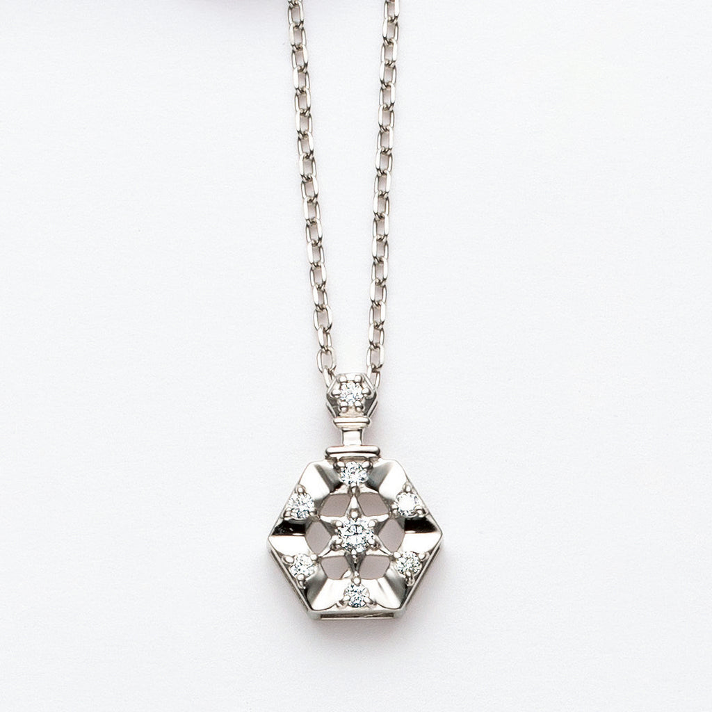 プラチナ製の六角形のトップの各辺にメレダイヤを1石ずつセット。中央の星の形にもメレダイヤをセットしました。チェーンを通すバチカン部分も小さな六角形でメレダイヤをセットしています。