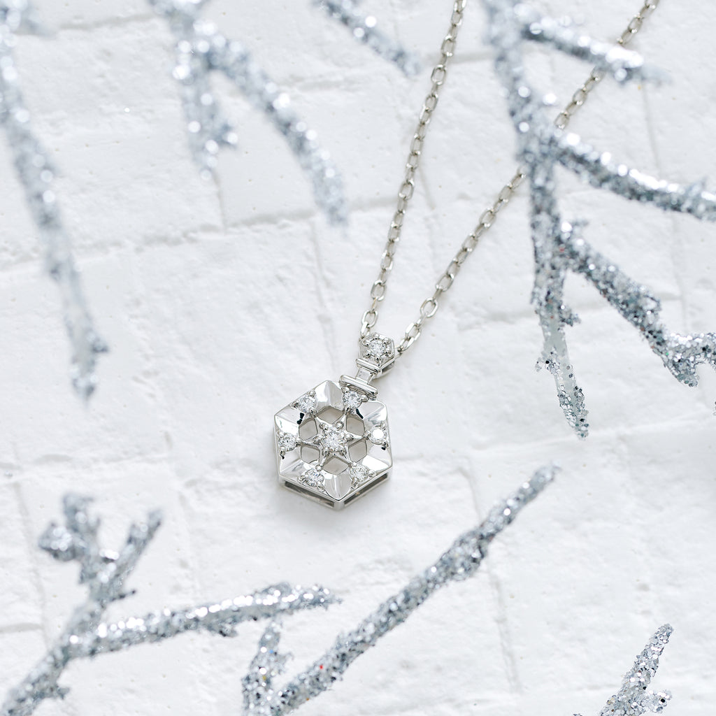プラチナとダイヤの白くてクールな印象の組み合わせが冬を思わせるネックレスです。