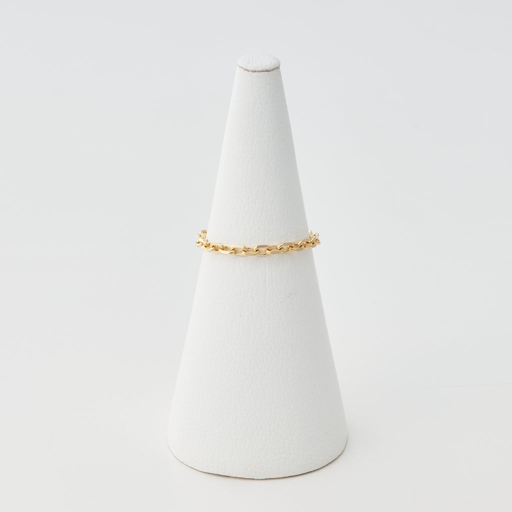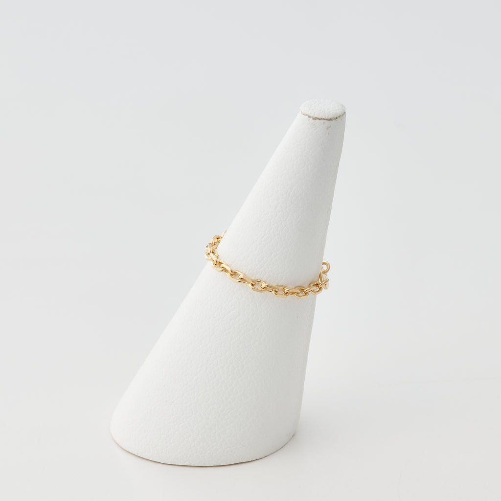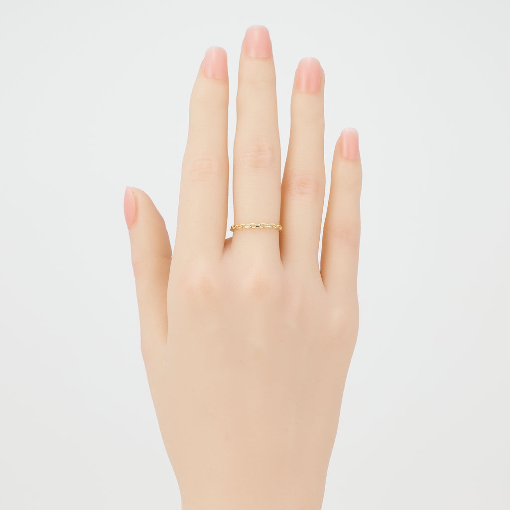 ぐるっと1周同じ太さのアズキチェーンでできたリングで、チェーンならではの立体感と抜け感が軽やかな雰囲気です。カジュアルな装いによく合いそうです。