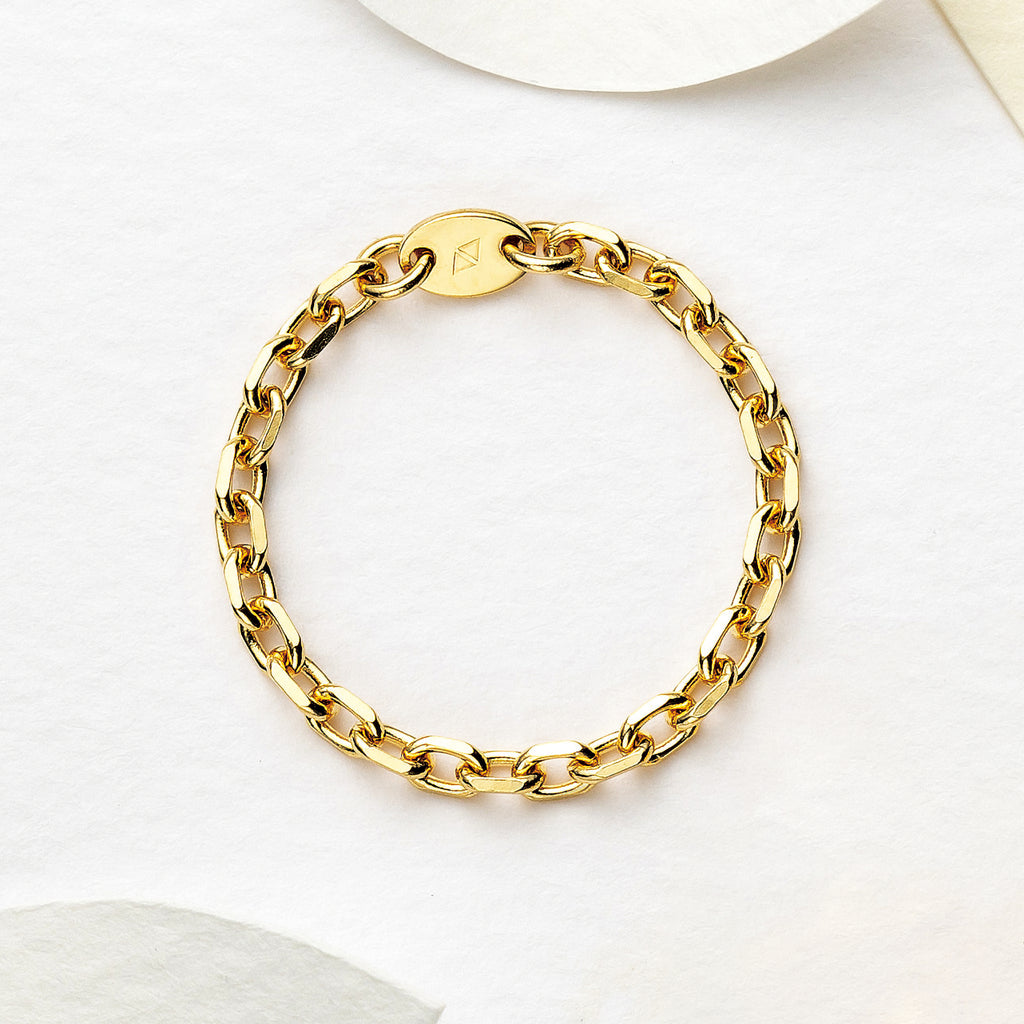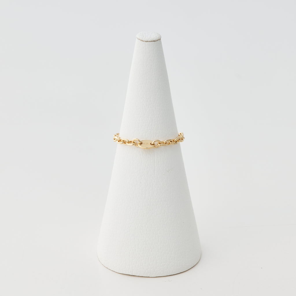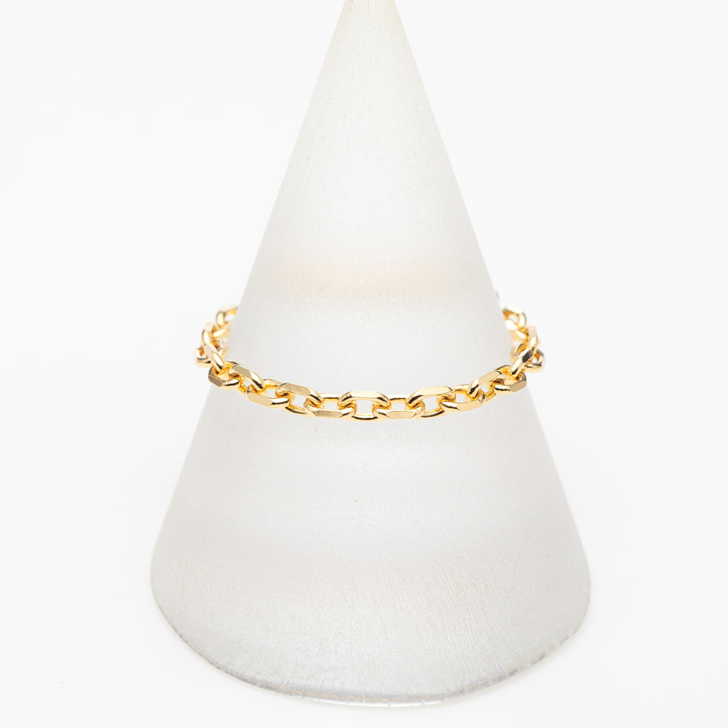ぐるっと1周同じ太さのアズキチェーンでできたリングで、チェーンならではの立体感と抜け感が軽やかな雰囲気です。カジュアルな装いによく合いそうです。