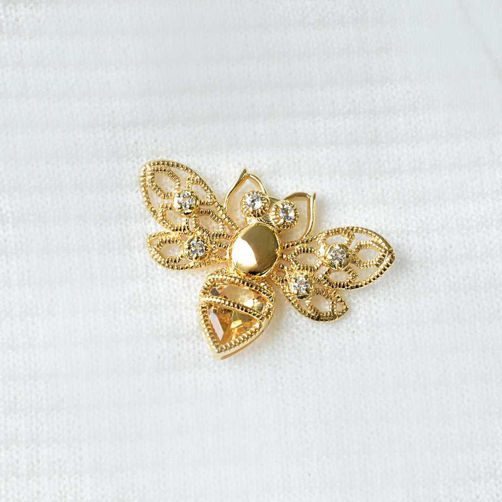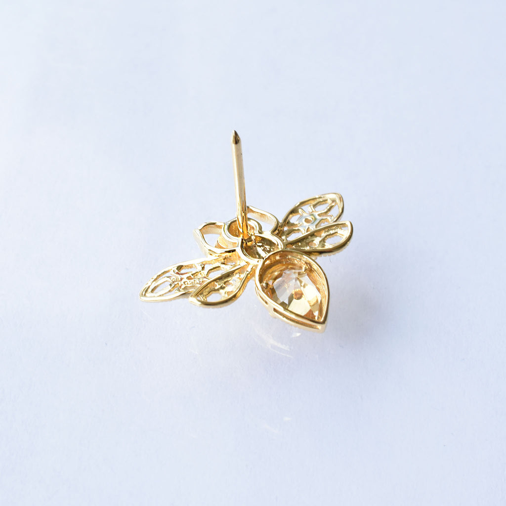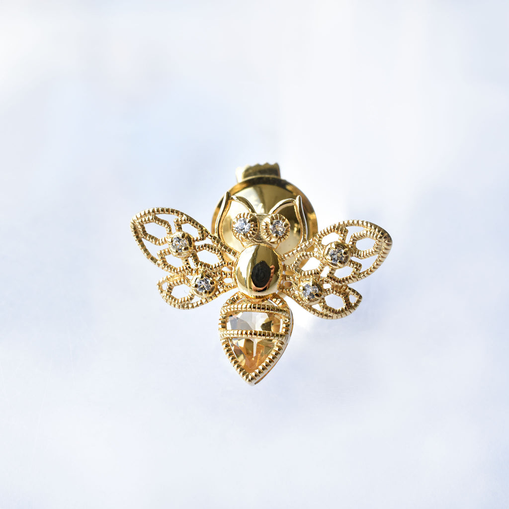 シルバーに金メッキを施し、瞳と羽根にはキラッと輝くホワイトトパーズをセット。腹部には太陽の光を閉じ込めたような温かみのある色合いが魅力的なシトリンをセットしました。