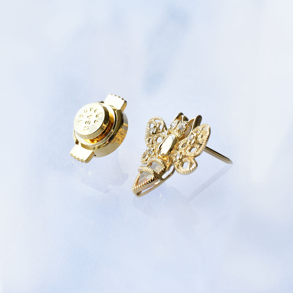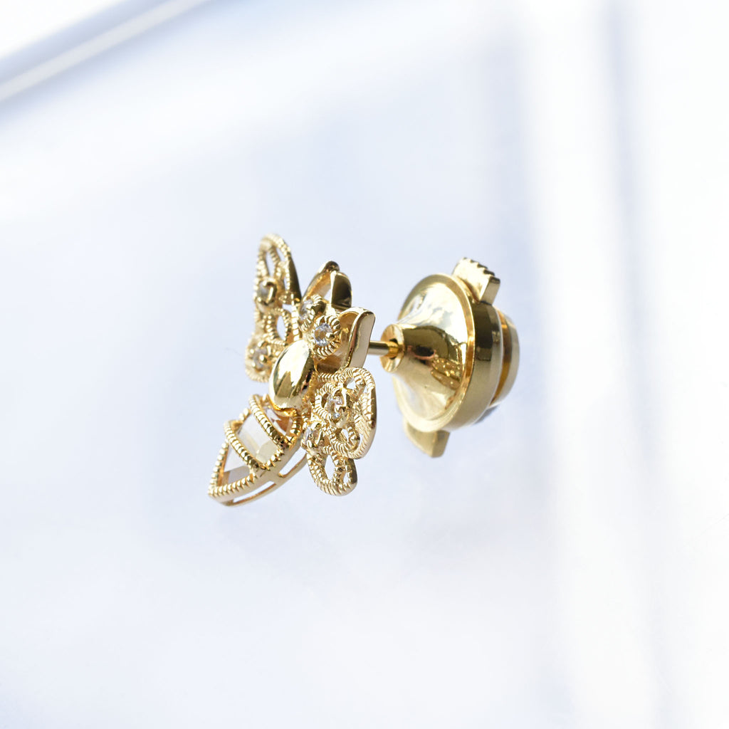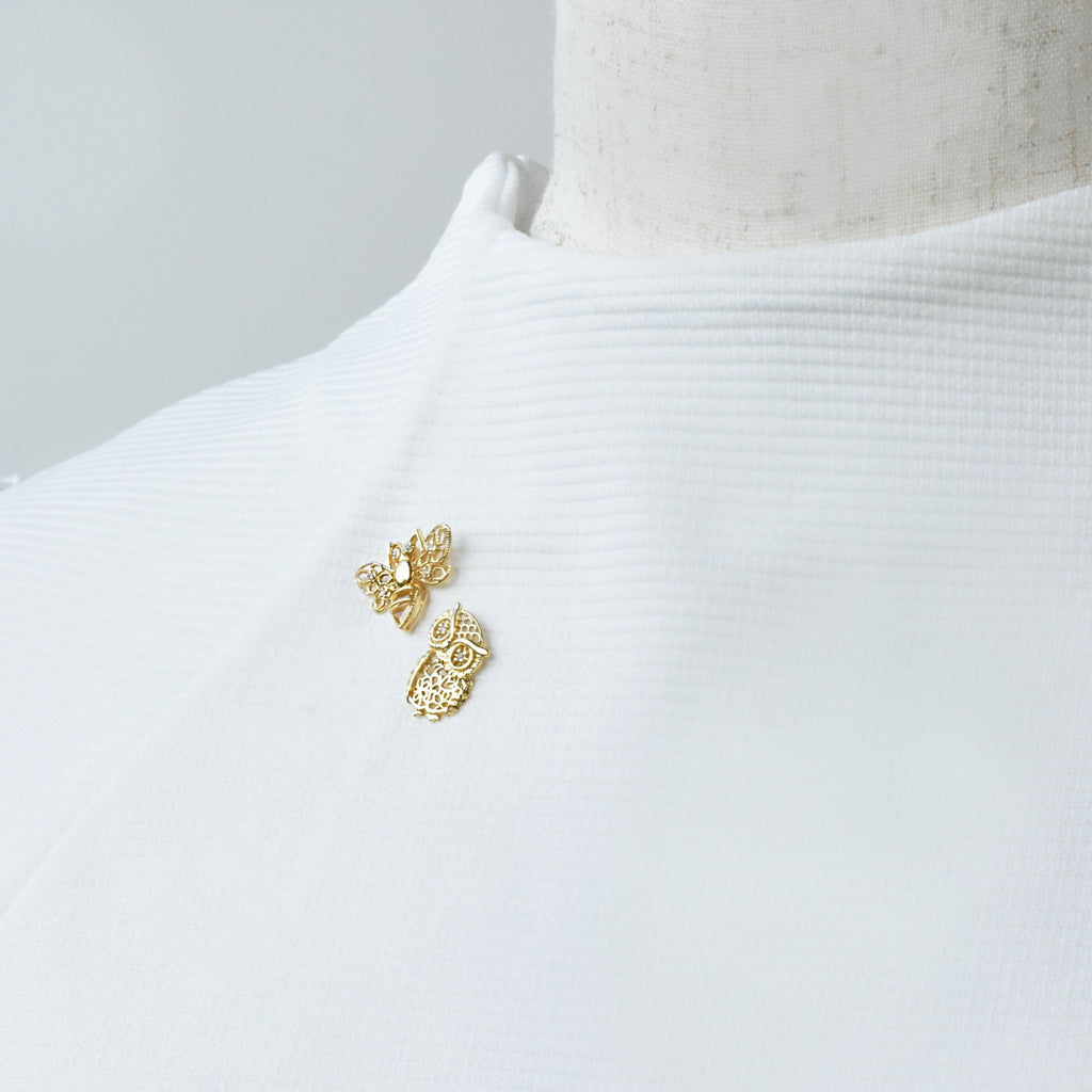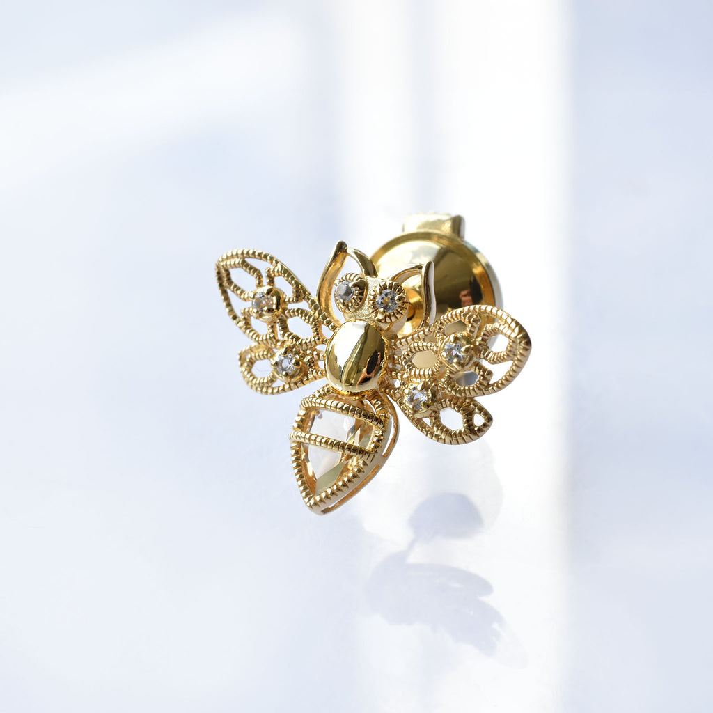 シルバーに金メッキを施し、瞳と羽根にはキラッと輝くホワイトトパーズをセット。腹部には太陽の光を閉じ込めたような温かみのある色合いが魅力的なシトリンをセットしました。