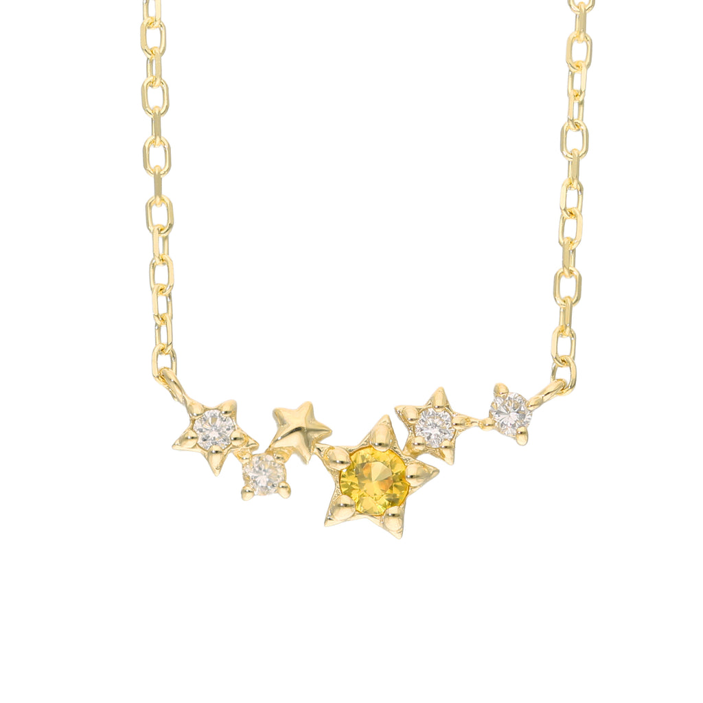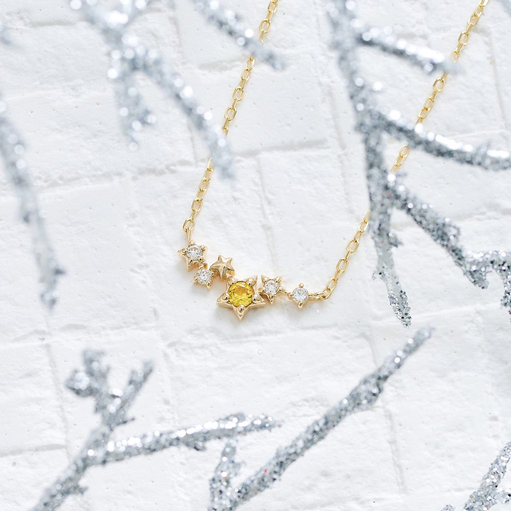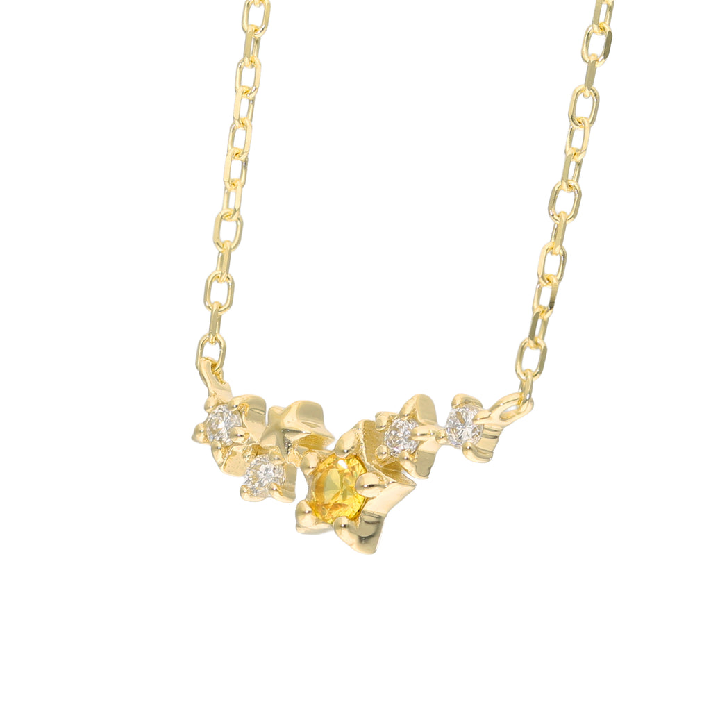 センターの一番大きなスターモチーフには鮮やかな黄色が美しいイエローサファイアをセット。4つの小ぶりなスターモチーフにはメレダイヤをセットしました。