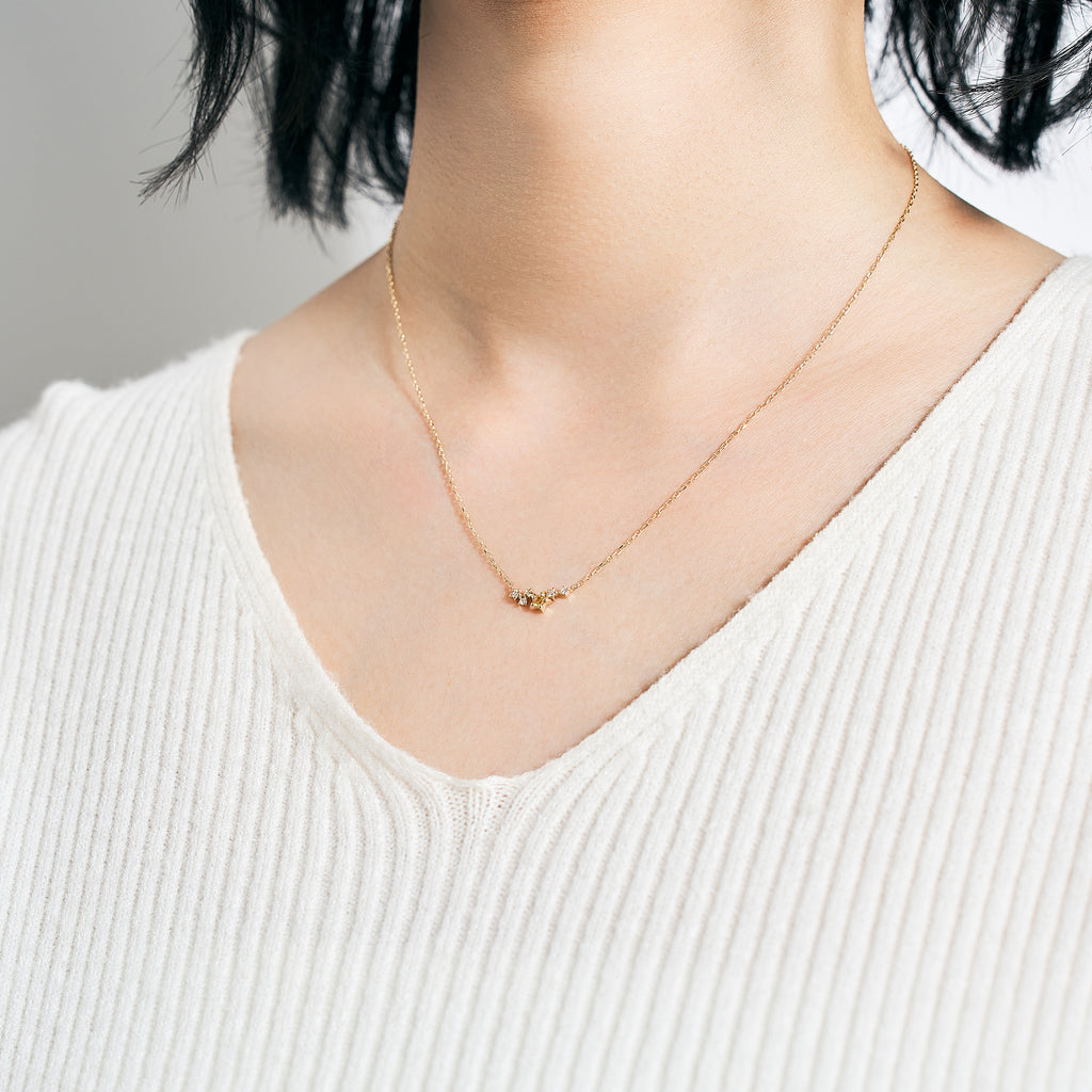ペンダントトップとチェーンを直接繋いだヌーディーなデザインで、大小のスターモチーフとチェーンが胸元でキラキラと繊細な輝きを放つのをお楽しみいただけます。