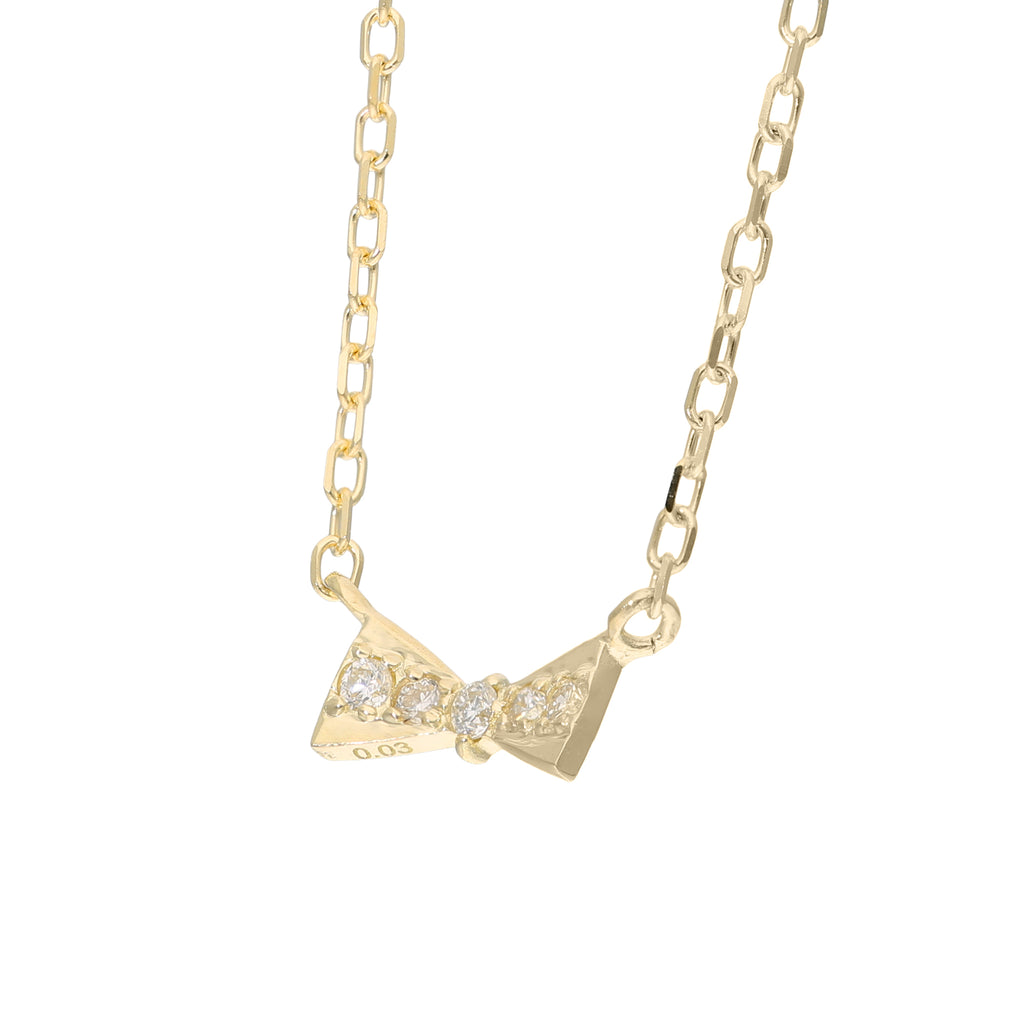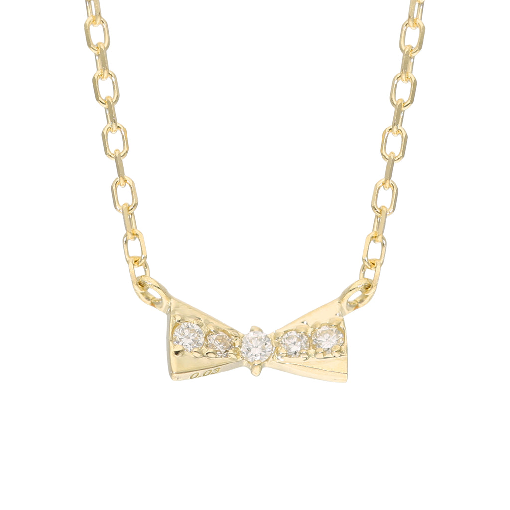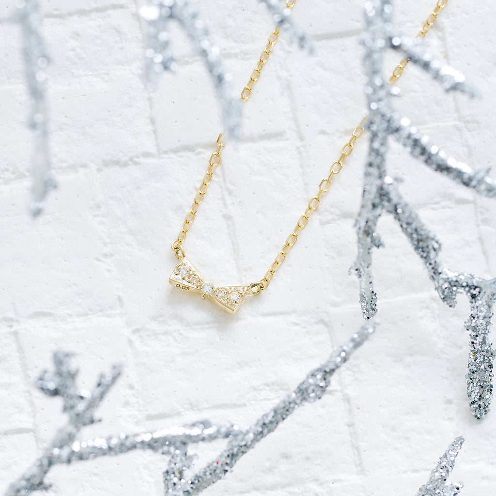 蝶ネクタイのようにこじんまりとキュッと結んだリボンがモチーフ。5石のメレダイヤがキラッと輝いて身に着けた人を輝かせます。
