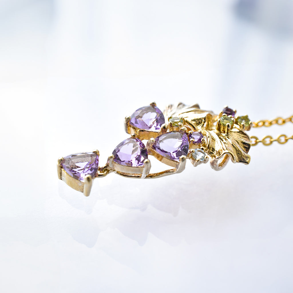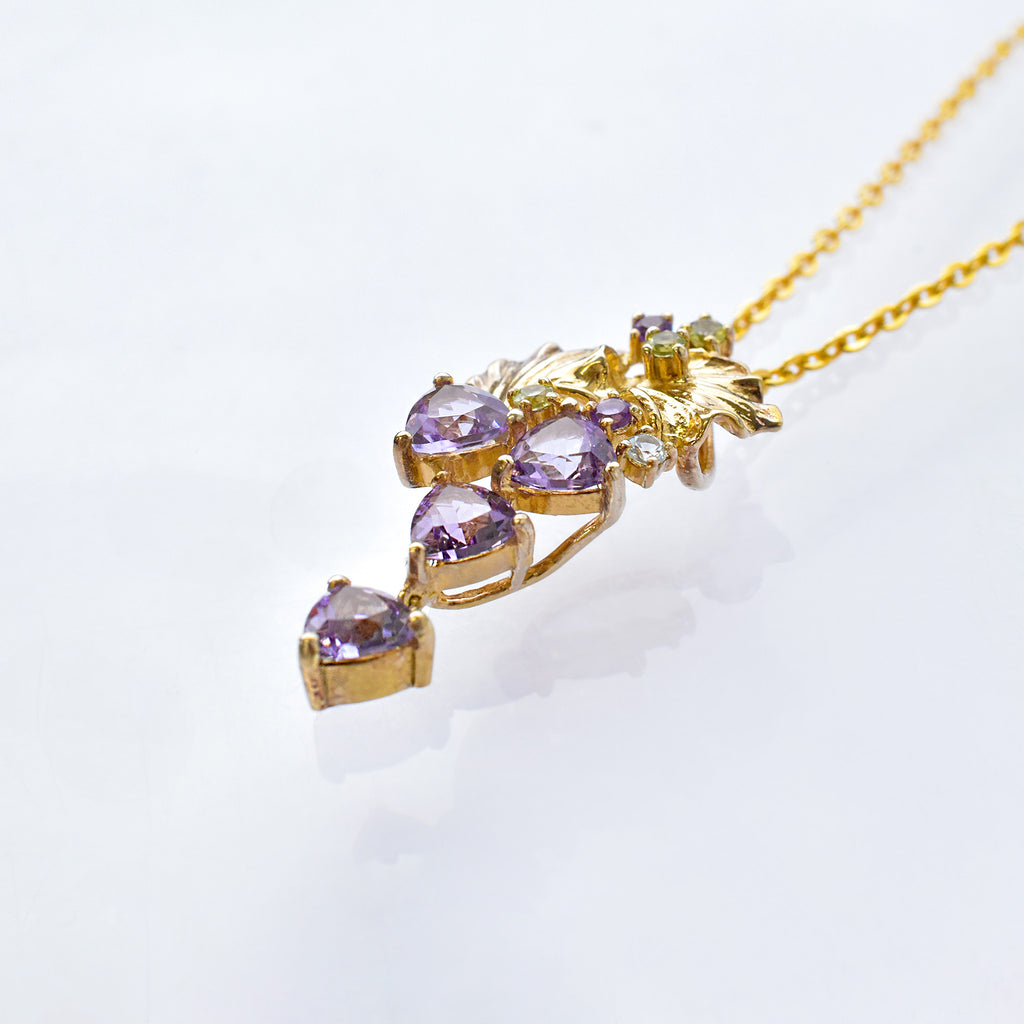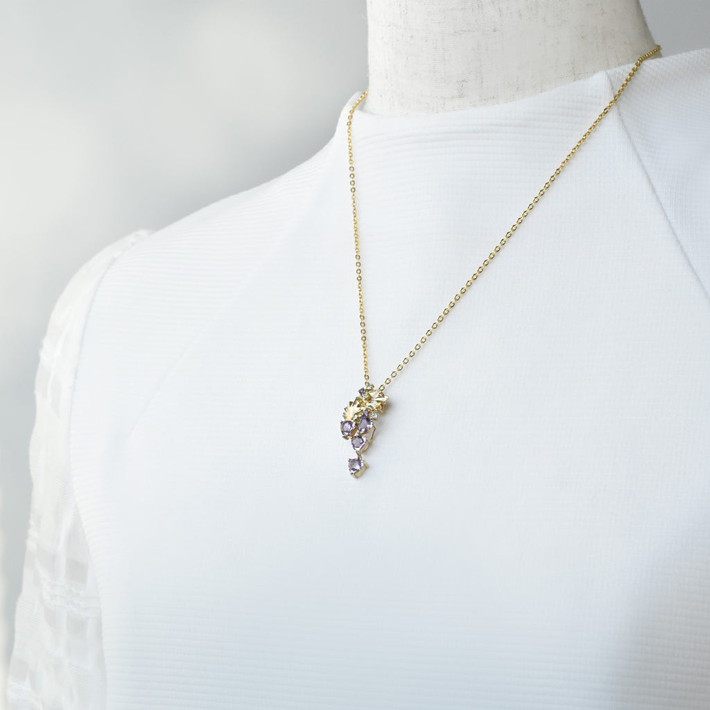 個性的なトリリアントカットのアメシストをブドウの粒に見立てた美したネックレスです。