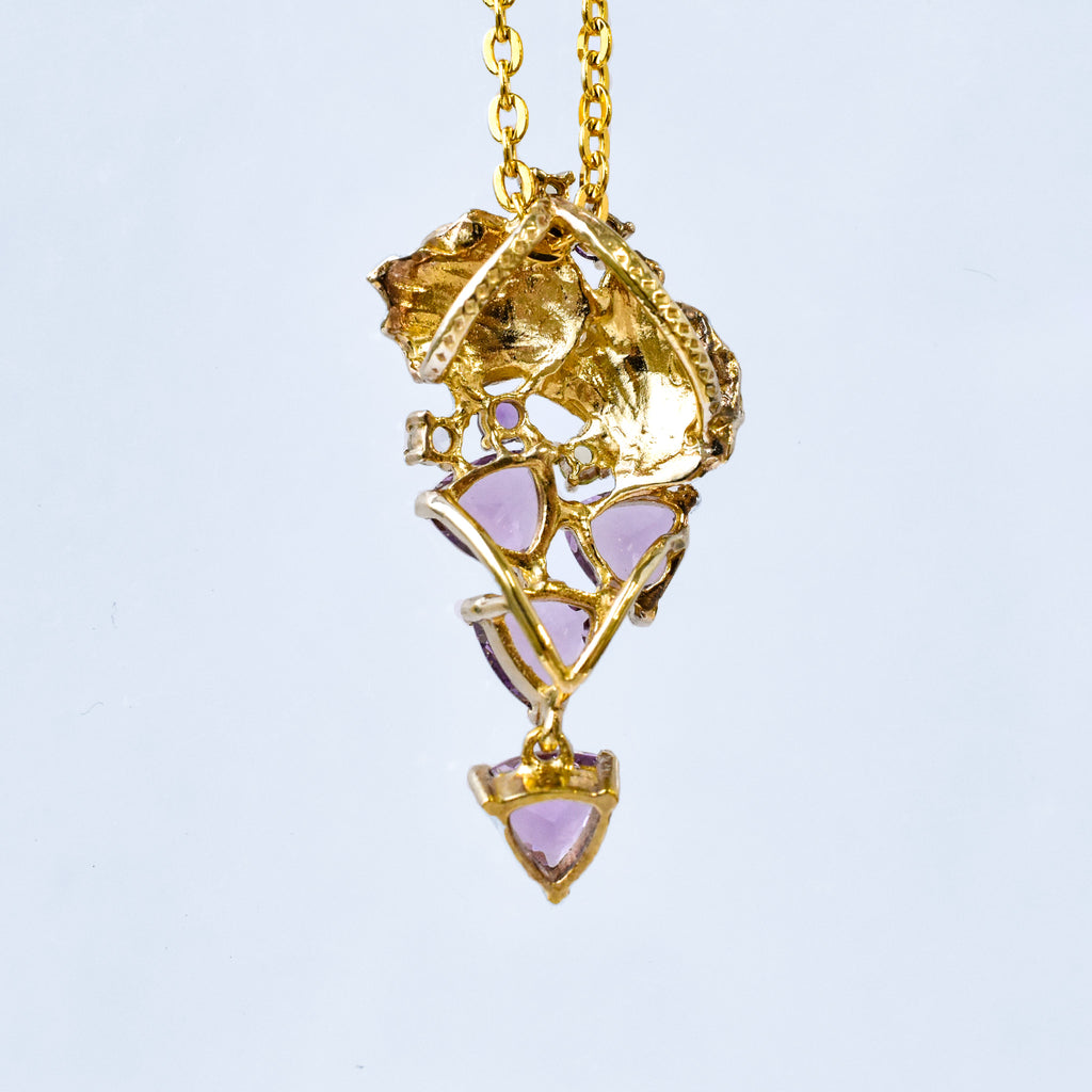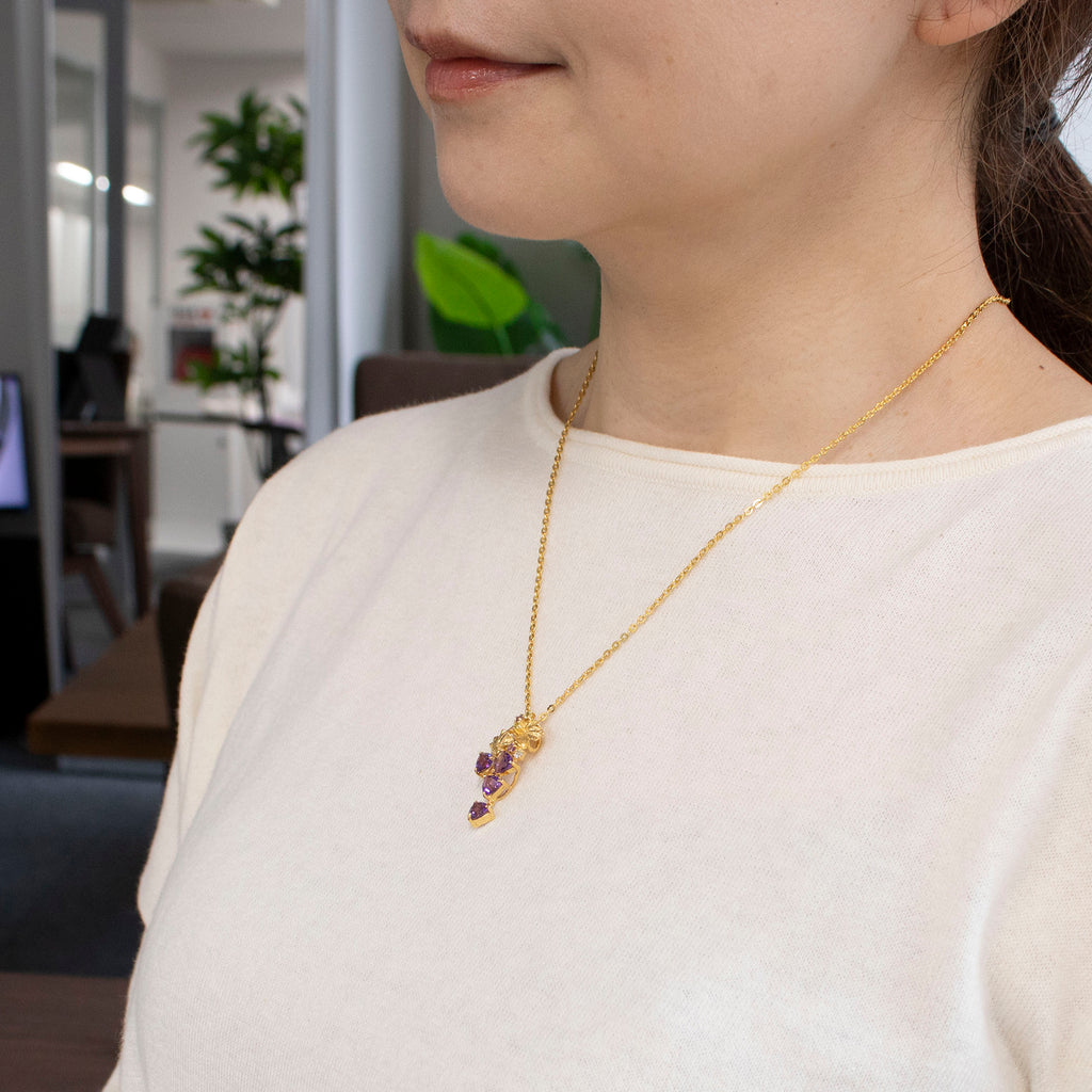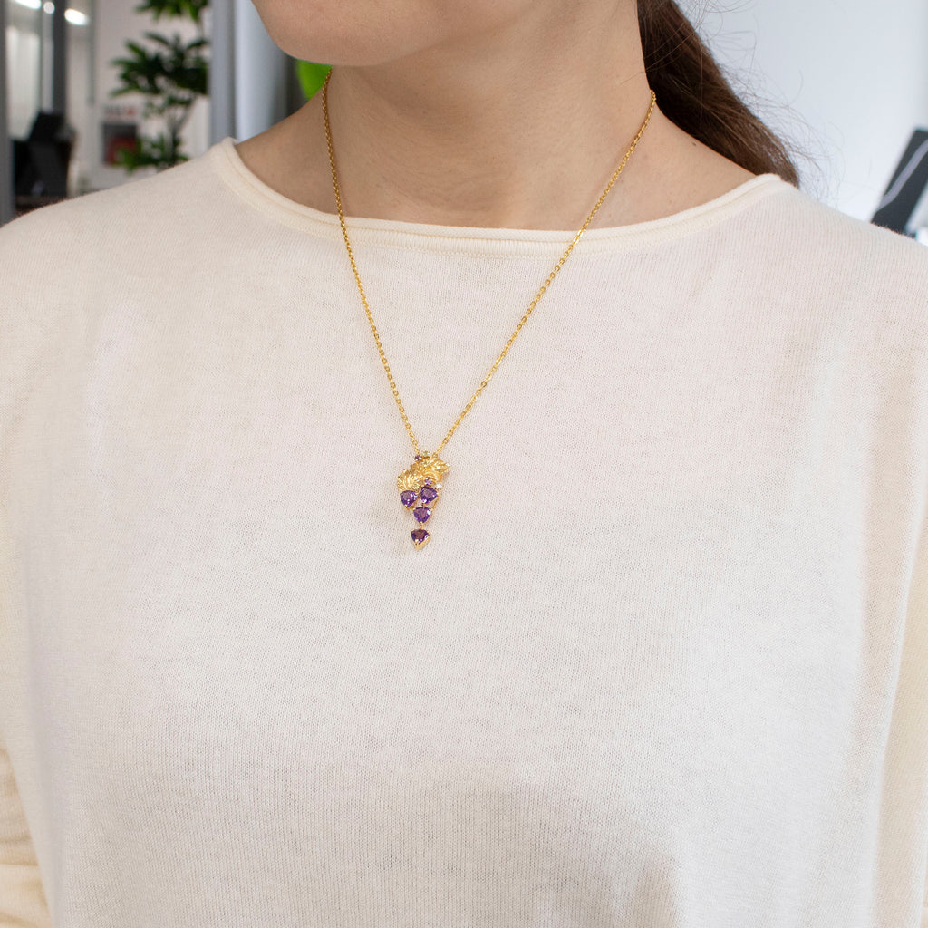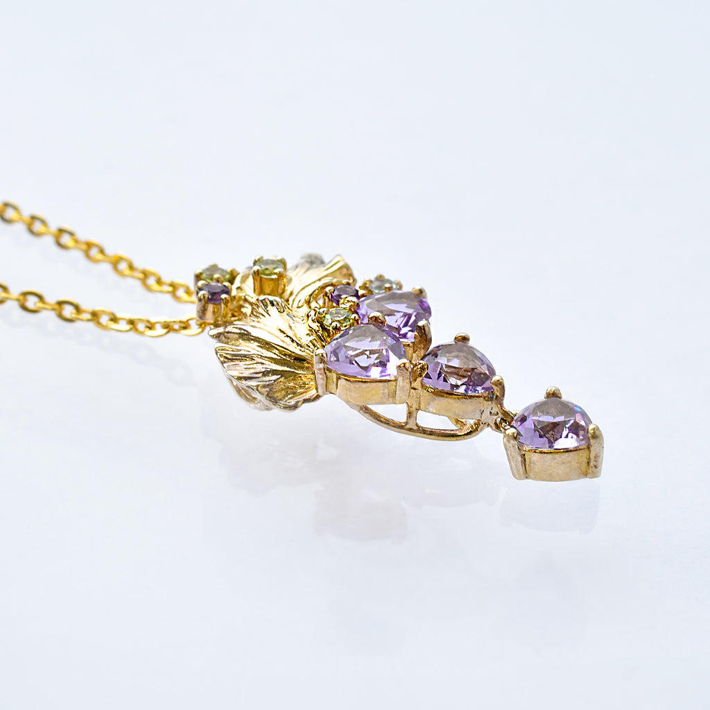 個性的なトリリアントカットのアメシストをブドウの粒に見立てた美したネックレスです。