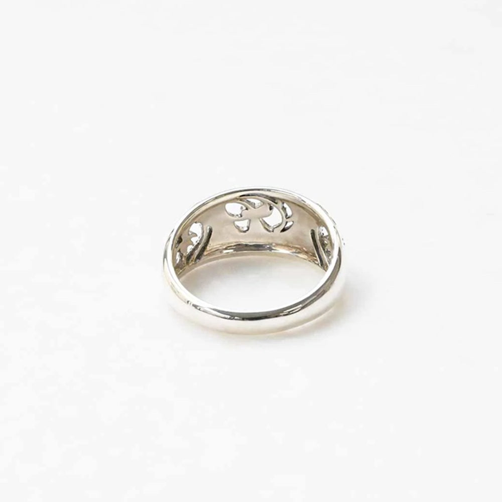 つややかに磨き上げた鏡面仕上げのシルバーのリングにレースのように繊細なオープンワークを施しました。