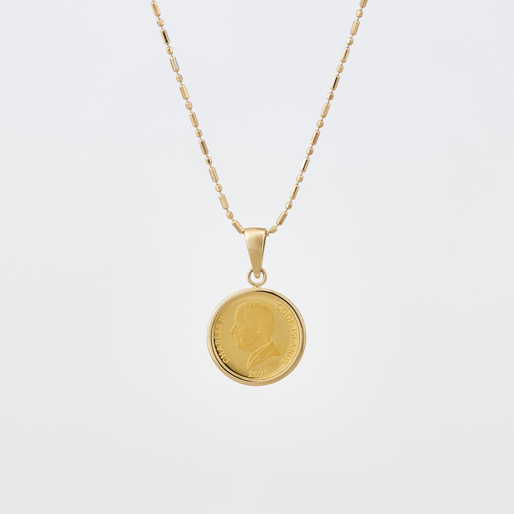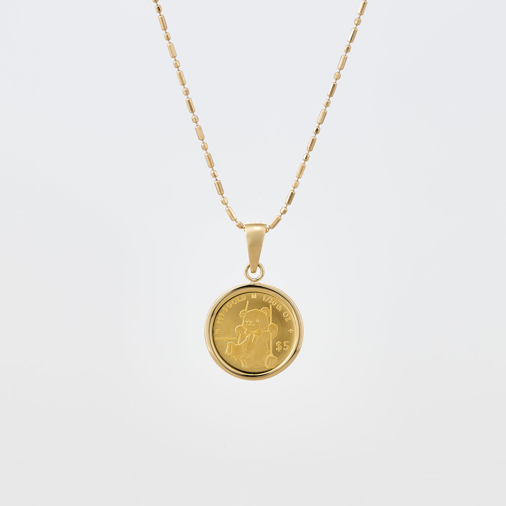 その可愛らしさが世界中で愛されているテディベアをデザインしたコインを、いつも身に着けて楽しめるペンダントトップに加工しました。