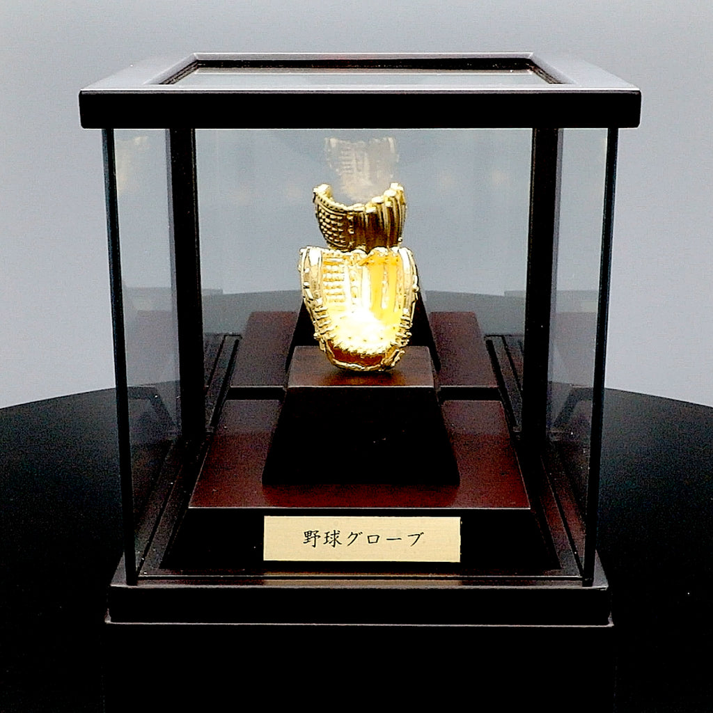 専用のガラスケースの背面側内側には鏡が張り付けてあり、純金製のグローブの裏側を鏡に映してご覧いただくことができます。