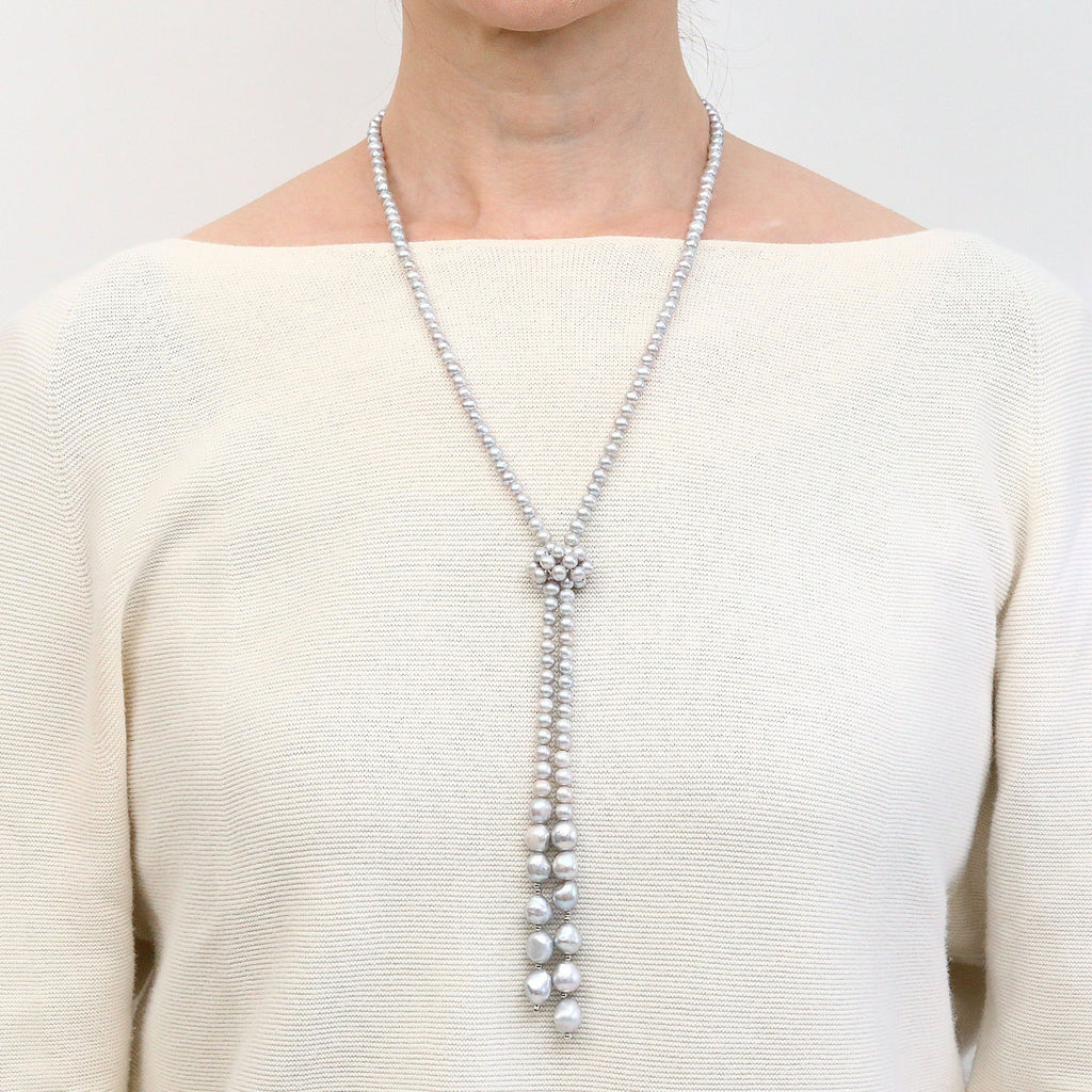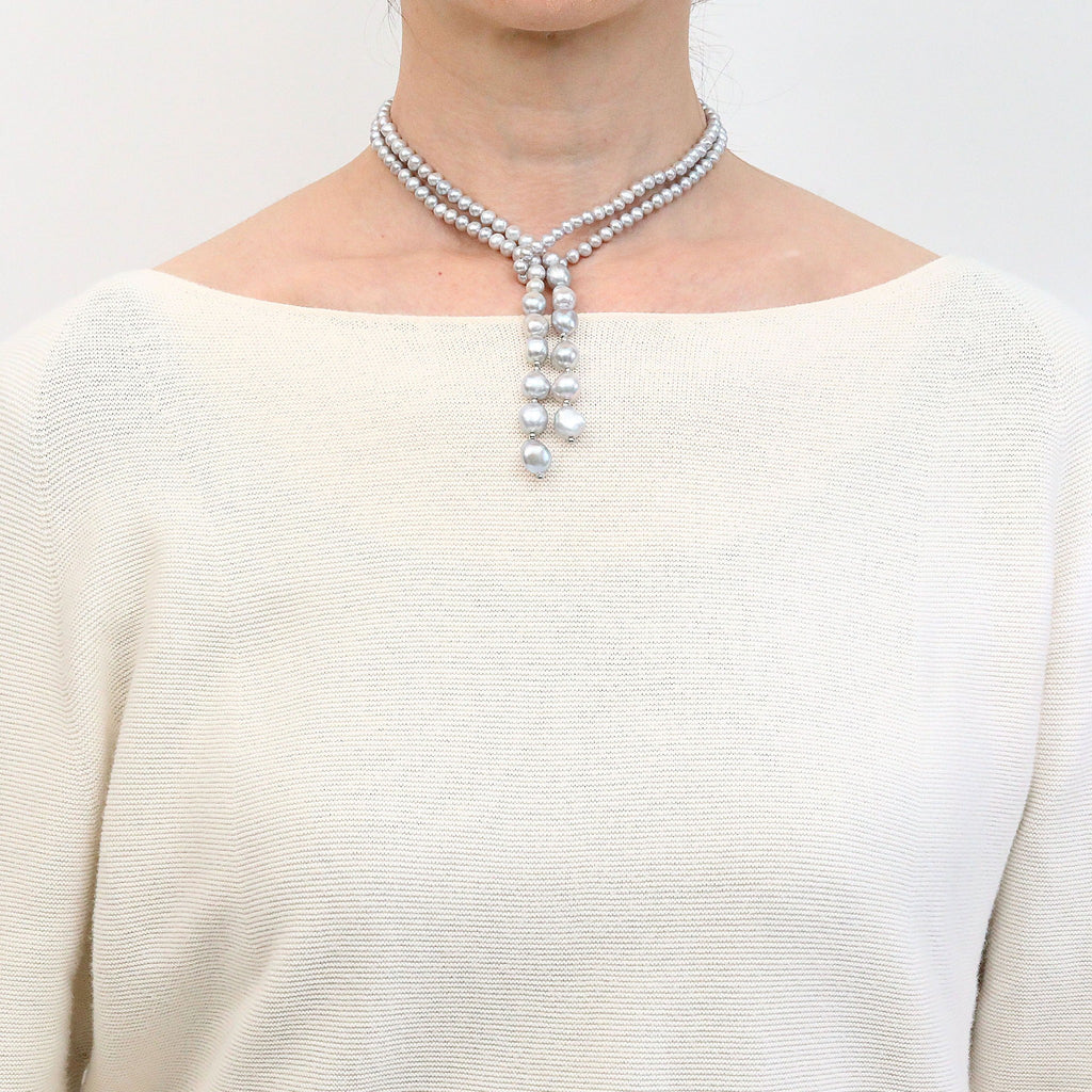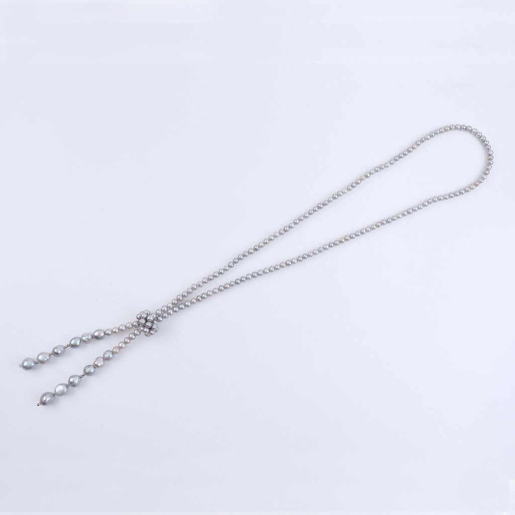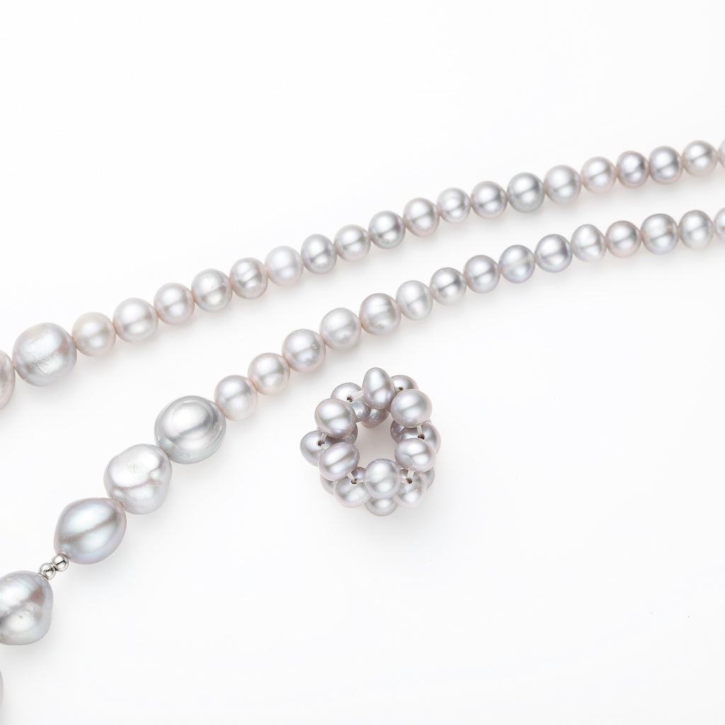 上品なグレー系カラーに染められた淡水パールを全長約90cmのロングネックレスに仕立てました。