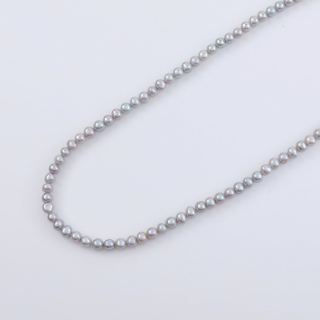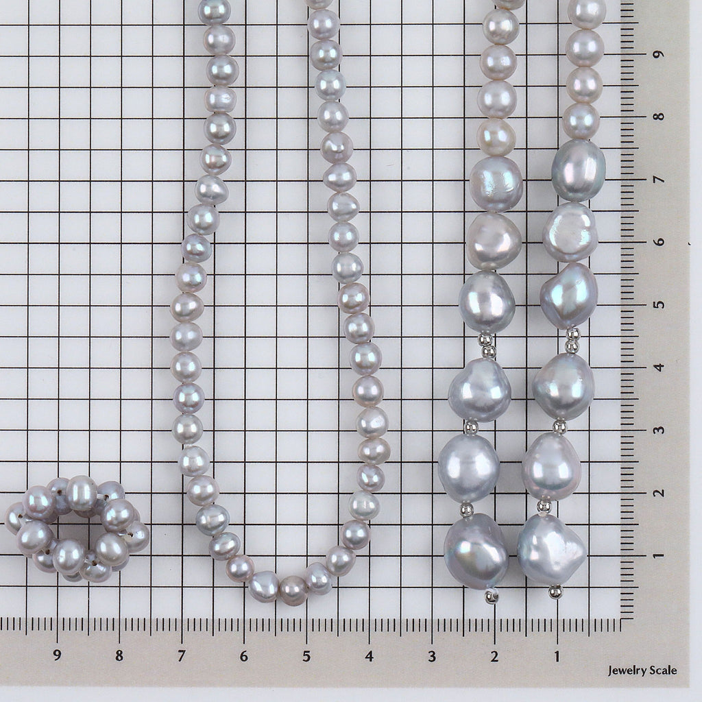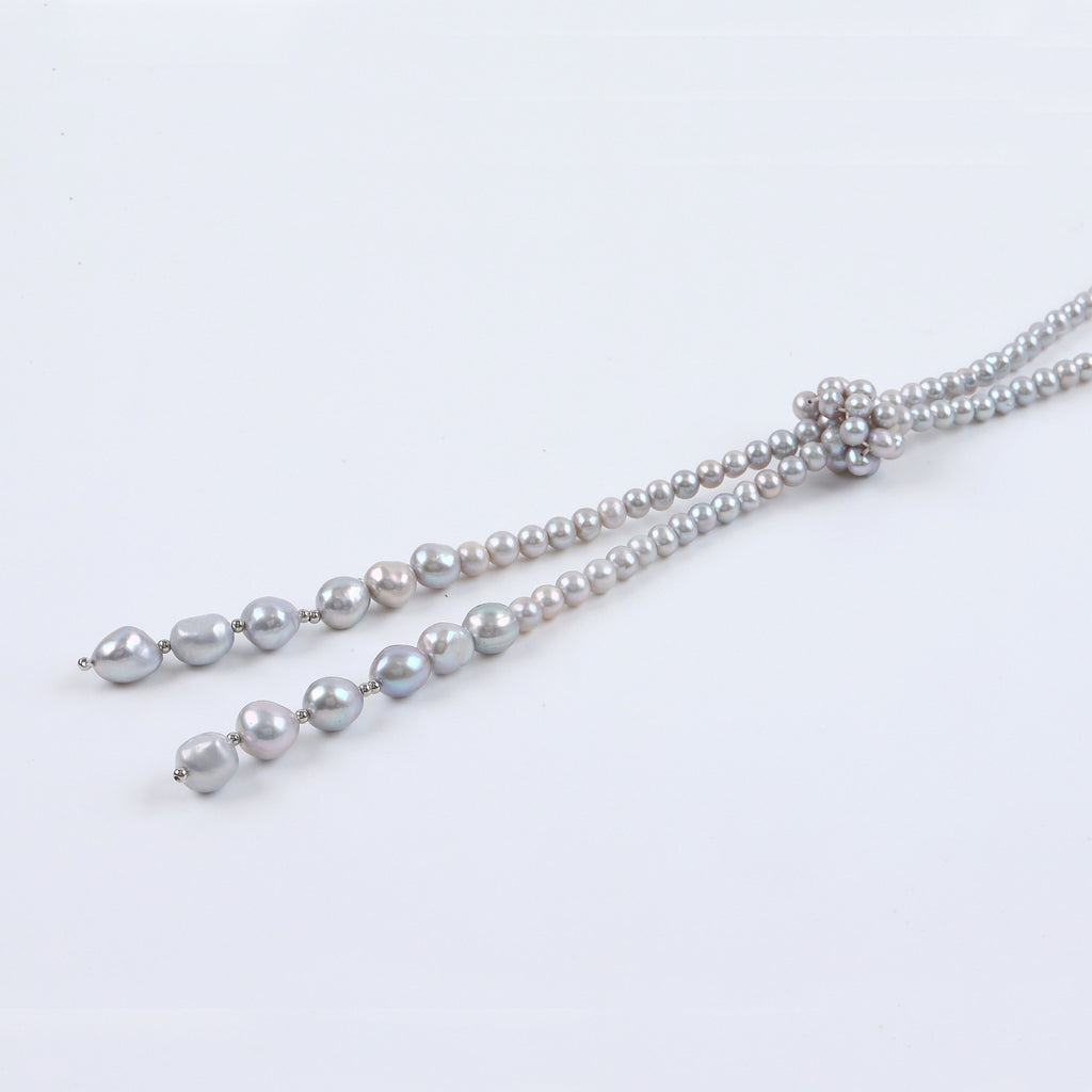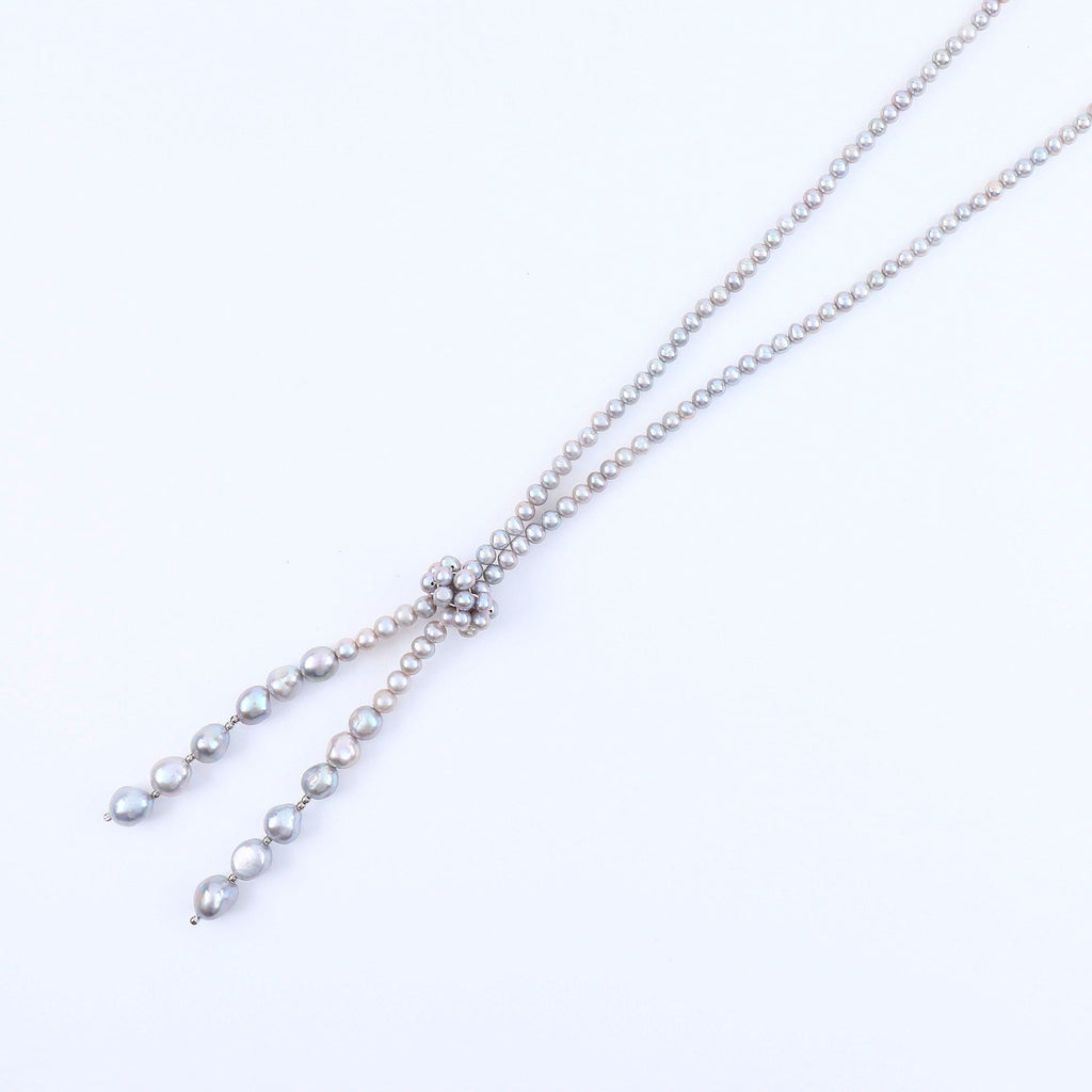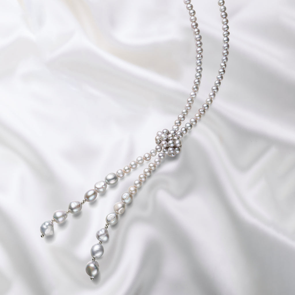 上品なグレー系カラーに染められた淡水パールを全長約90cmのロングネックレスに仕立てました。