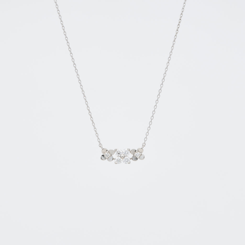 中央のクローバーには4枚の葉それぞれにメレダイヤが留めてあり、その左右のクローバーは中央に1石メレダイヤを留めてあります。ダイヤの輝きとプラチナの光沢感のバランスがよいデザインです。