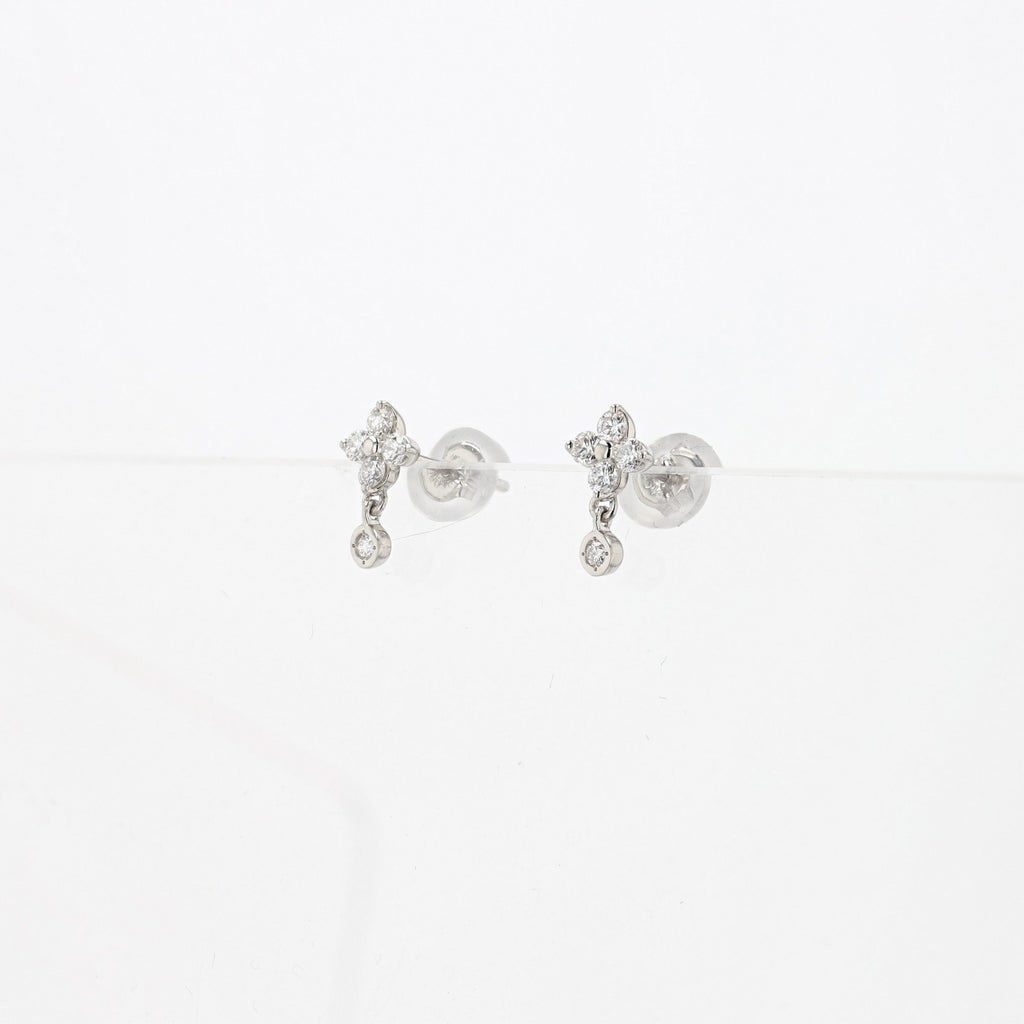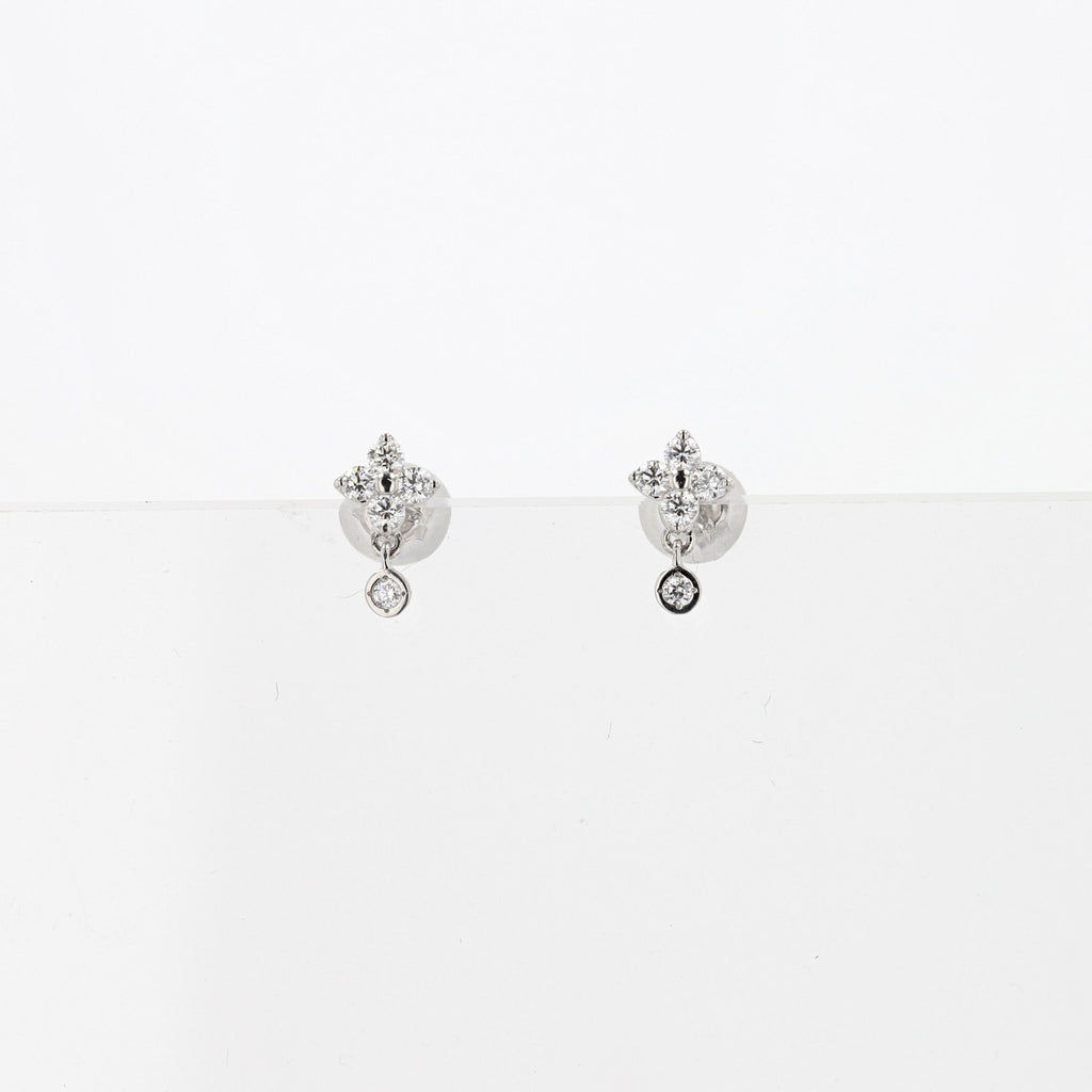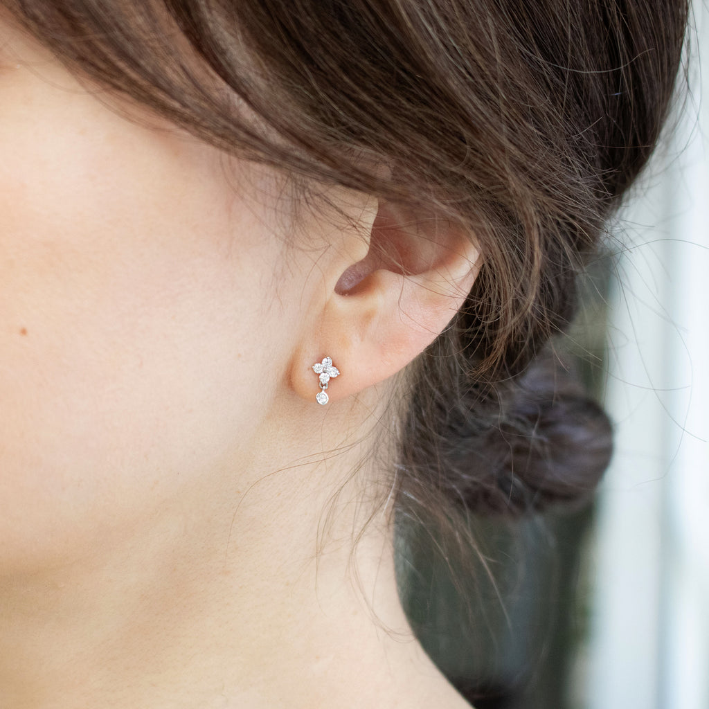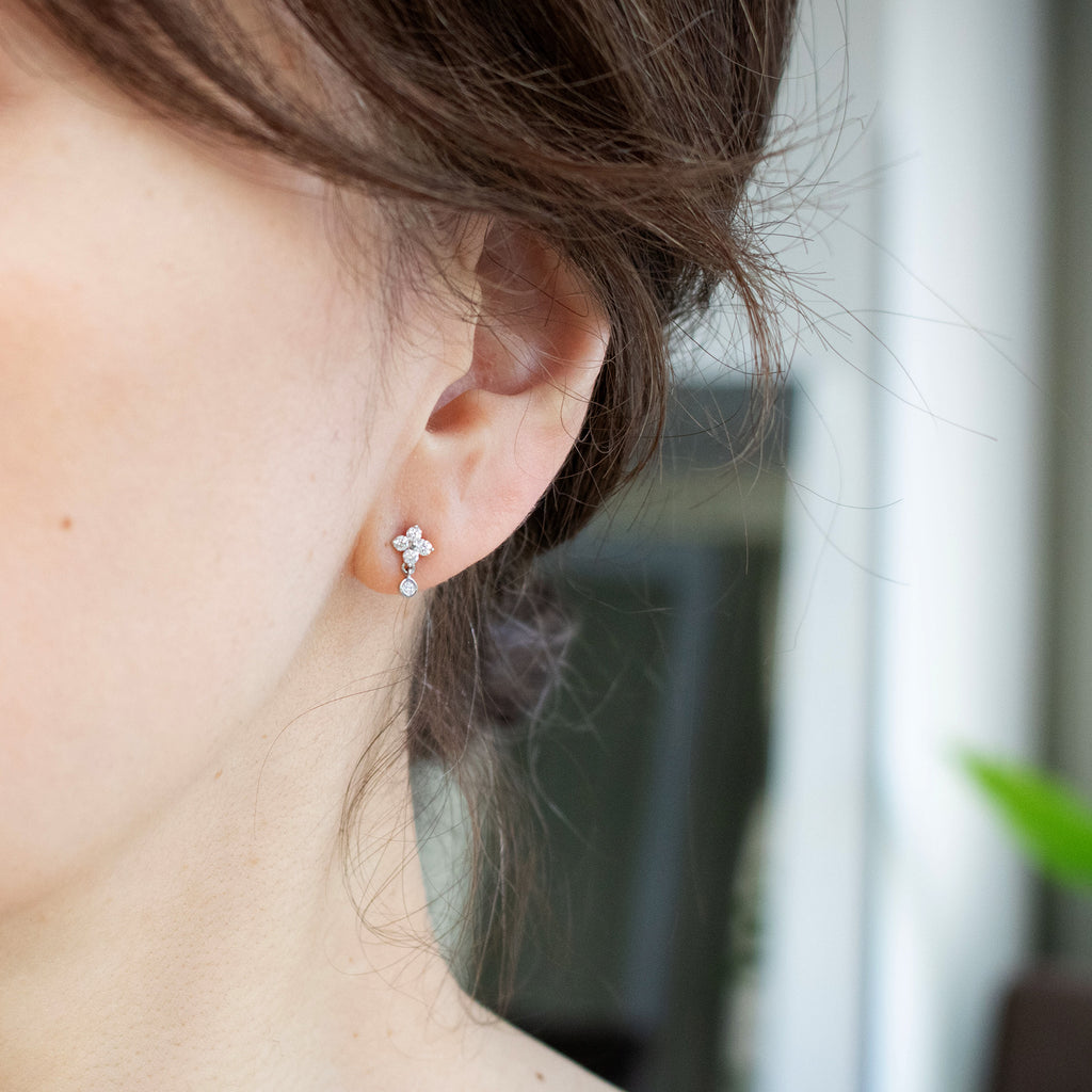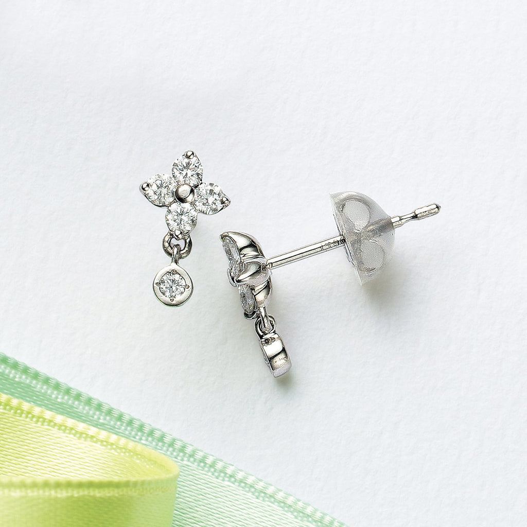 四つ葉のクローバーモチーフの下にはメレダイヤを1石丸環で留めてあり、身に着けた人の動きに合わせて小さく揺れて輝きを放ちます。
